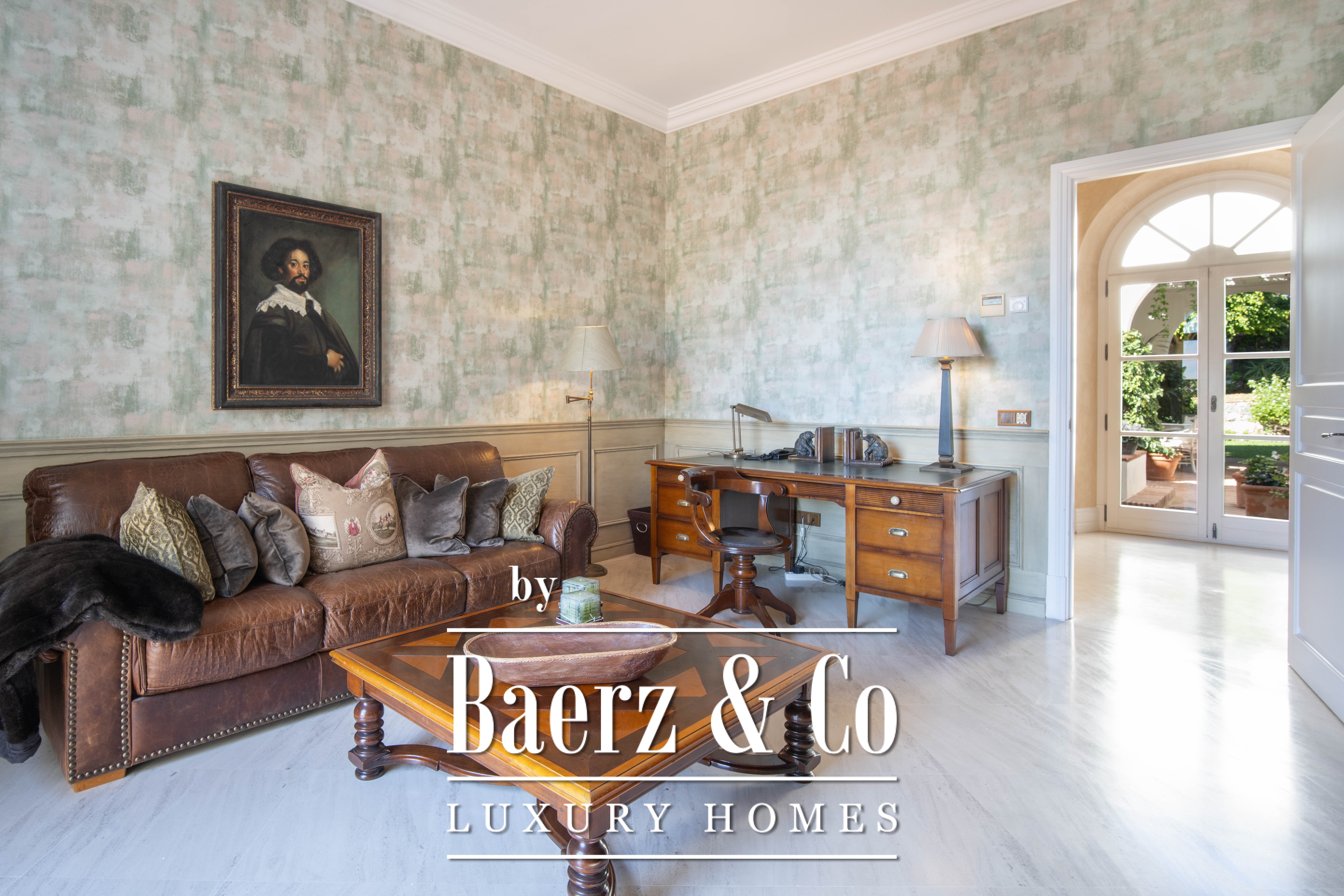 Natural light flows through generous living spaces, from the porcelain-floored living room with fireplace to the formal dining area, office, and guest apartment. A fully fitted kitchen and meticulous furnishing elevate daily living. Covered and open terraces provide a seamless transition outdoors, where a private heated pool is framed by landscaped gardens, and views encompass the sea, mountains, and mature greenery.