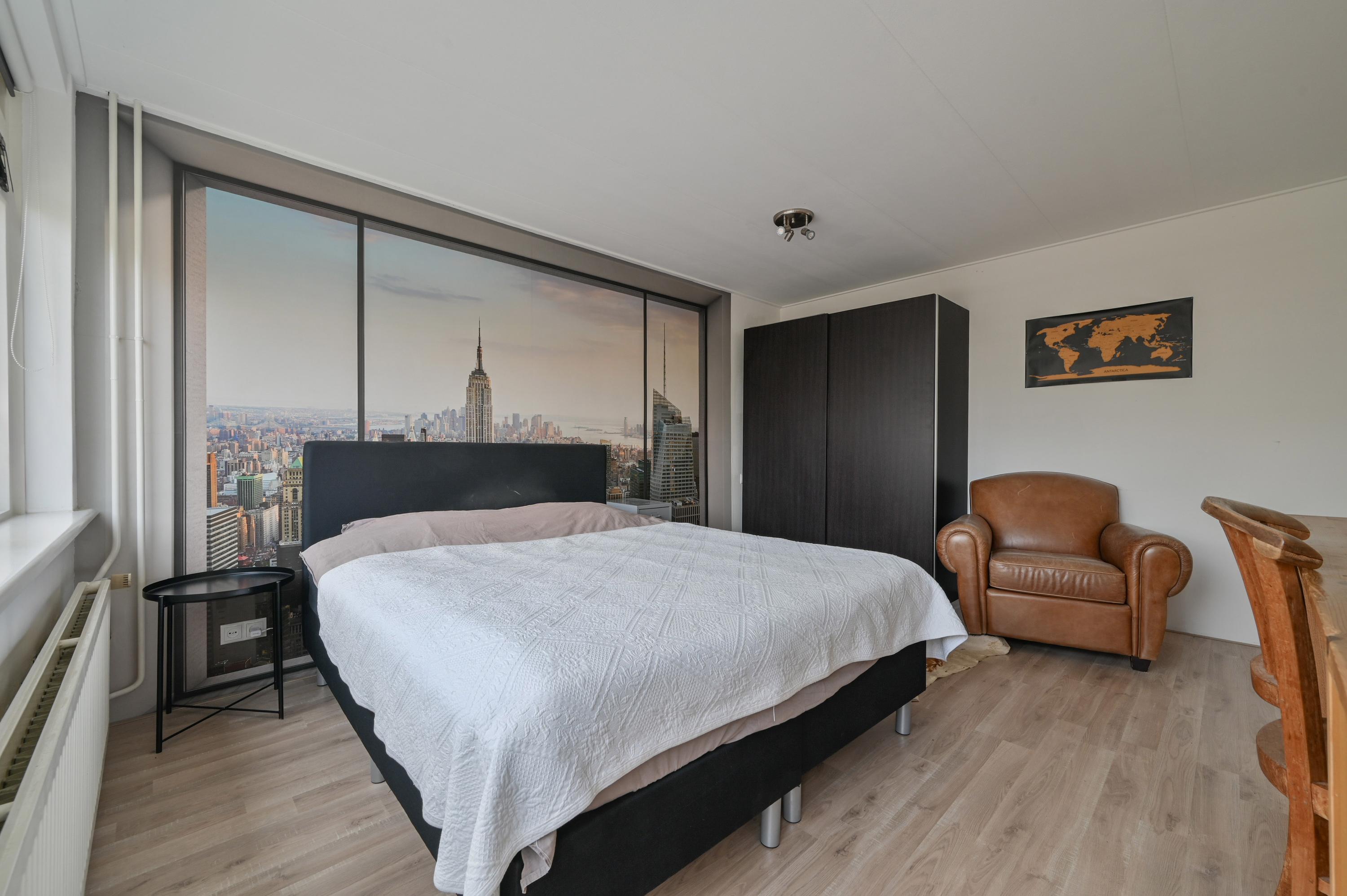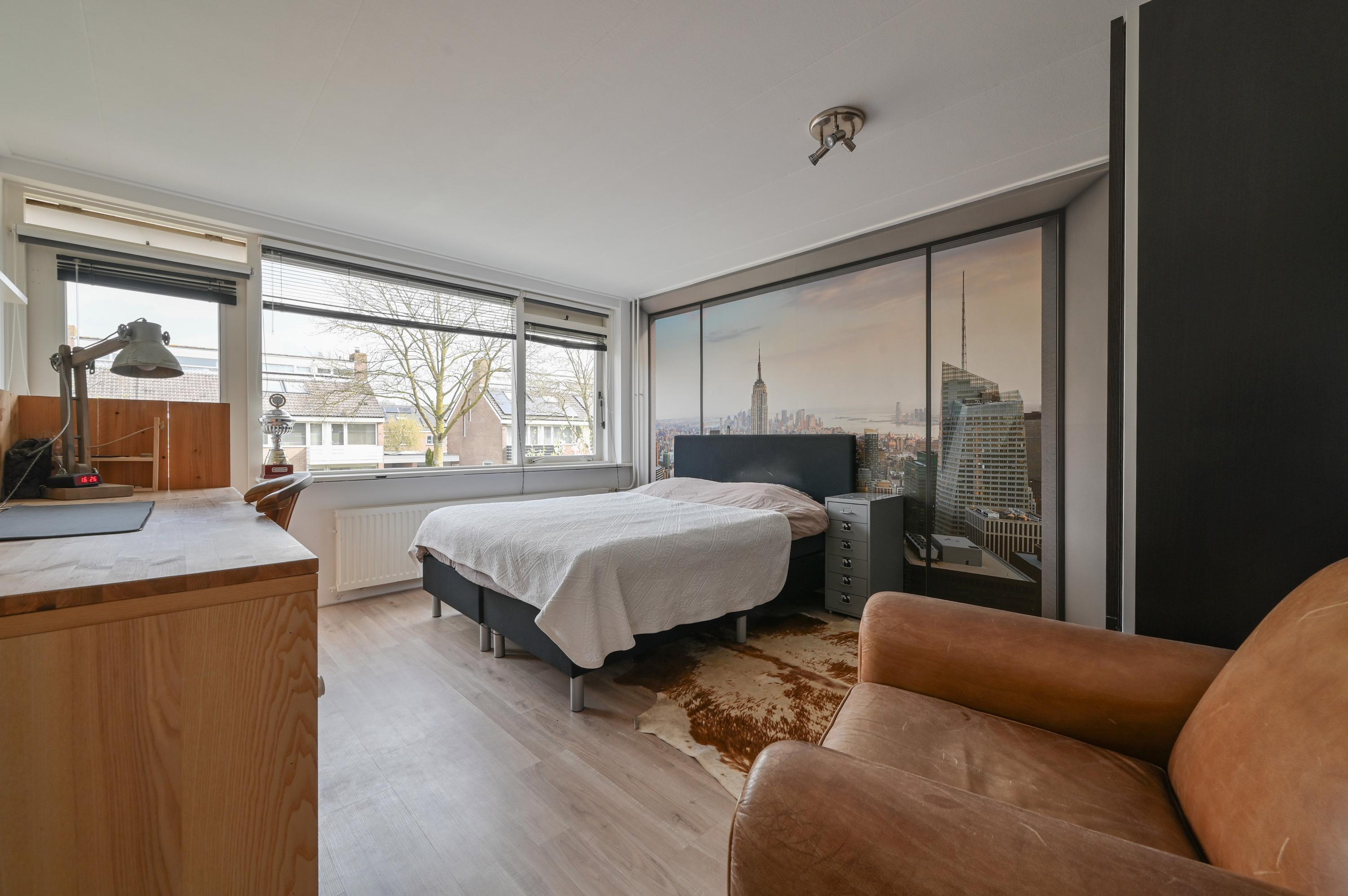 At the rear is a generous bedroom with a full-length built-in wardrobe. An extra insulated wall towards the adjacent room ensures peace and privacy, making this a comfortable and quiet master bedroom.