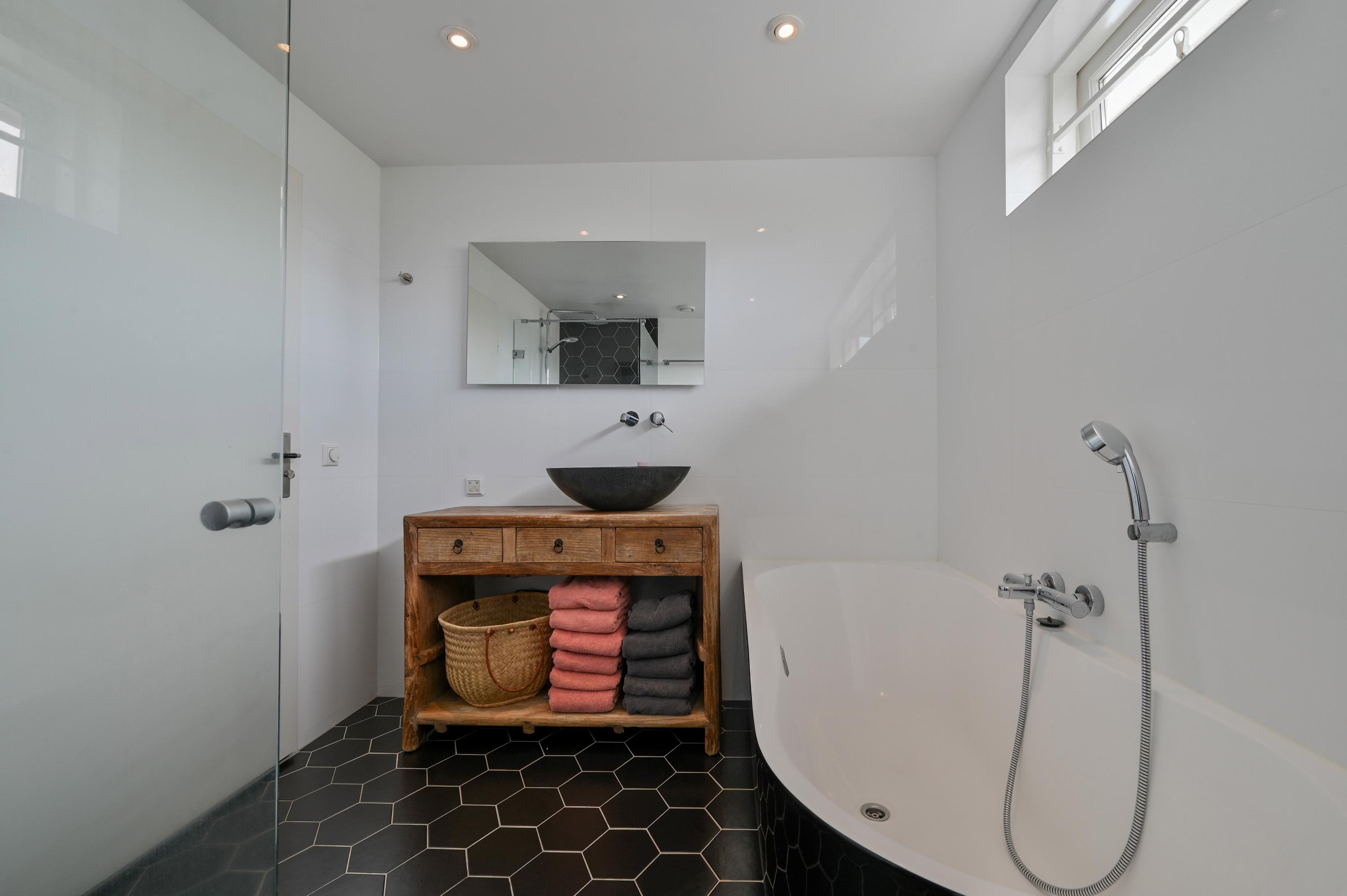 The bathroom is well-appointed and generously sized. The floor features underfloor heating for added comfort. It includes a bathtub, toilet, walk-in shower with glass door, and both a rain shower and hand shower. The vanity unit with mirror and infrared panel adds a modern and practical touch.