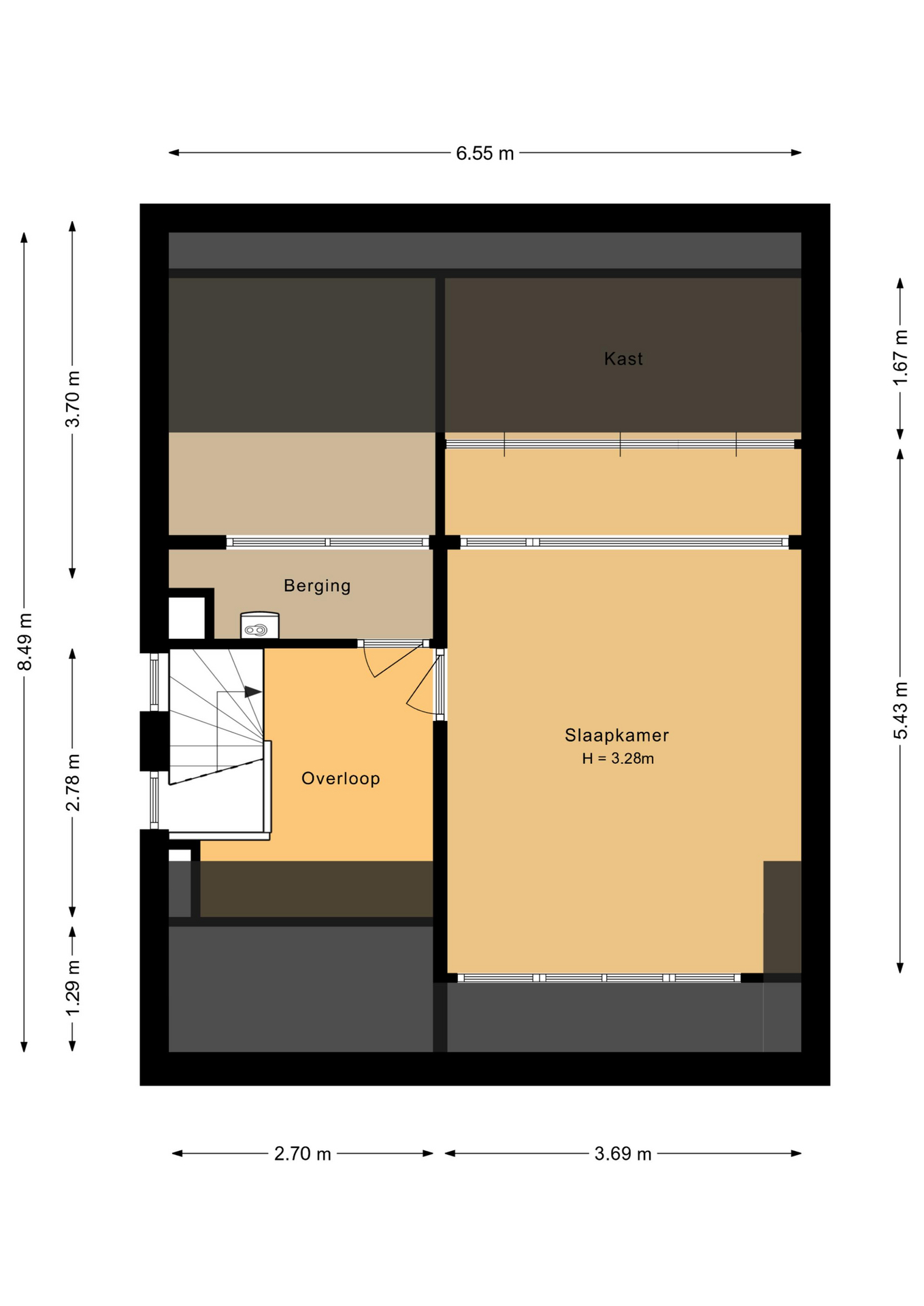 The second floor is surprisingly spacious and bright. The landing is generously sized and ideal for use as a workspace or home office. Thanks to the windows in the stairwell, there is an abundance of natural light, creating an open and pleasant atmosphere.