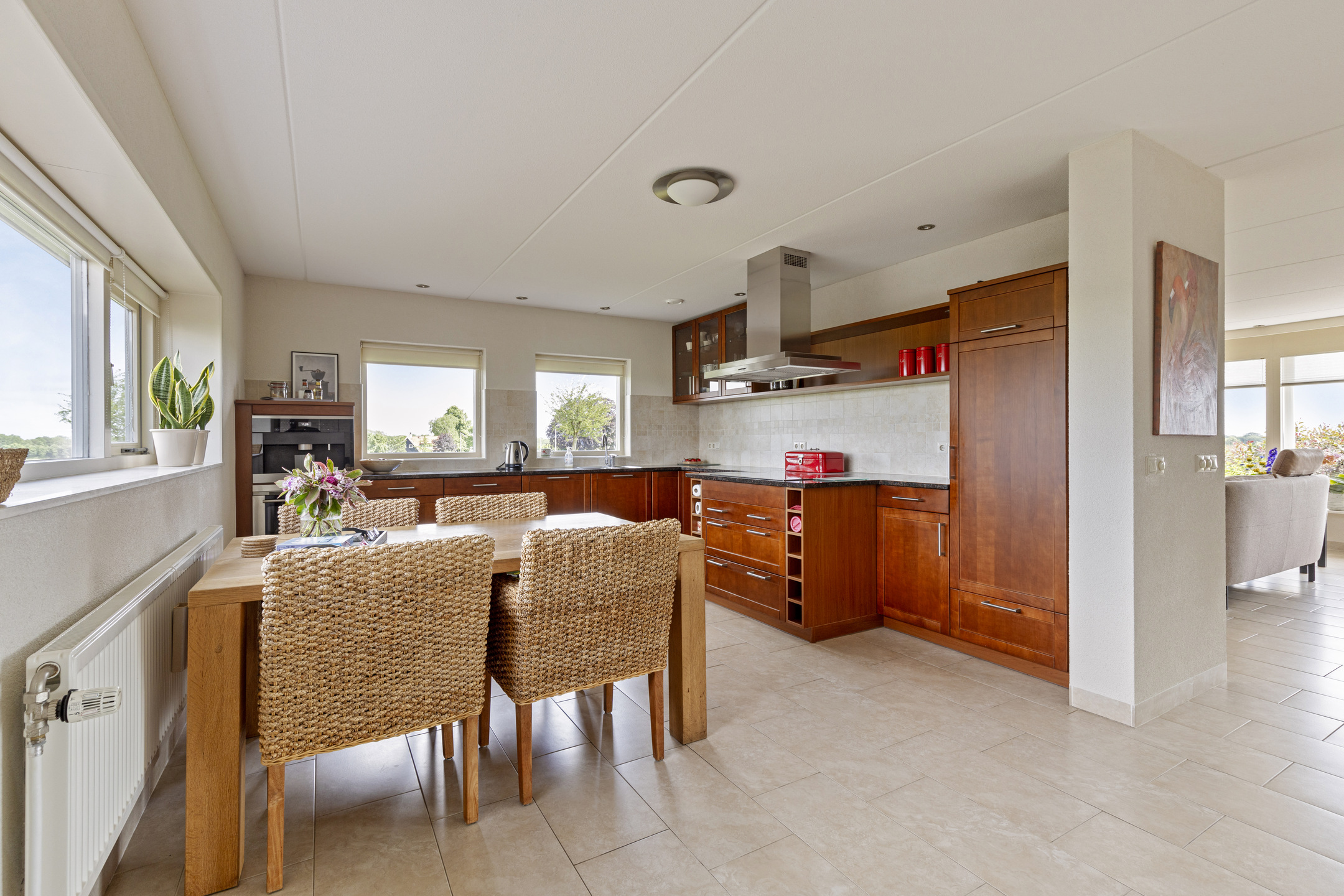 The kitchen is open, but because of its location in the program, overlooking the garden and the historic ash landscape, it has an atmosphere all its own. The fronts are walnut and the granite countertop is primal. Everything is there, from all desirable built-in appliances like dishwasher, fridge-freezer and combination microwave to a Miele coffee maker that will have you whipping up coffee, cappuccino, latte and tea in no time.
