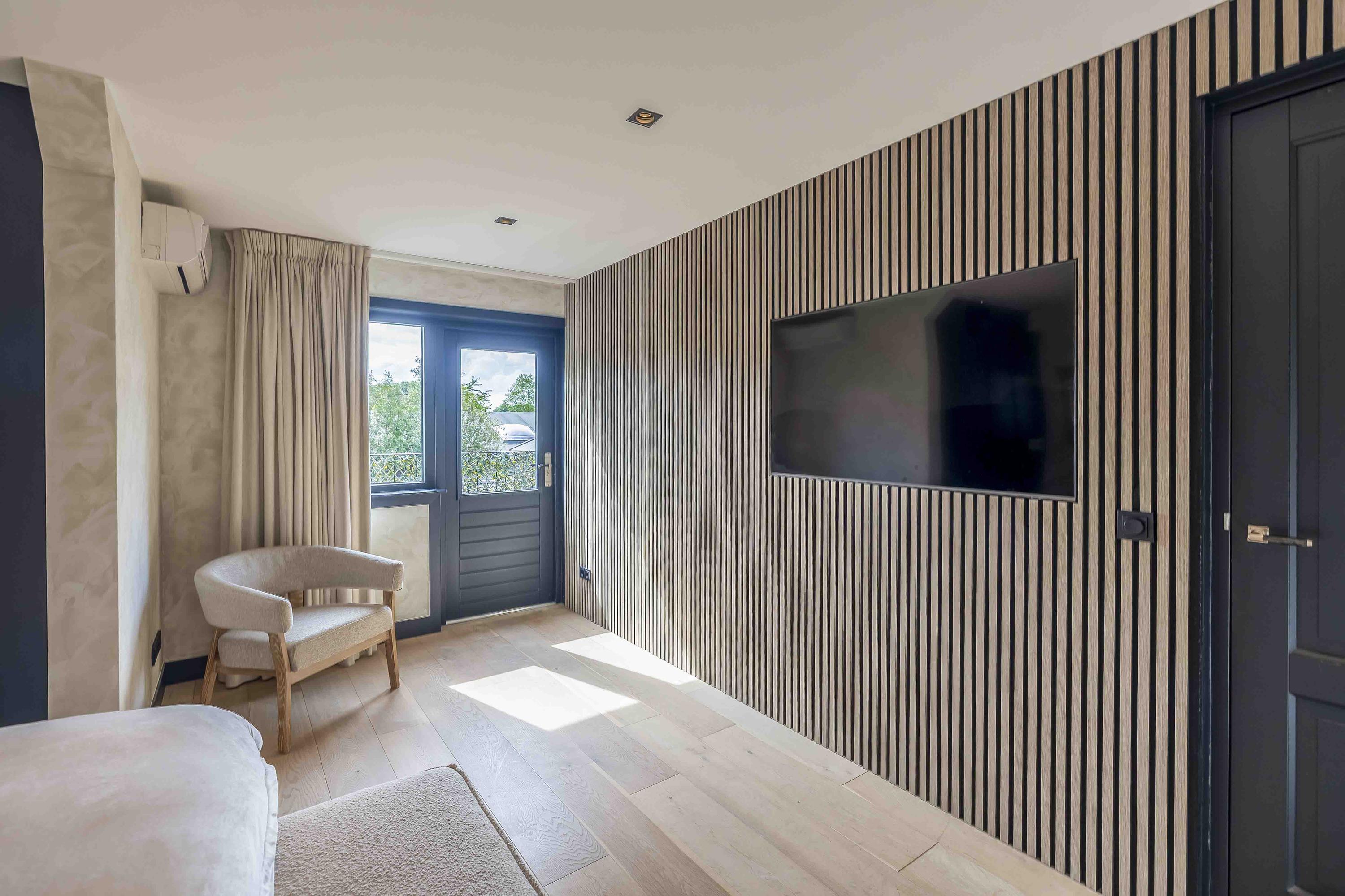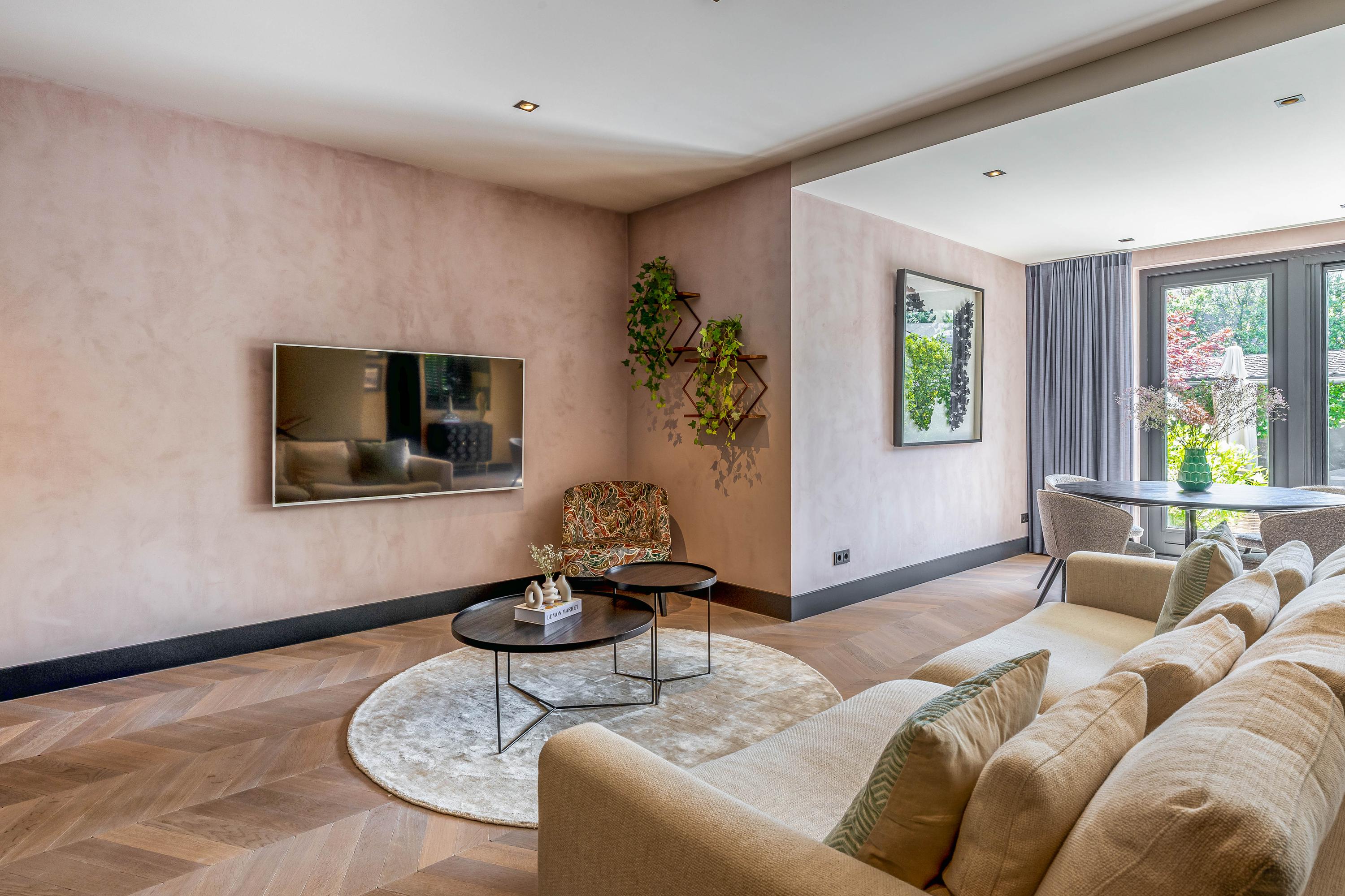 De riante woonkamer ademt rust en klasse dankzij een stijlvolle wandafwerking, een prachtige vloer in Hongaarse punt en openslaande deuren naar de tuin. De grote raampartijen zorgen voor een natuurlijke lichtinval, wat bijdraagt aan de warme, uitnodigende ambiance van het huis.