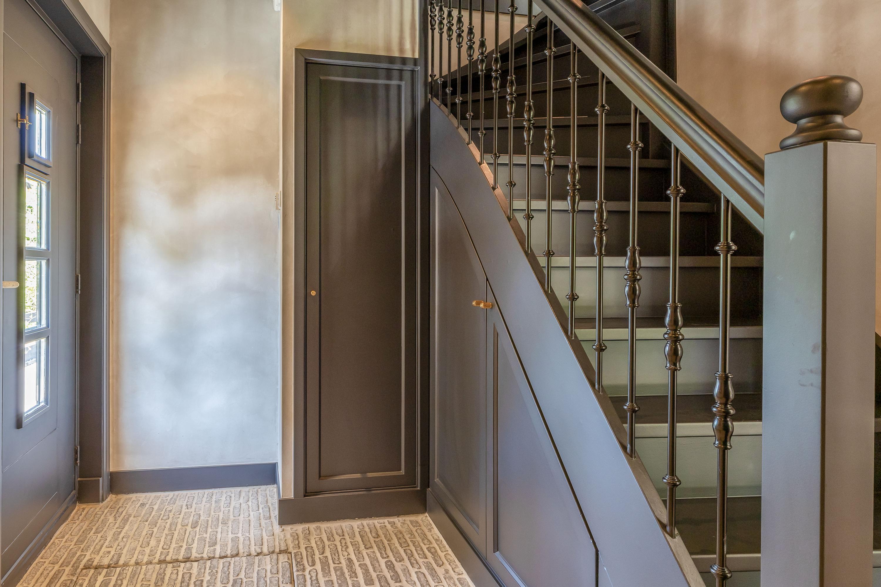 Entree/hal met trapopgang, garderobekast en luxe toilet met fonteintje.