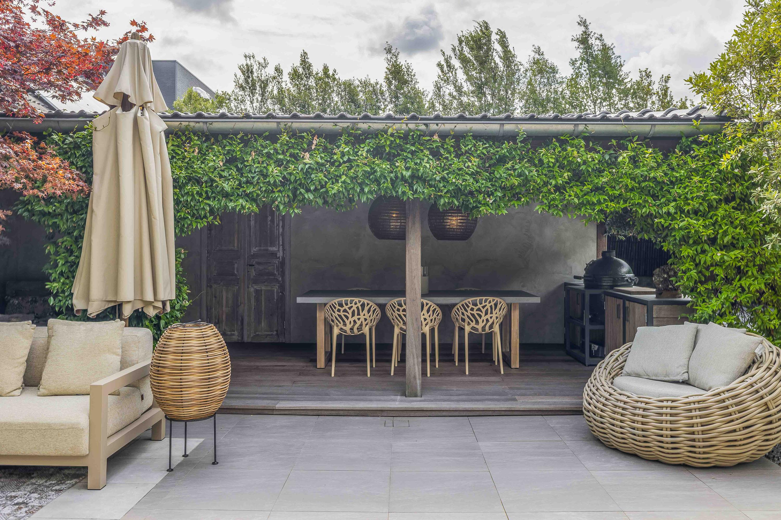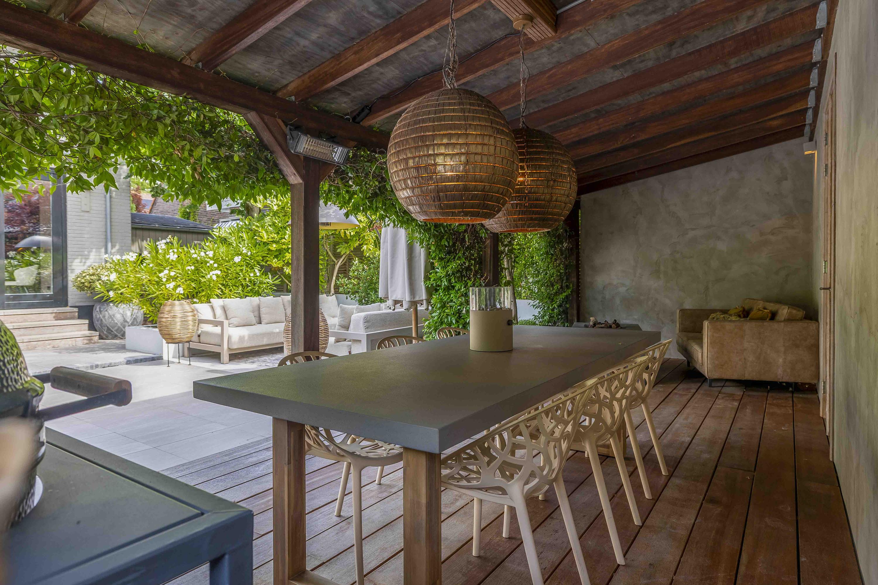 Achterin de tuin bevindt zich een stijlvolle overkapping met buitenkeuken en open haard – perfect voor ontspannen zomeravonden.