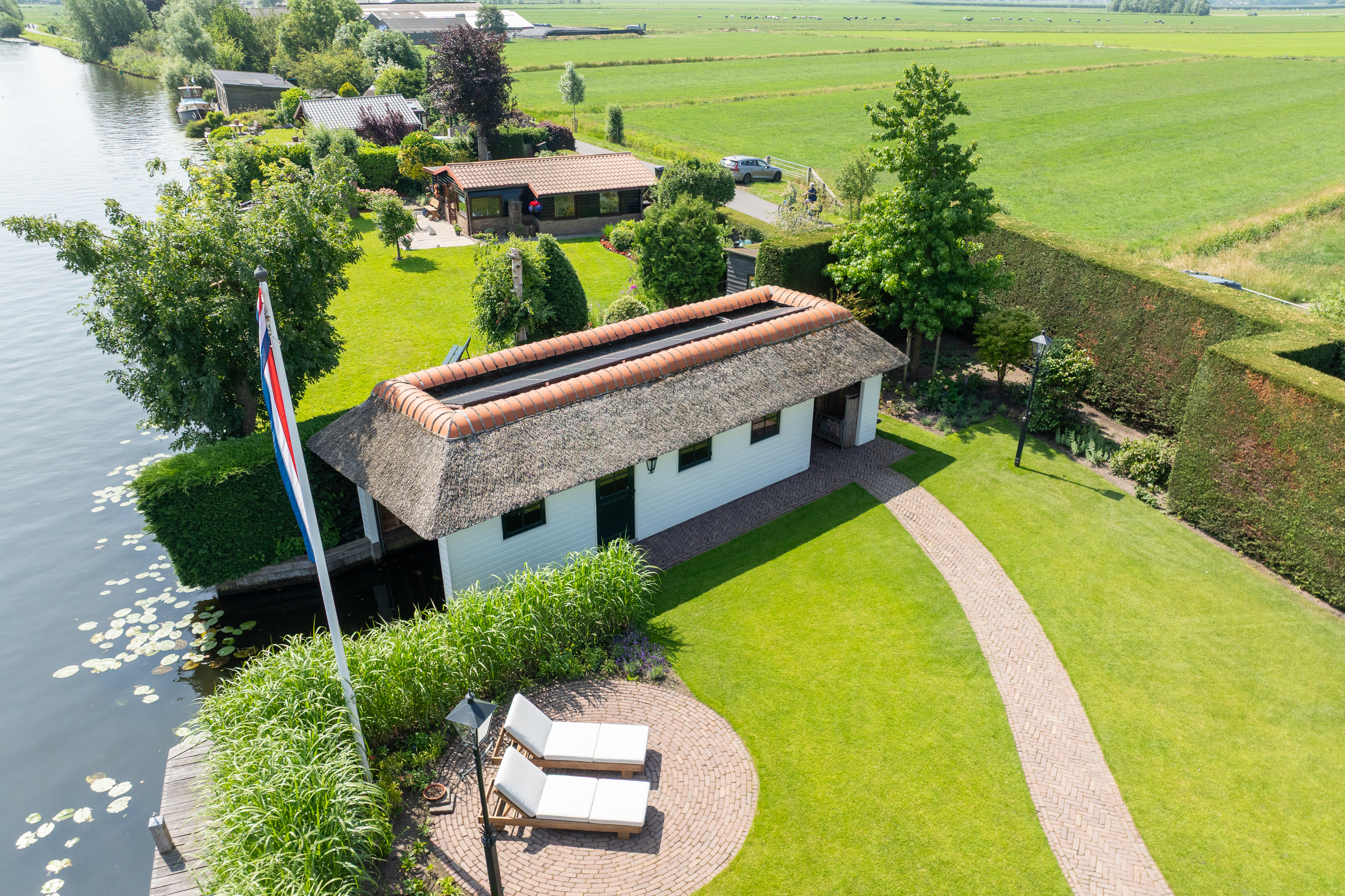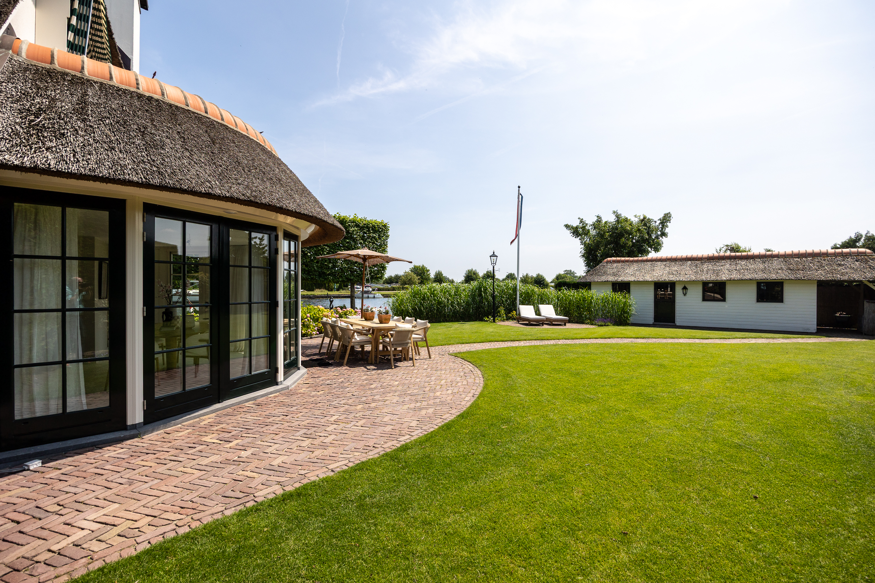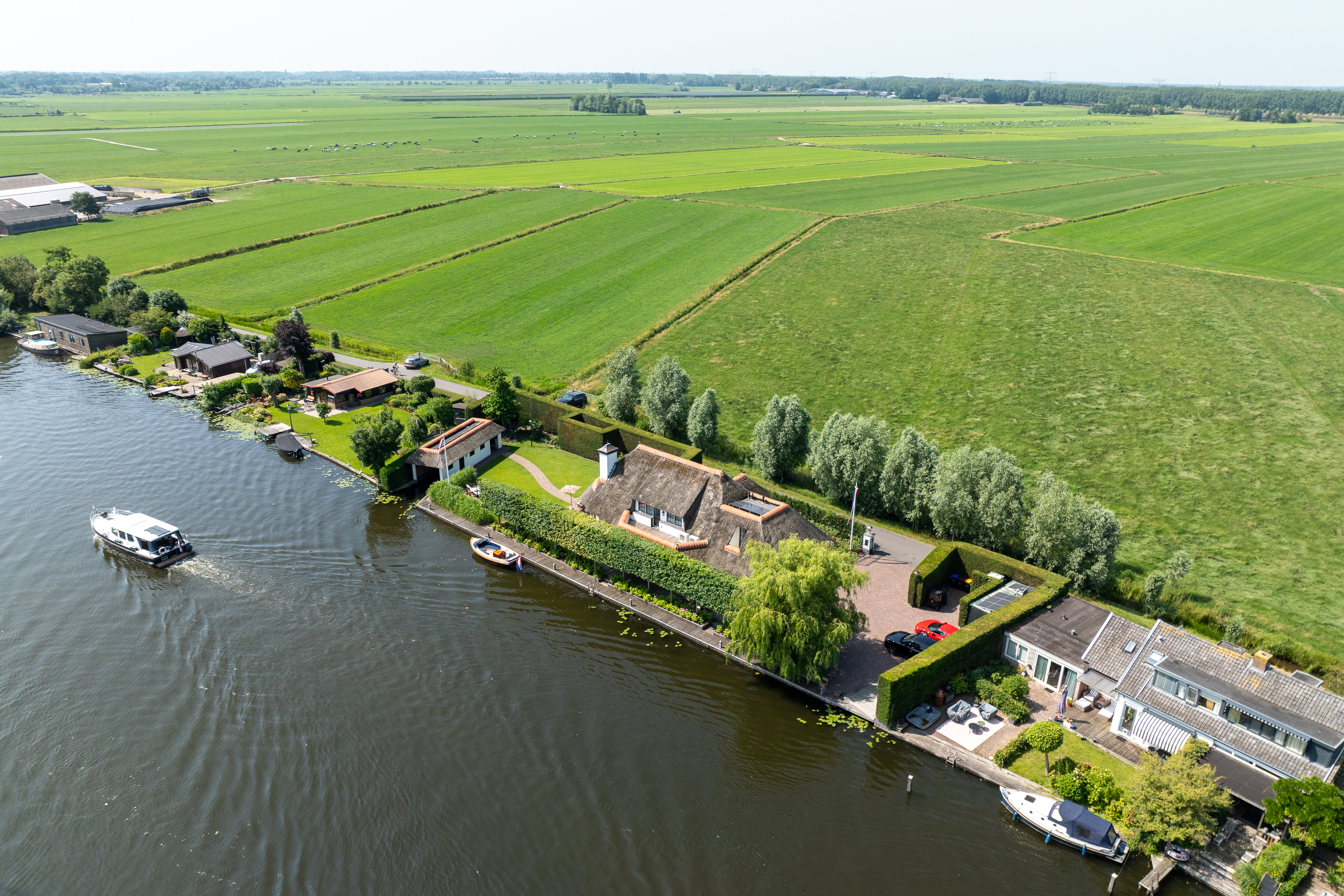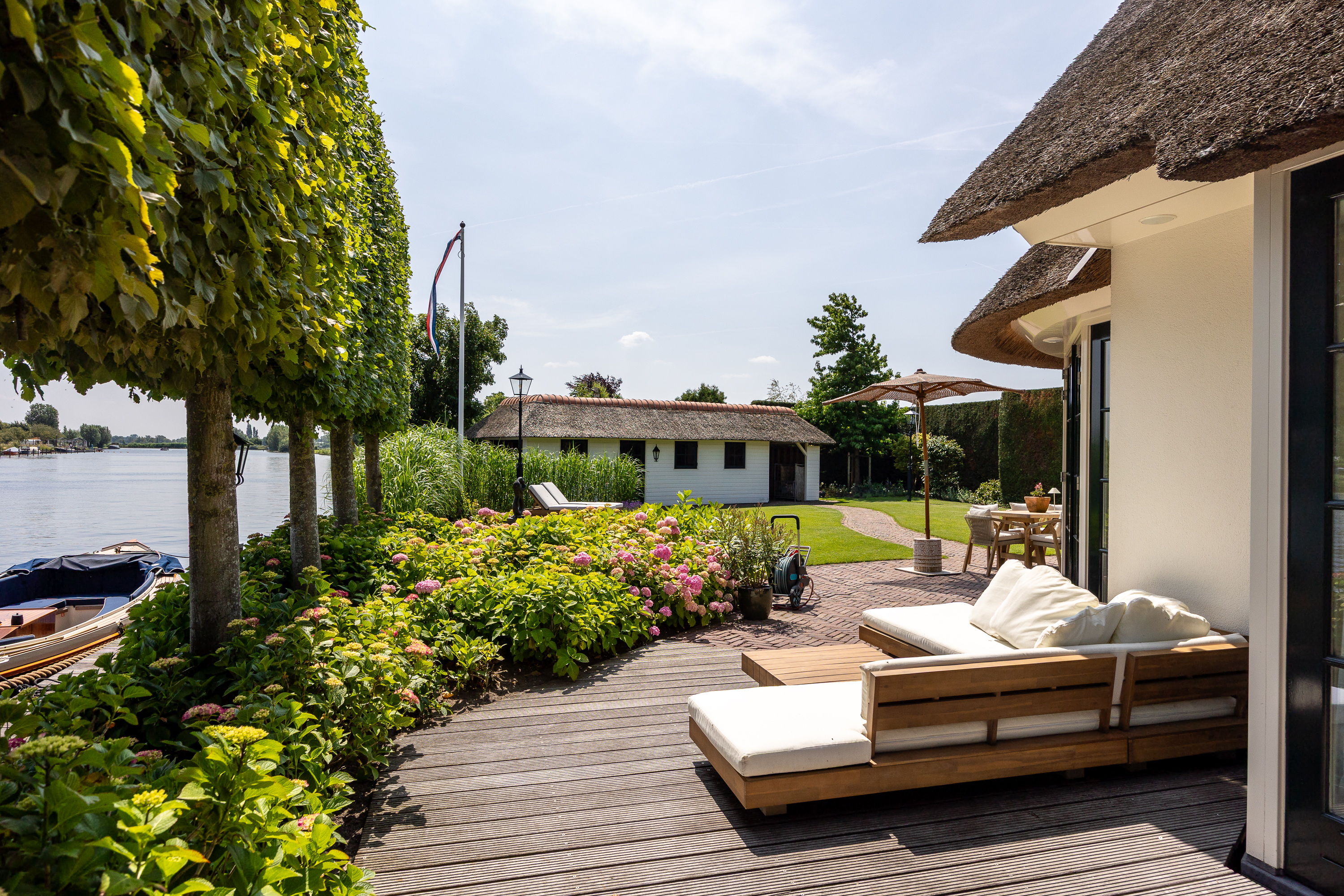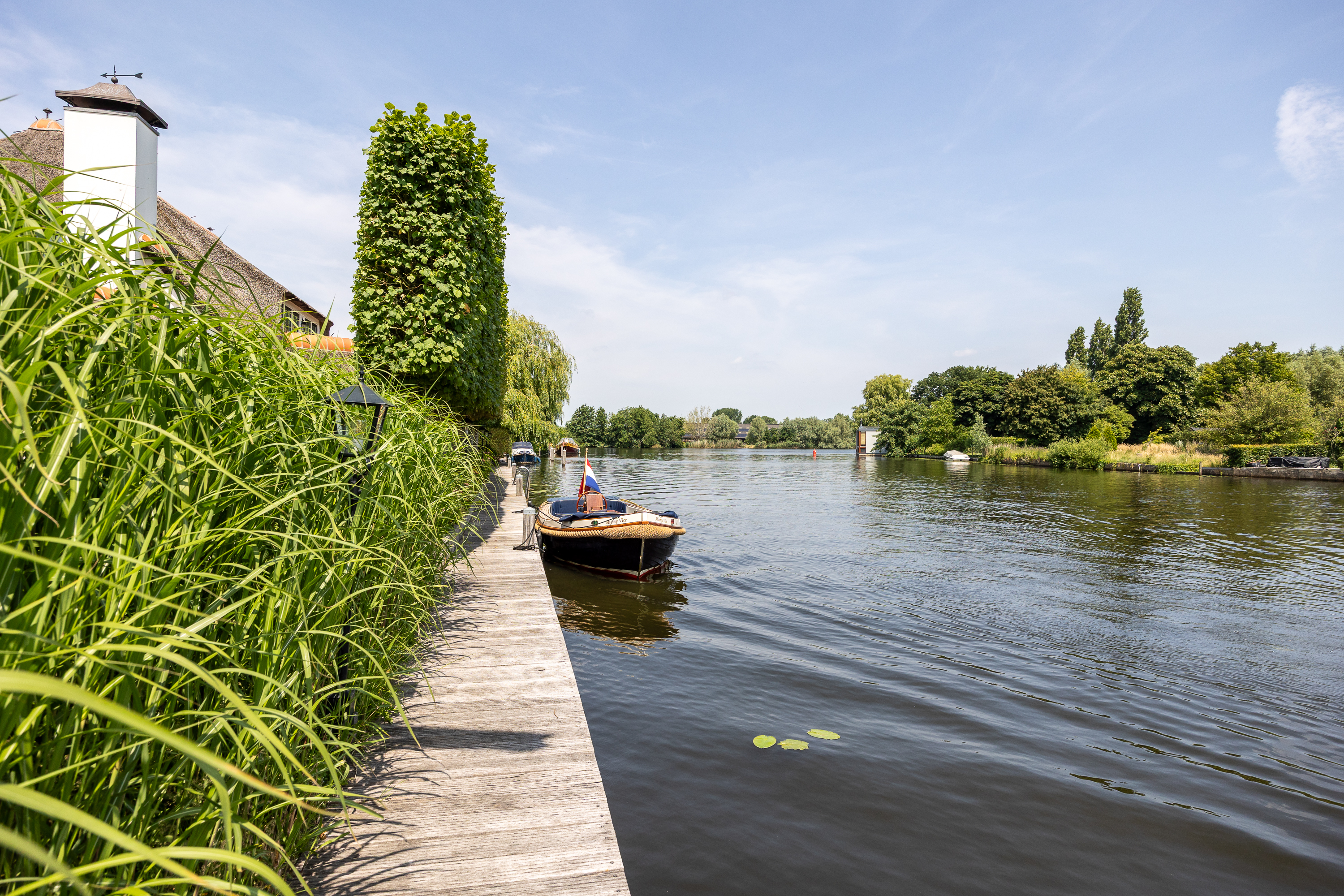 Vreelandseweg 99 in Nigtevecht - A beautiful, modern (completely renovated in 2023), luxurious, thatched villa on the majestic River Vecht, just outside Amsterdam. Living here means endless enjoyment with family and friends of the beautiful nature, the conviviality of water sports on the river, but also the ultimate peace and privacy that this magnificent place has to offer. And all this just a stone's throw (20 minutes) from Amsterdam and the charming villages of Nigtevecht and Vreeland (5 minutes).