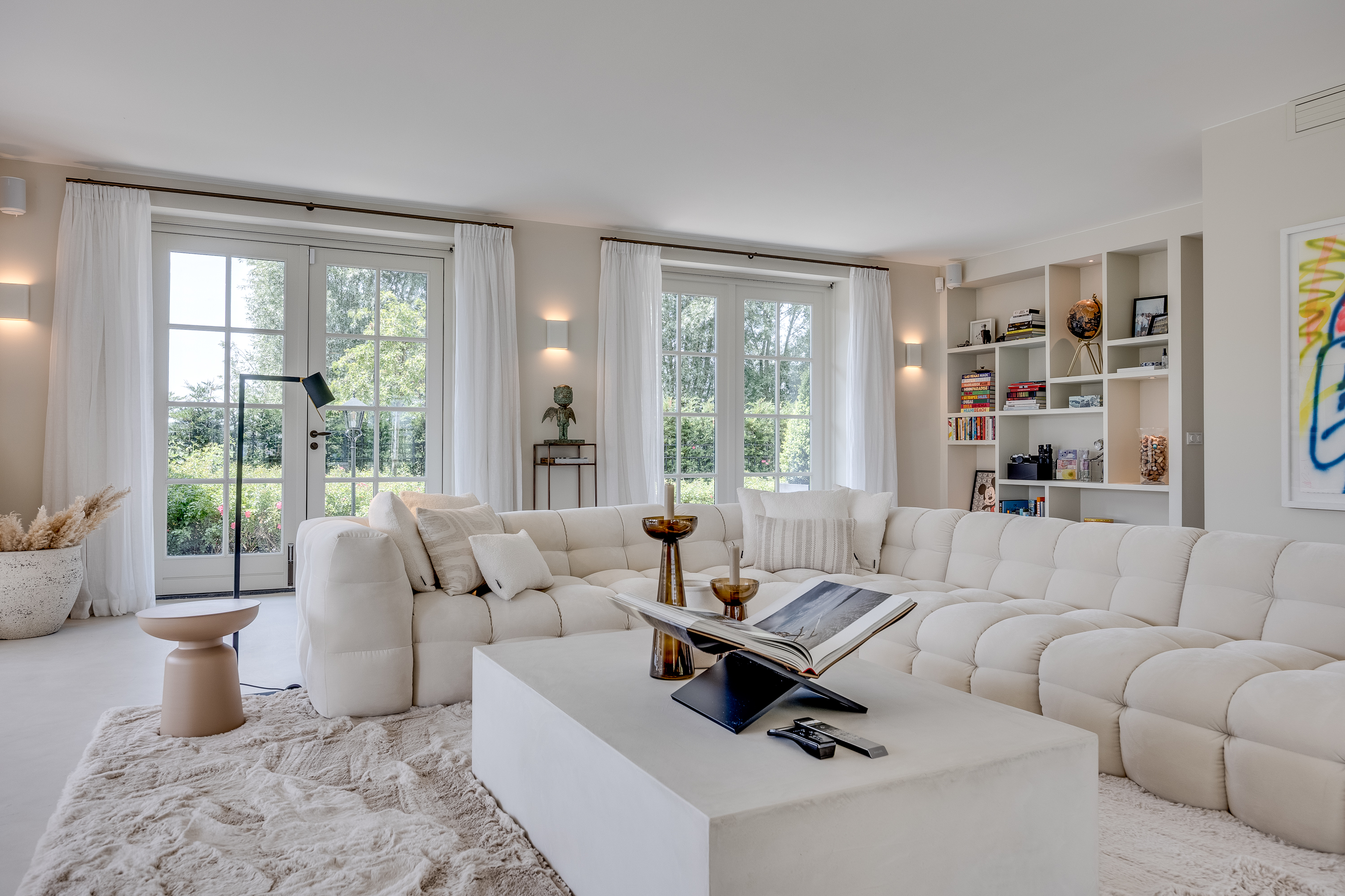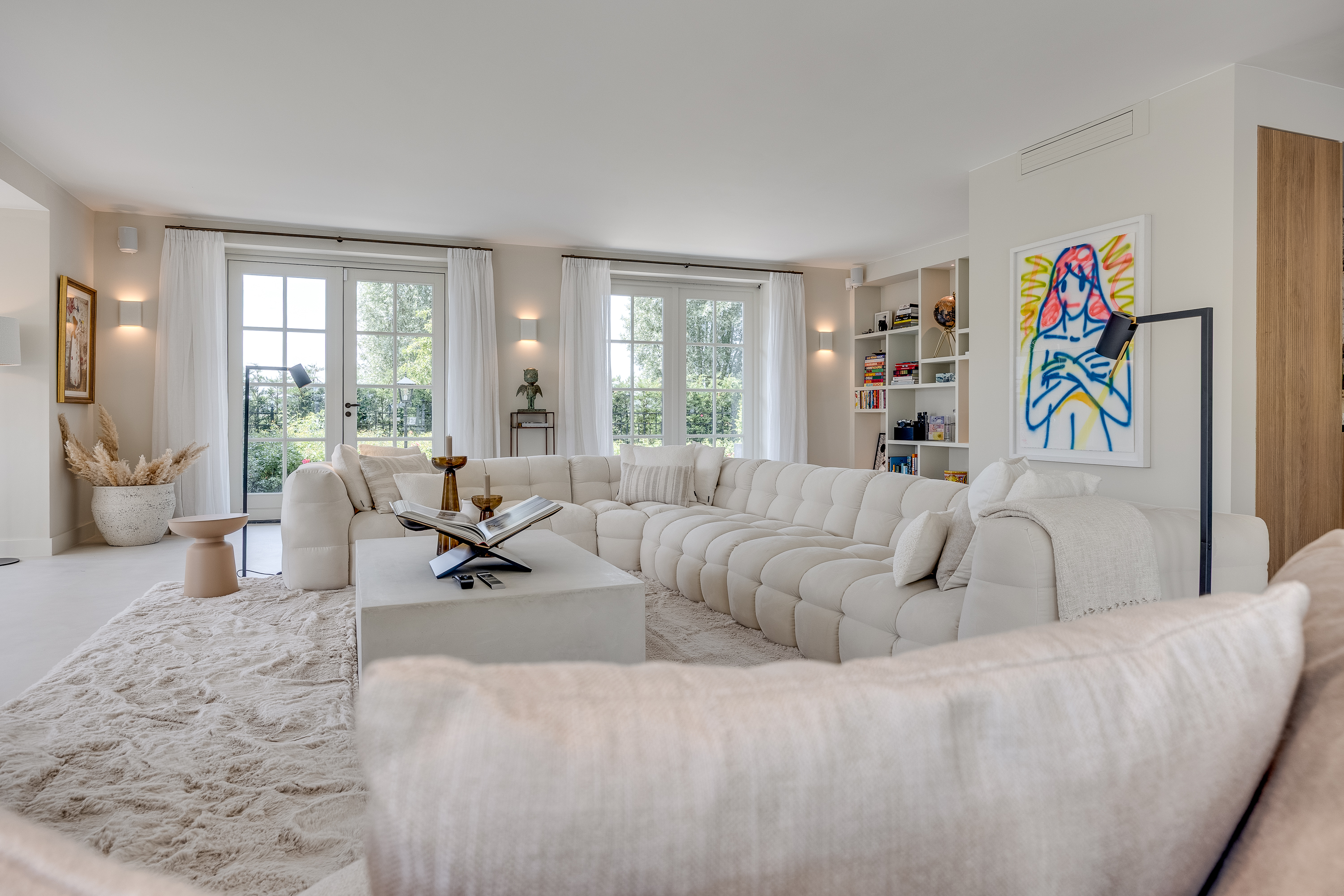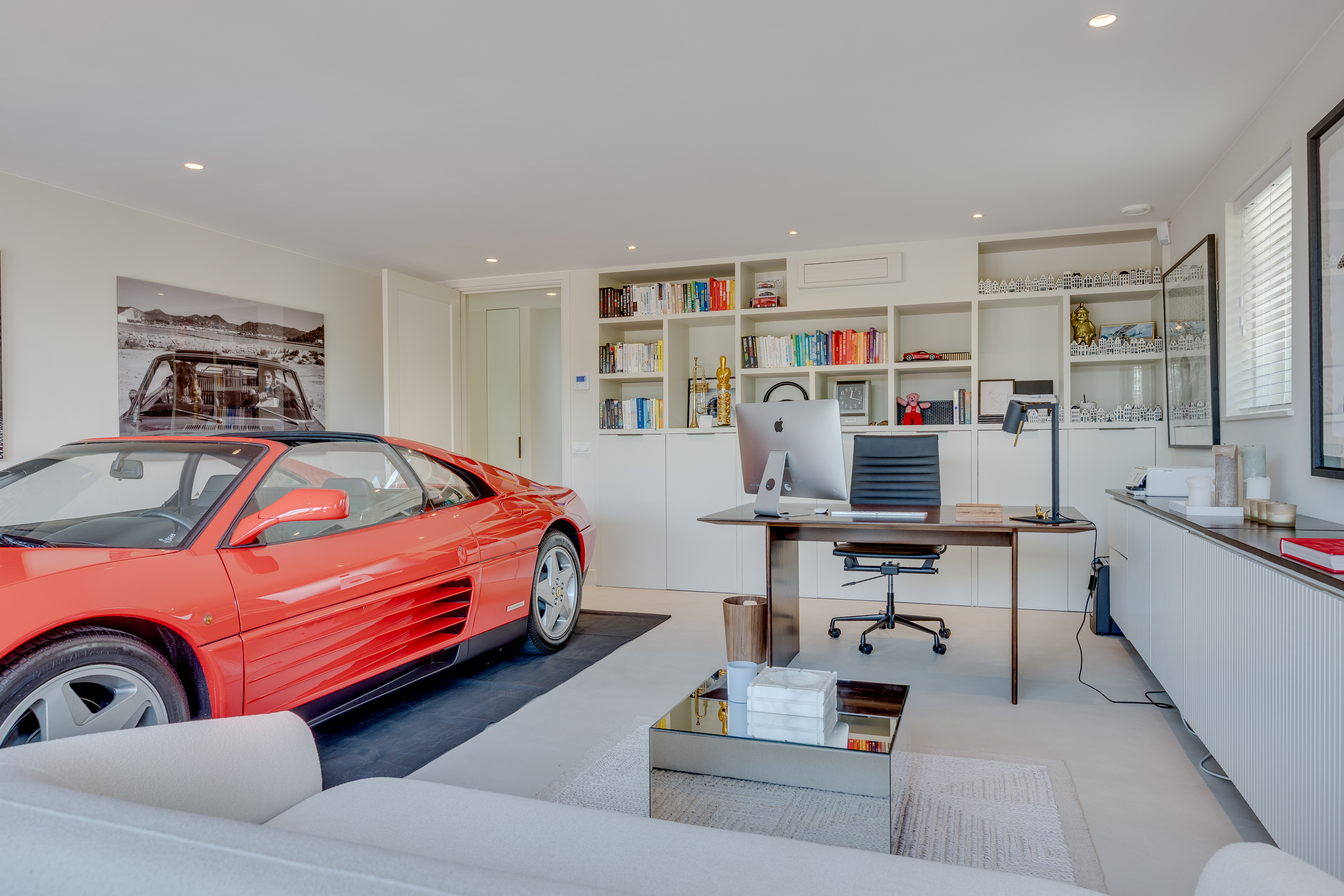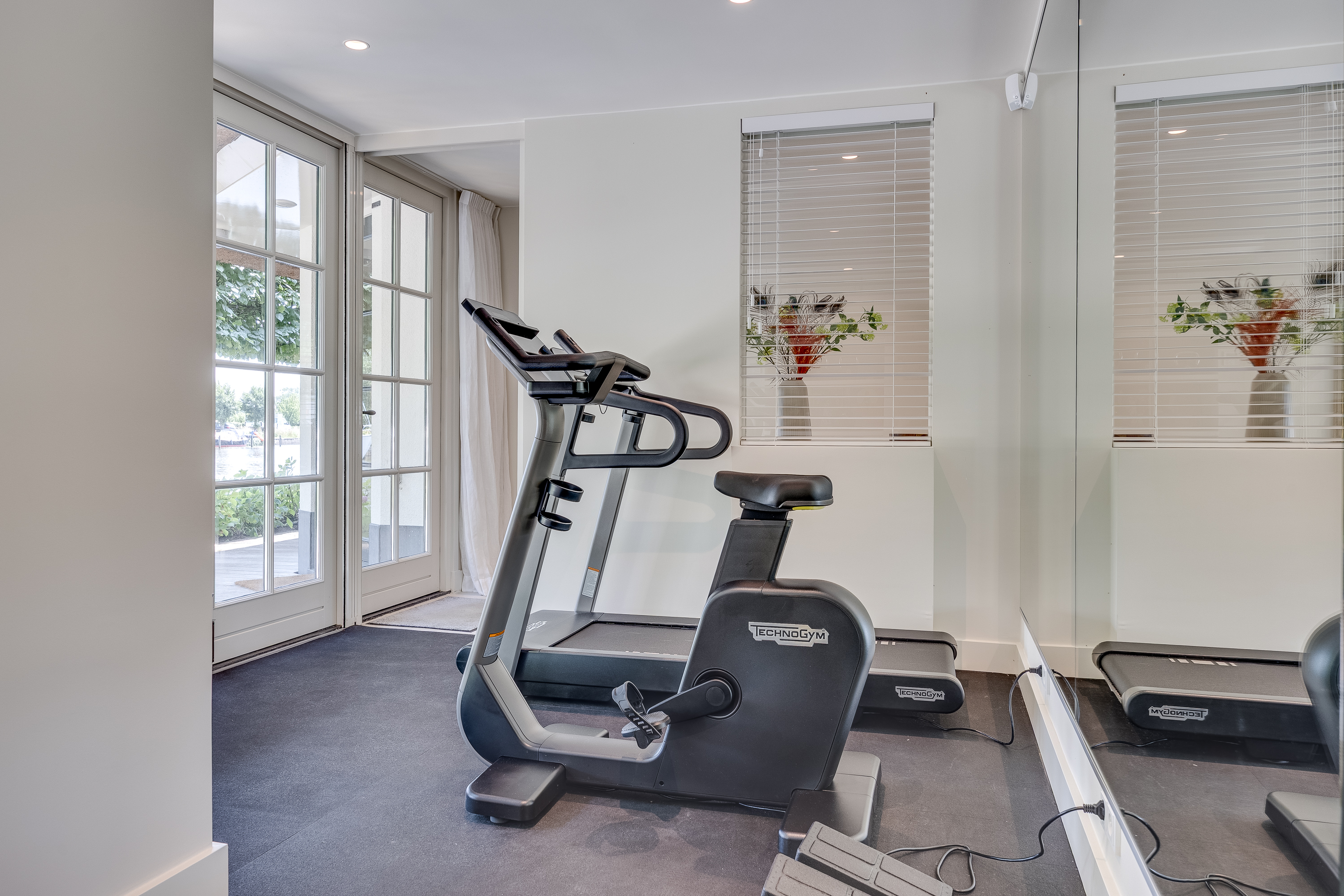 The delightful, spacious study where work and relaxation go hand in hand. Here you can concentrate on your work, and then just as easily do a few squats in the adjacent gym. The study is equipped with custom-made cupboards and, above all, lots of light. Thanks to the large double French doors, you can even park your car inside as a work of art! If you wish to live here for the rest of your life, the study can easily be converted into an extra bedroom with en-suite bathroom with a few adjustments.
