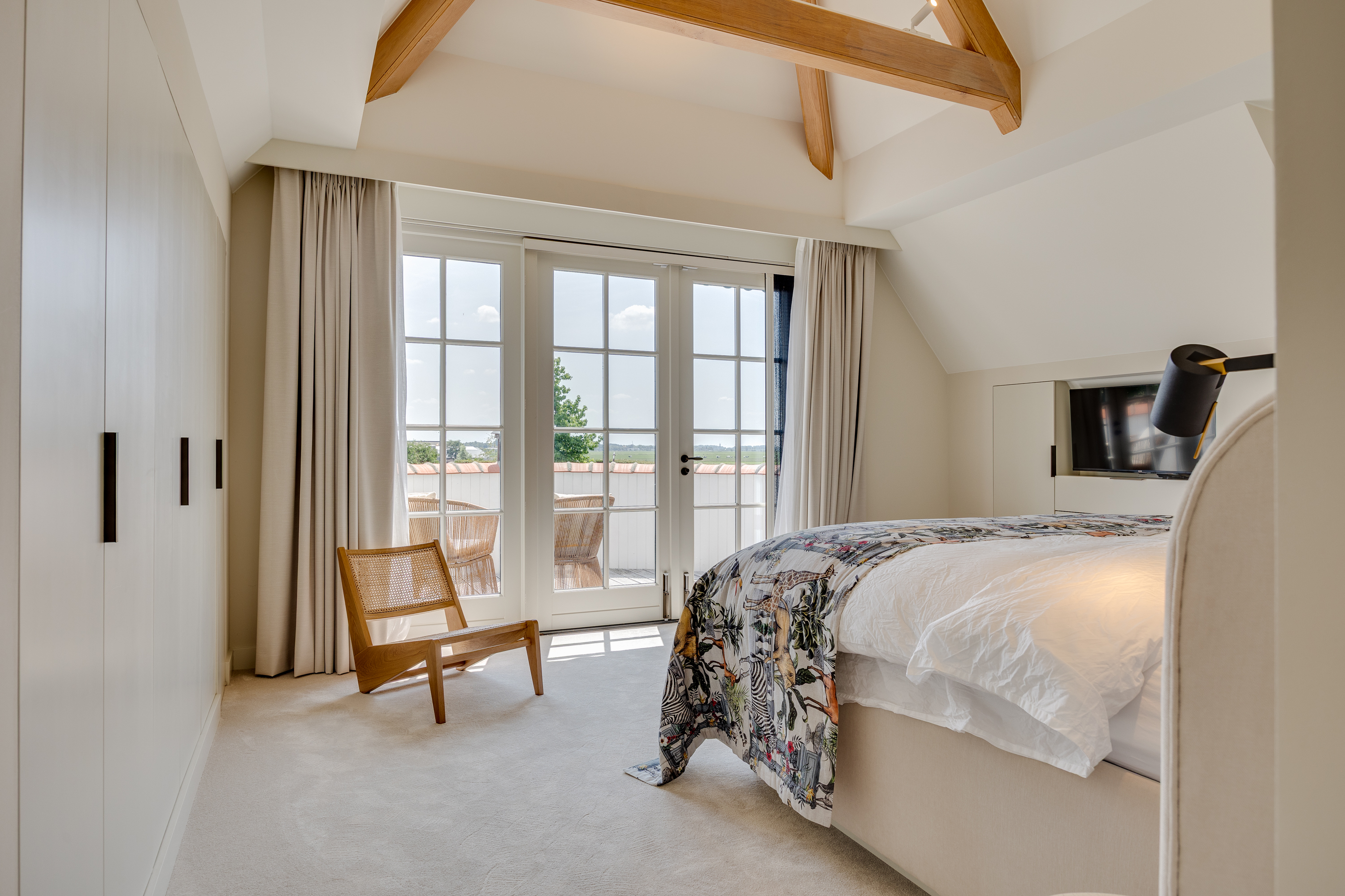 The upper floor features the master bedroom, fully equipped with an en-suite bathroom and walk-in closet. Here, the tranquility is almost tangible; beautiful sweeping views of the countryside and the Vecht river through the French doors and the indoor balcony. All you can hear is the rippling water and the soft singing of the (water) birds. There is also a luxurious second bedroom with its own en-suite bathroom. Time to end your working day? Close your laptop and stroll through the garden, or grab your boat and set sail. A well-deserved dip is, of course, also an option.