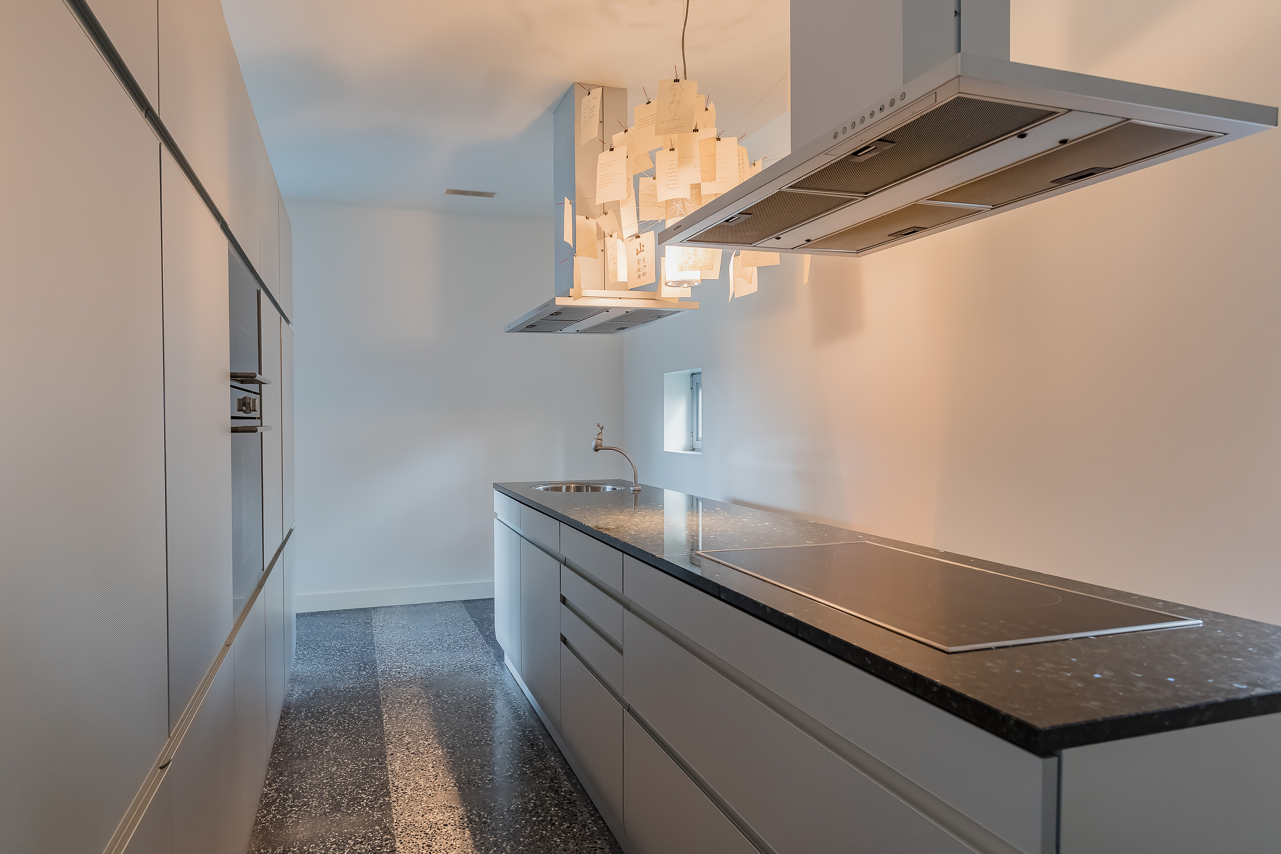The indoor garage of 76 m2 is fully insulated and also here the terrazzo floor has floor heating. The glass inner wall is easily removed so that the entire first floor becomes one space. The living area thus comes to 356m2 (€ 7.008,43 m2)