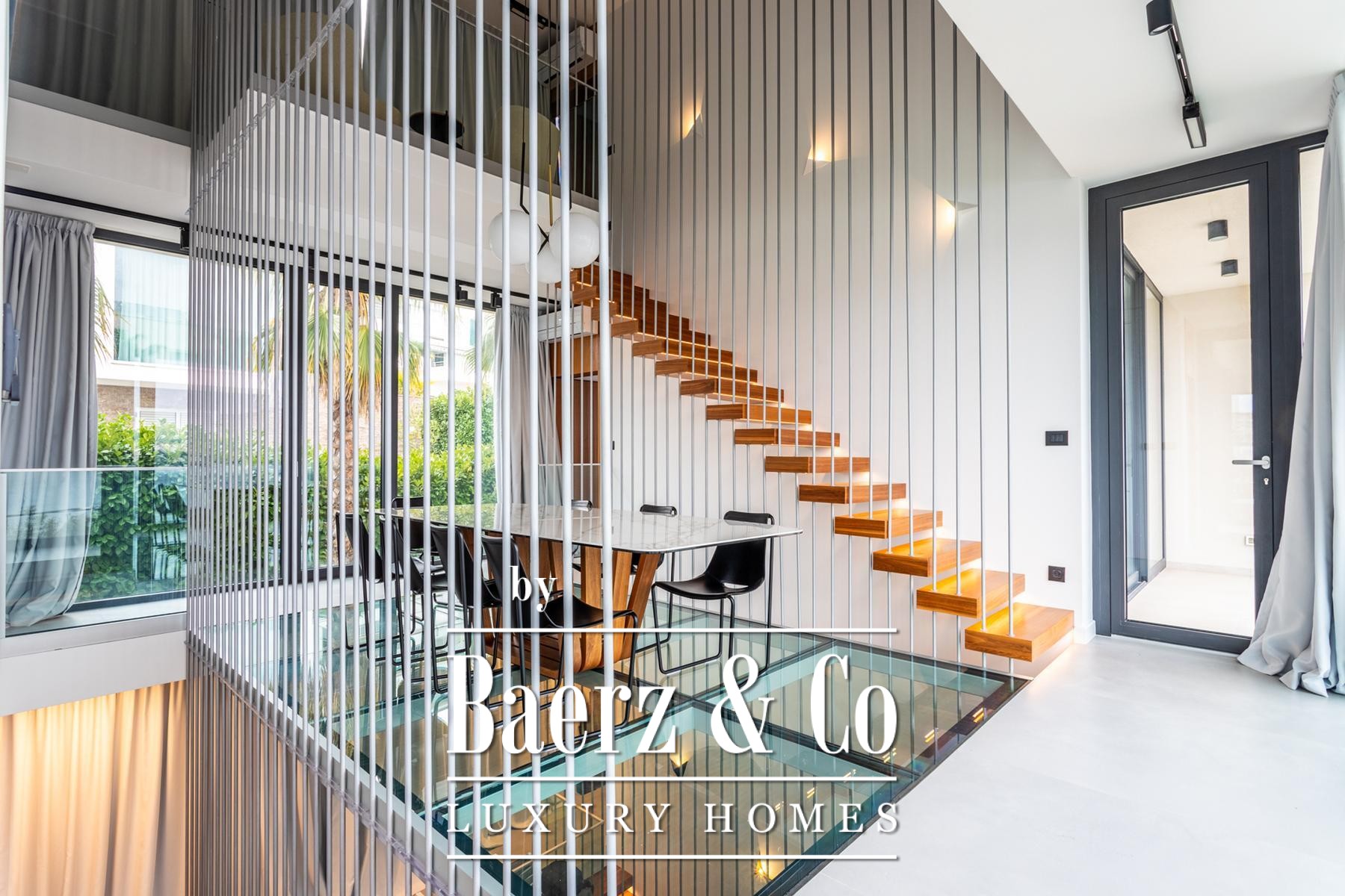 Inside, four floors accommodate four bedrooms and four bathrooms, each level revealing thoughtful design, custom furnishings, and finely tuned amenities. The basement is dedicated to wellness and leisure, with a wine cellar, sauna, games room, gym, and laundry, adding a quiet sense of luxury to daily life. The ground level flows onto a terrace with a private pool and sunbathing area, while upper floors present a contemporary kitchen, dining area, and a spacious living room with seamless balcony access.