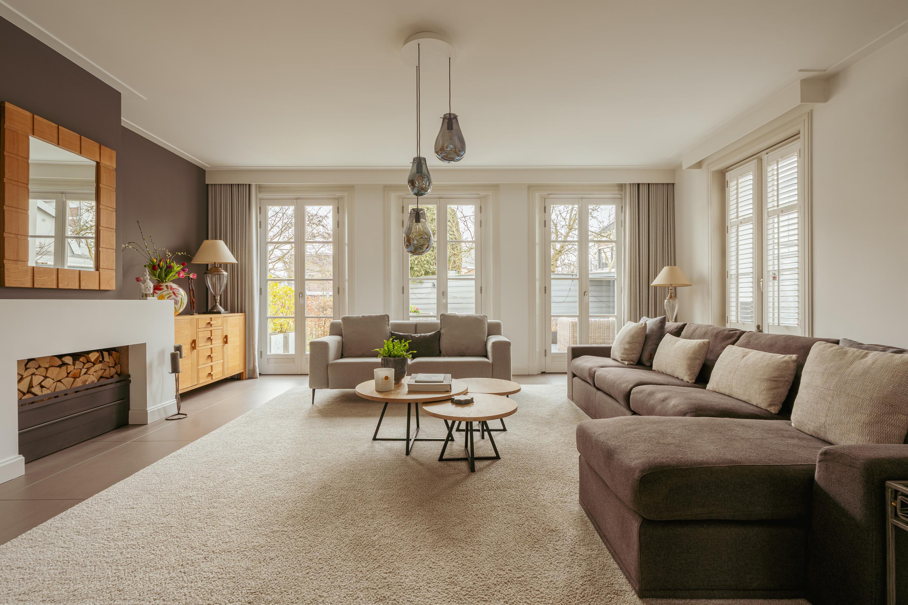 Thanks to the large windows, this floor feels exceptionally light and spacious. At the rear, three sets of French doors provide access to the sunny terrace.