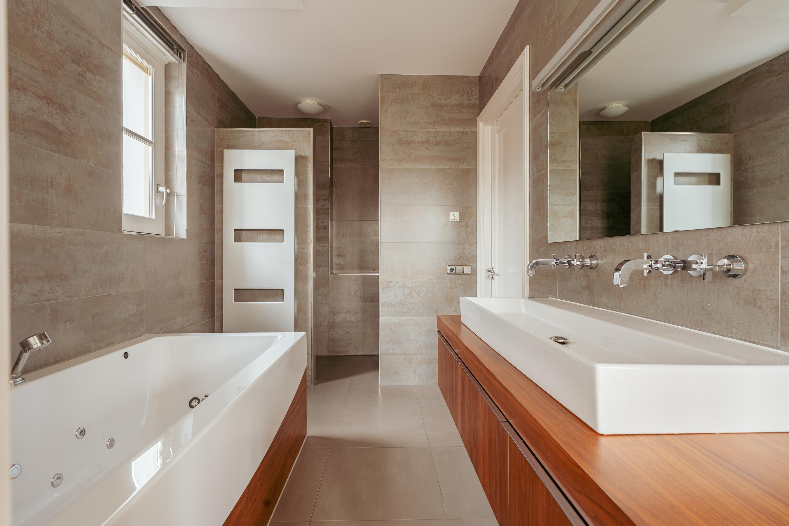 The spacious principal bedroom at the rear features air conditioning, a walk-in wardrobe with sliding doors and direct access to the en-suite bathroom. The bathroom is fitted with underfloor heating, a bathtub with bubble system, a walk-in shower and a double washbasin unit, and is also accessible from the landing.