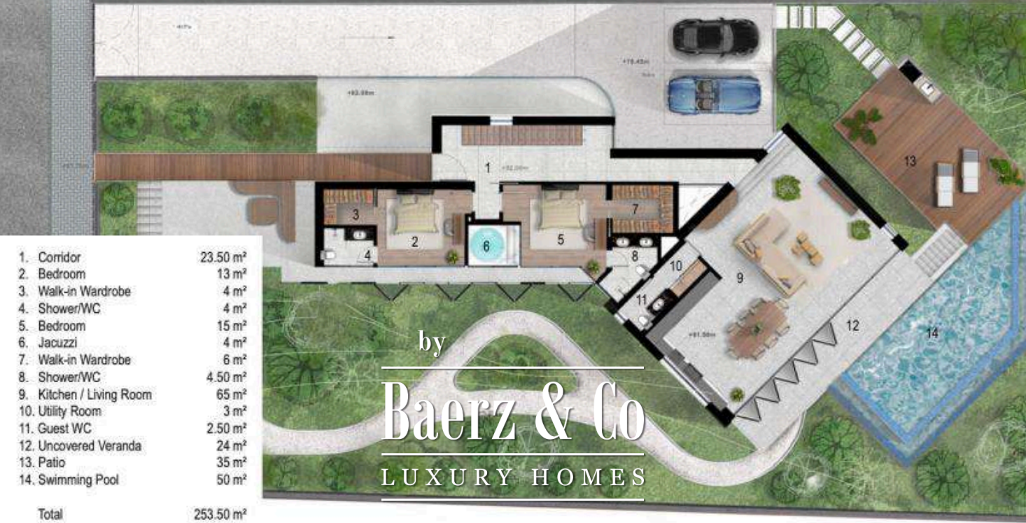 The villa features four bedrooms and four bathrooms, complemented by five WCs, creating generous space for privacy. Living areas include a large lounge, two kitchens, an office, a playroom, and a gym, with additional service and storage rooms enhancing functionality. Smart home systems and three-phase current, together with security installations like a CCTV, alarm, and security door, ensure convenience and safety.