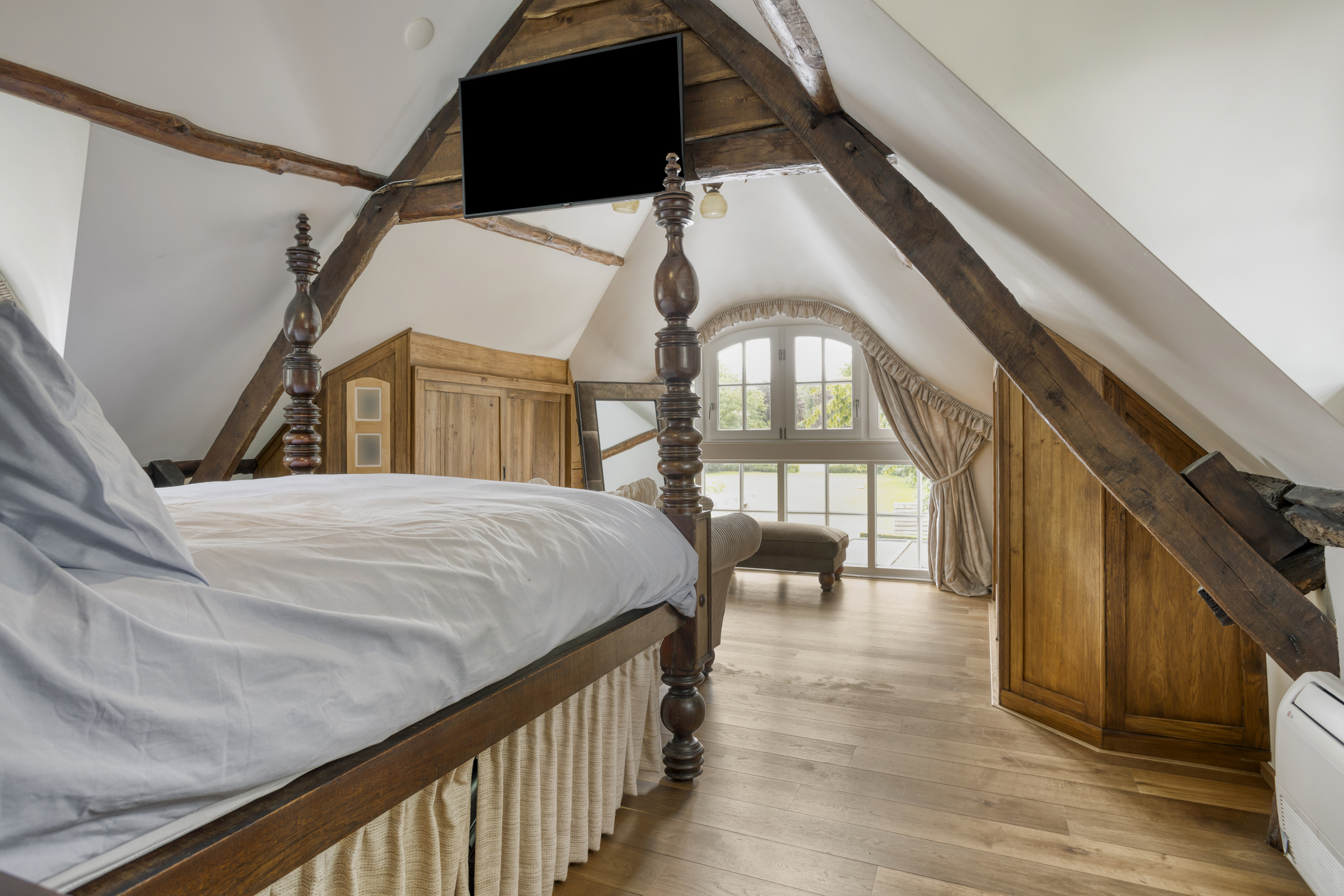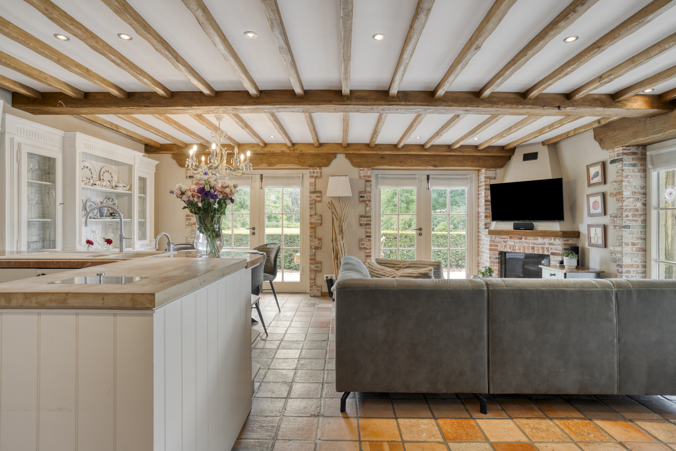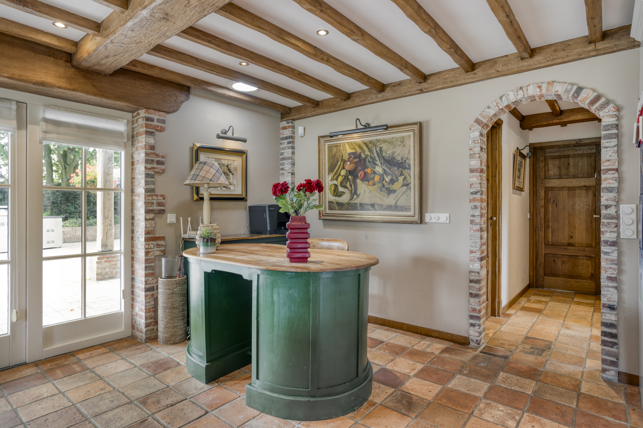 Farmhouse Riethoven offers a sense of seclusion and legacy on a peaceful street at the edge of Riethoven, Netherlands. This fully renovated residence occupies a magnificent 6,755 m² plot, with 484 m² of living space balancing restored character and contemporary comfort, including a detached guest house and a spacious outbuilding. The farmhouse Riethoven is enhanced by a thatched roof and thoughtful details throughout, from the marble-floored entrance and carved hardwood staircases to the elegant beamwork and expansive, light-filled interiors.