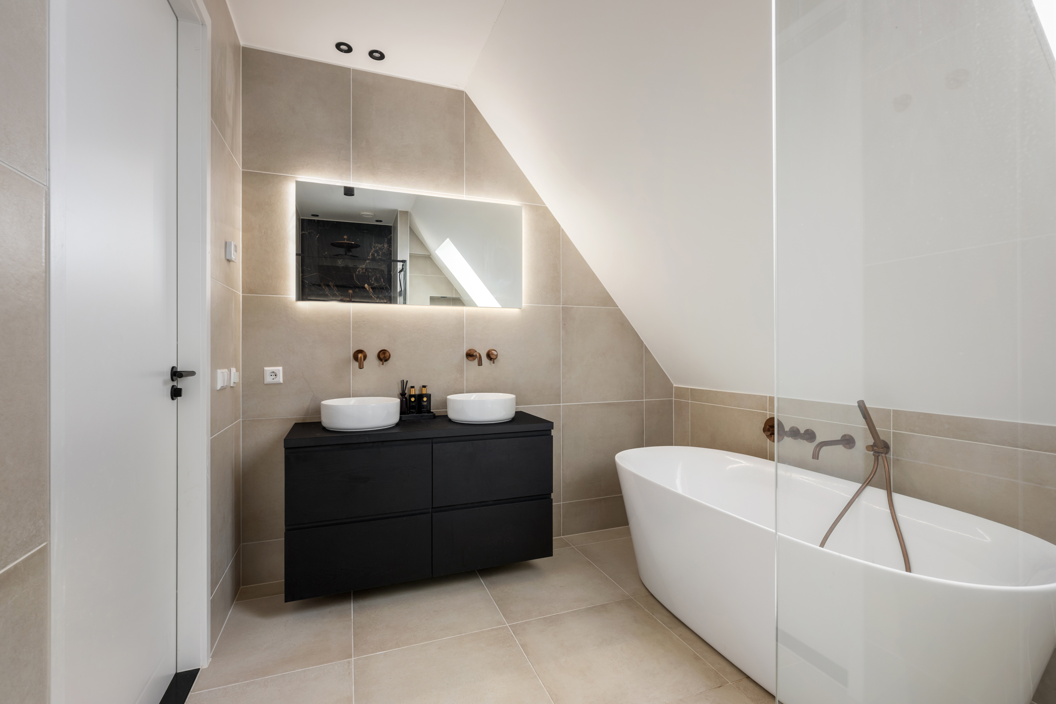 The modern bathroom features a bathtub, walk-in shower, toilet, double washbasin, and a heated, illuminated mirror.