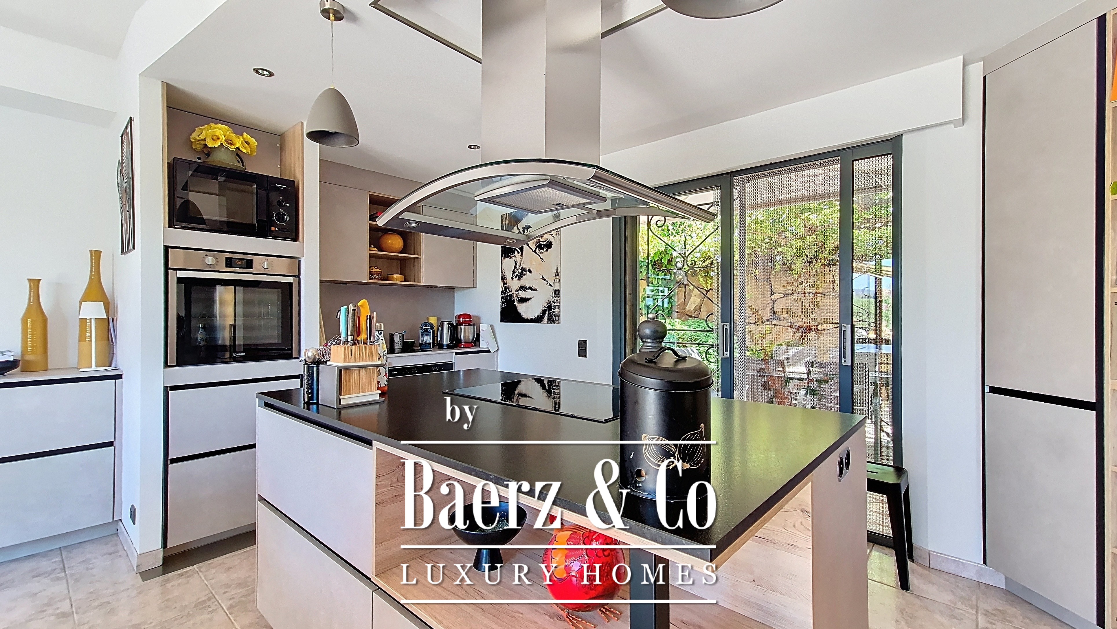 A double reception room anchors the main floor—voluminous, suffused with natural light, and centred around a fireplace. The open-plan kitchen, recently renovated, adjoins this social core, while three bedrooms offer privacy and comfort, led by a master suite that embodies understated elegance. Each room opens to broad terraces, extending the living experience toward landscaped grounds of 1,500 m².