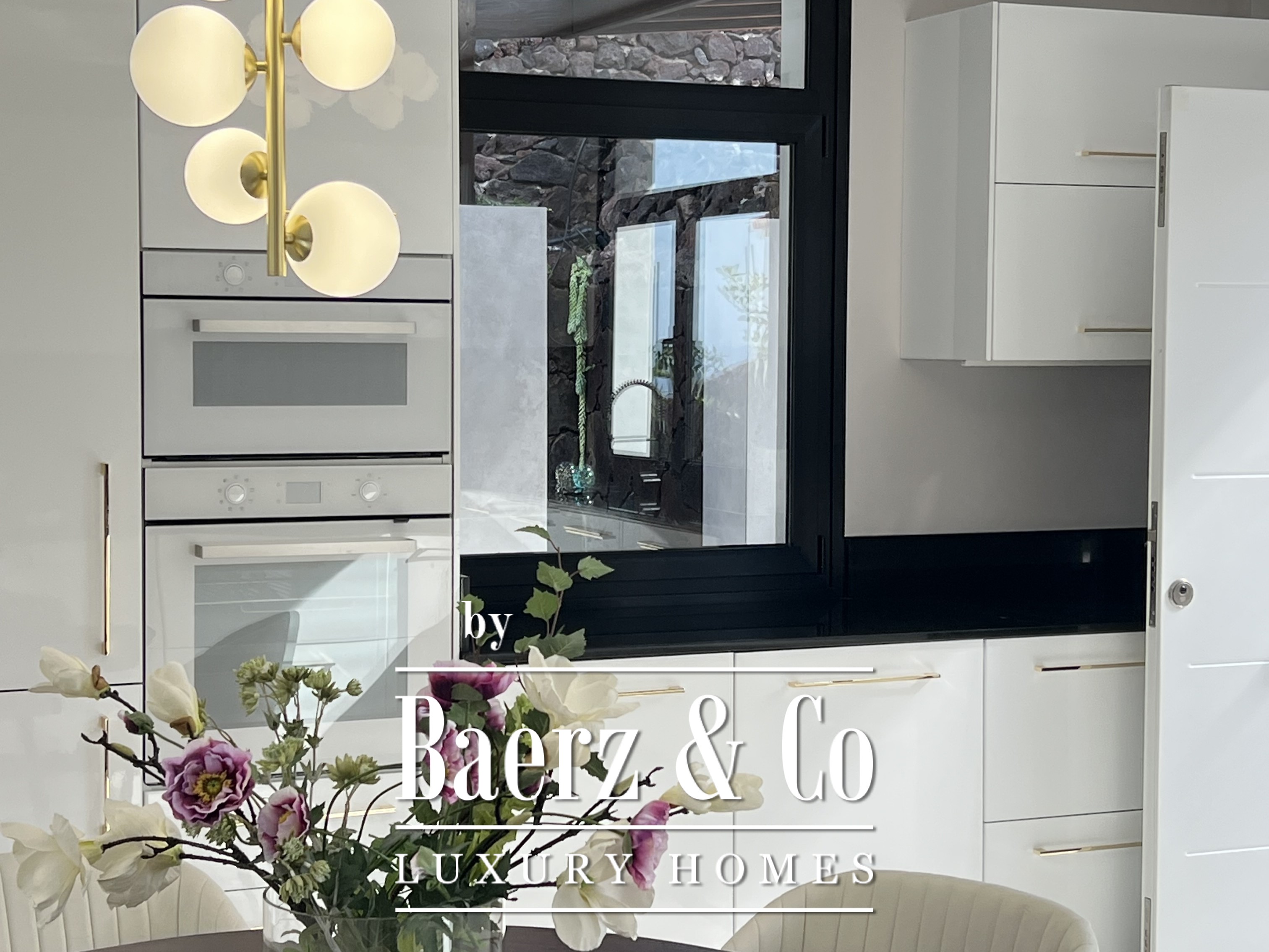 Inside, the independent kitchen connects directly to the terrace encircling the home, spaces designed for shade and breeze in the warmest seasons. The expansive 144 m² main terrace draws the interior outward to a private heated pool, framed by distant La Gomera and the shifting Atlantic. There are four bedrooms and four bathrooms in total, with a separate studio apartment on the lower level, ideal for staff or additional flexibility.