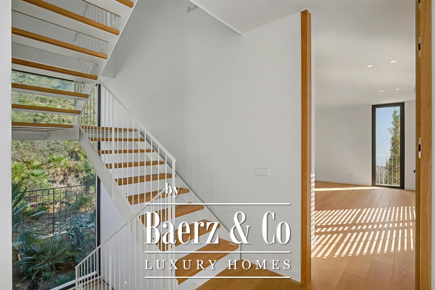 The main floor presents a seamless flow between kitchen and lounge, opening to teak-clad terraces that invite year-round enjoyment of Sant Elm’s celebrated climate. This level accommodates two bedrooms and two bathrooms, each finished with natural materials and understated detail. Ascend to two upper master suites, both with private bathrooms, where one suite extends onto a balcony and the other to a generous terrace overlooking the lush landscape. The rear of the property borders a protected natural area, ensuring complete privacy and an ever-present connection to the outdoors.
