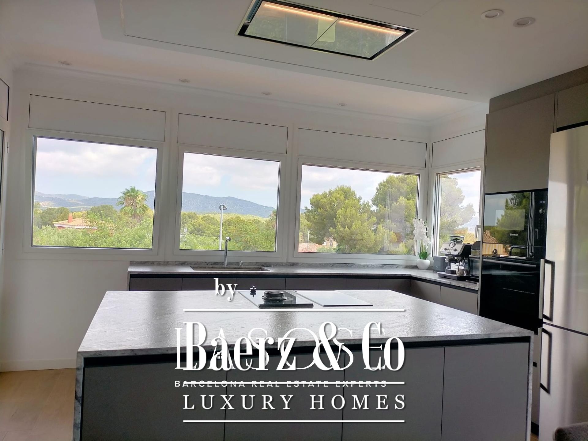Villa Sant Pere de Ribes is quietly positioned in the esteemed Els Cards residential area, set between Sitges and Sant Pere de Ribes, where privacy and panoramic views define every living moment. This five-bedroom, three-bathroom villa blends traditional Spanish architecture with contemporary refinement. Recently renovated interiors preserve authentic details such as arches and natural textures, while bringing in clean modern lines and warm tones. The open-plan main floor flows across kitchen, dining and living spaces, illuminated by abundant sunlight from windows on two sides. A statement fireplace centers the living area, offering an inviting gathering point year-round.