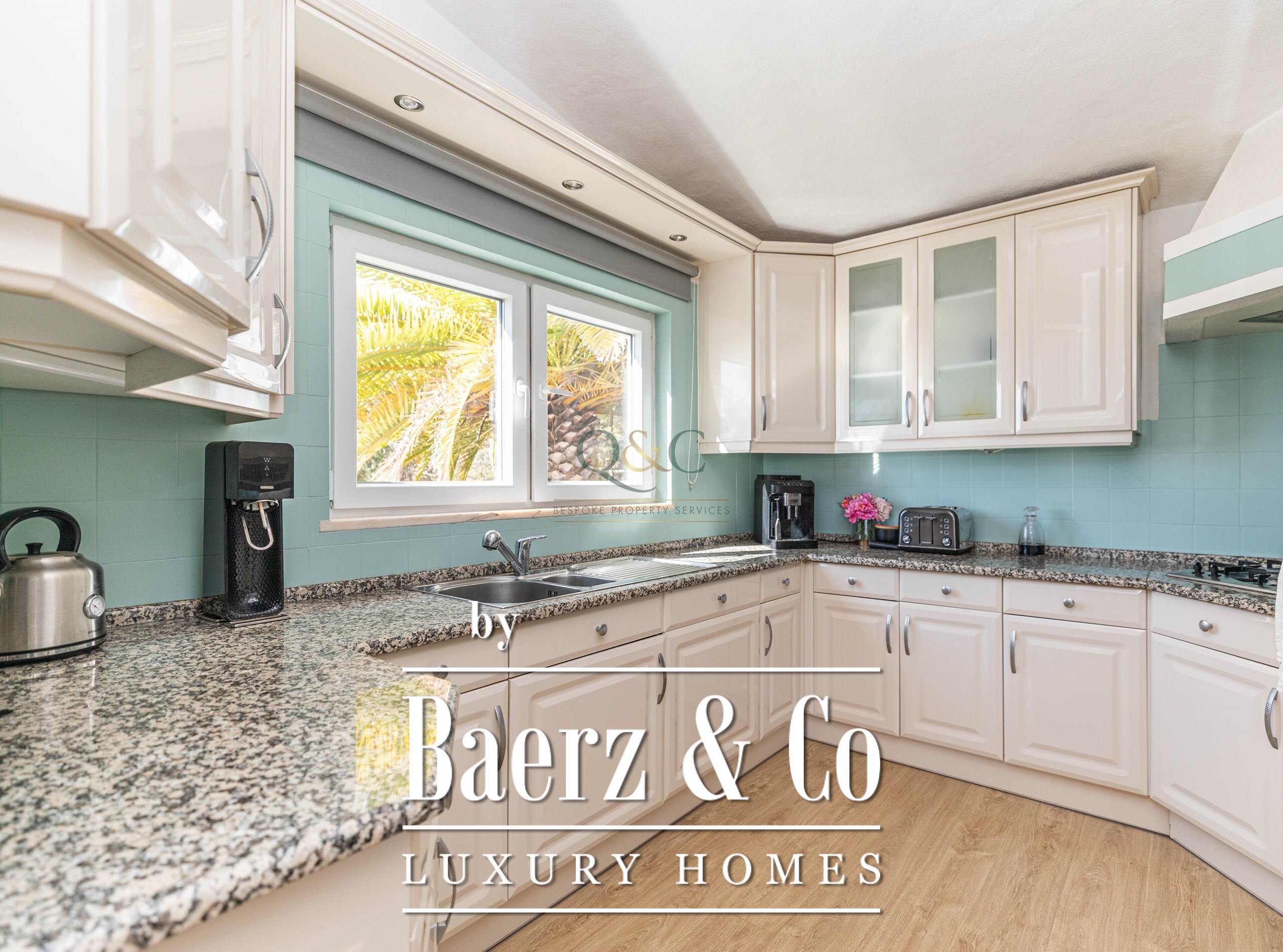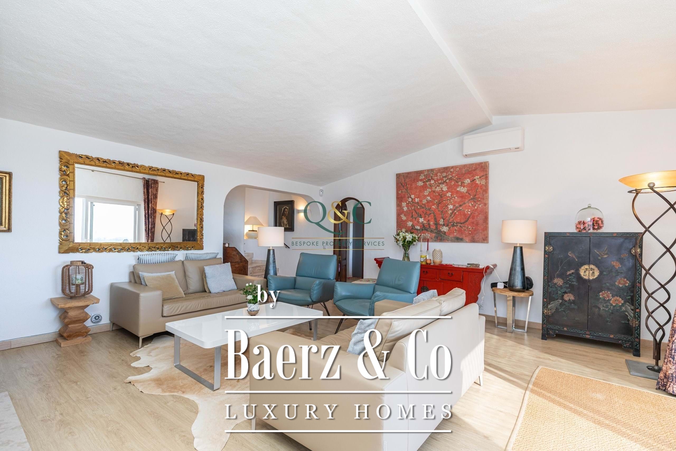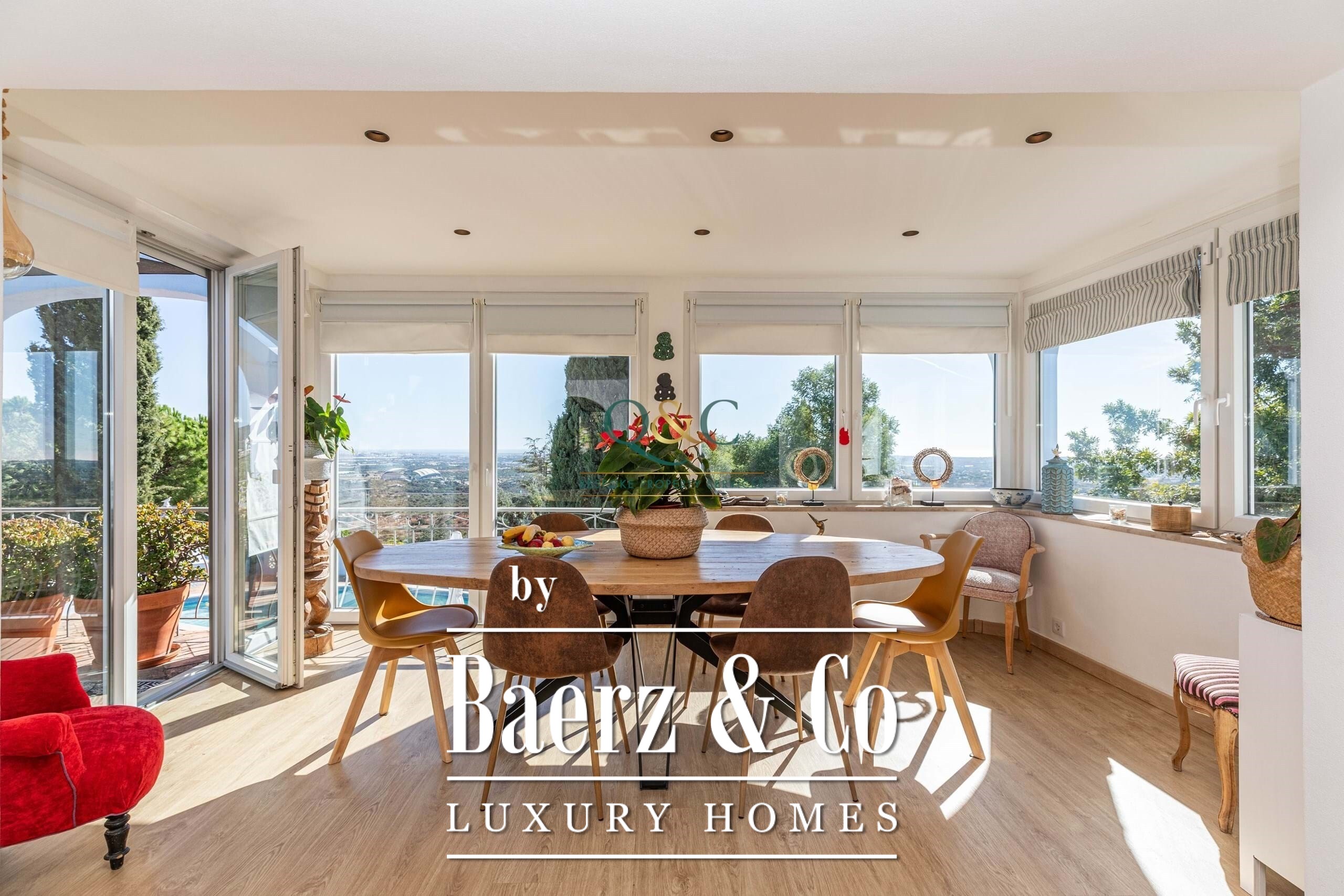 Set within a fully fenced plot, electric gates open to a sweeping calcada driveway leading to a garage, carport, and ample parking. The beautifully landscaped gardens feature mature trees and a well-chosen selection of drought-tolerant plants, creating a lush yet low-maintenance haven.