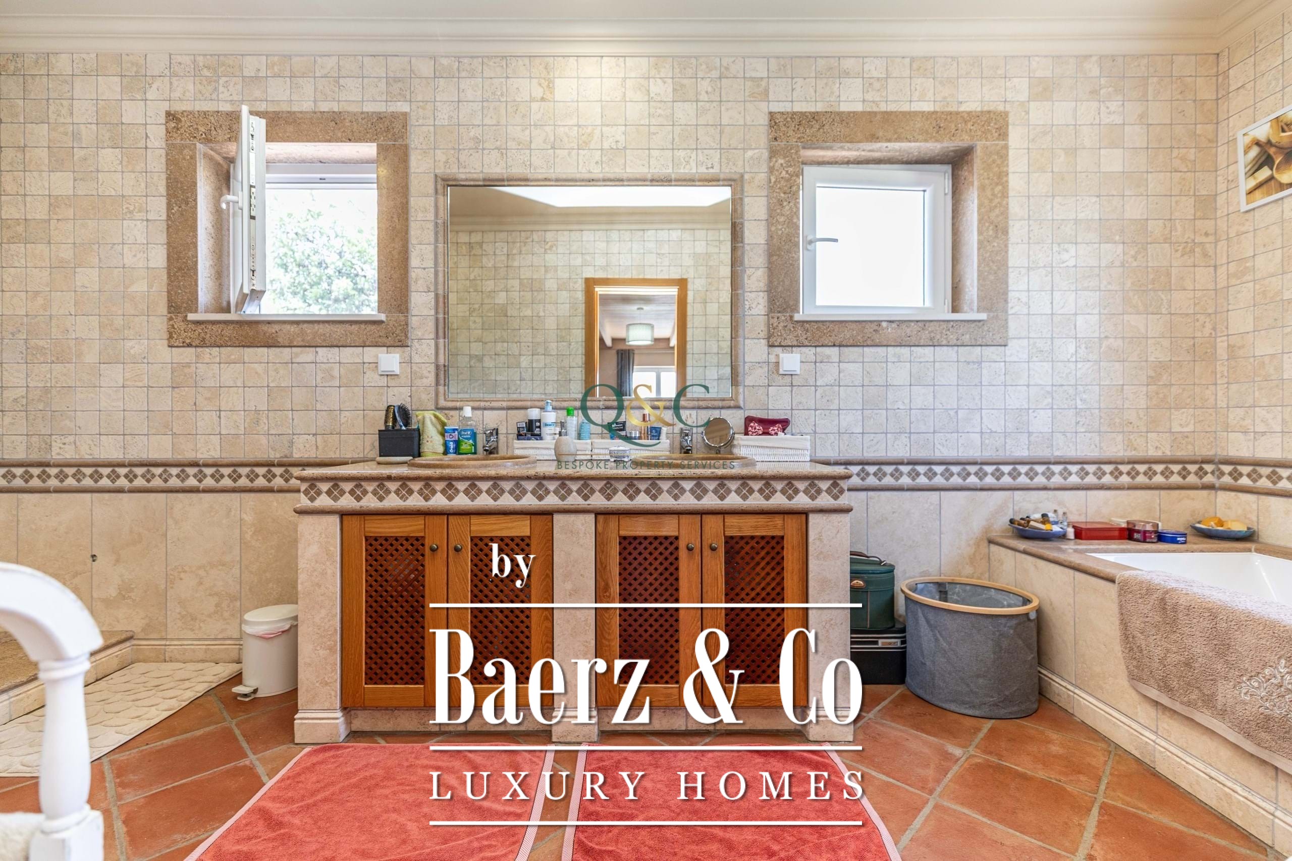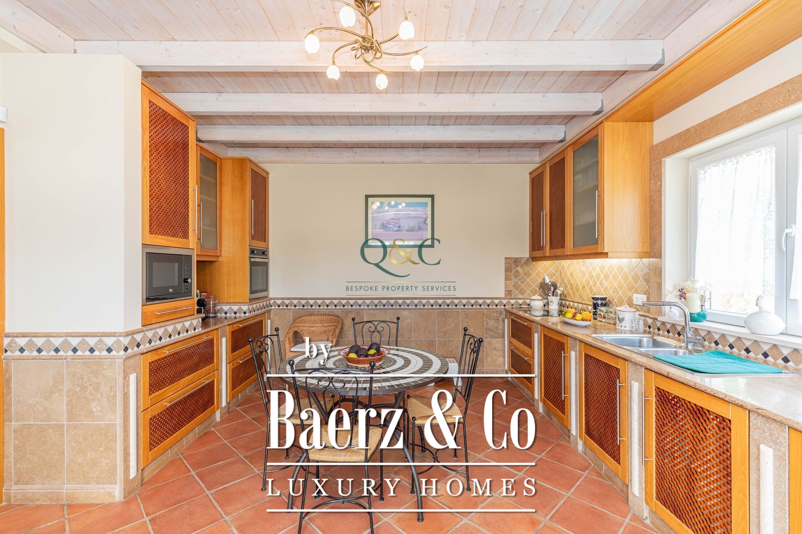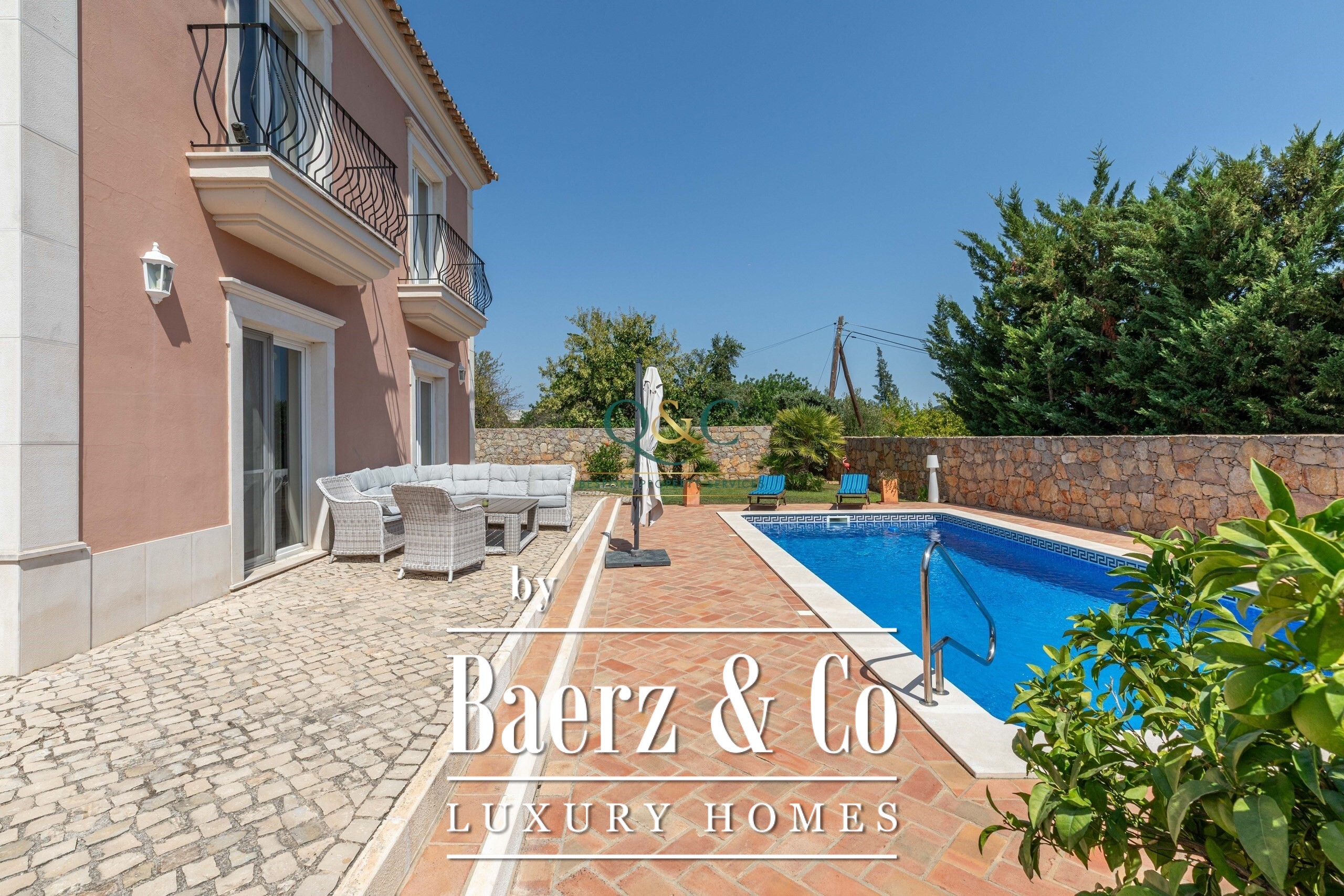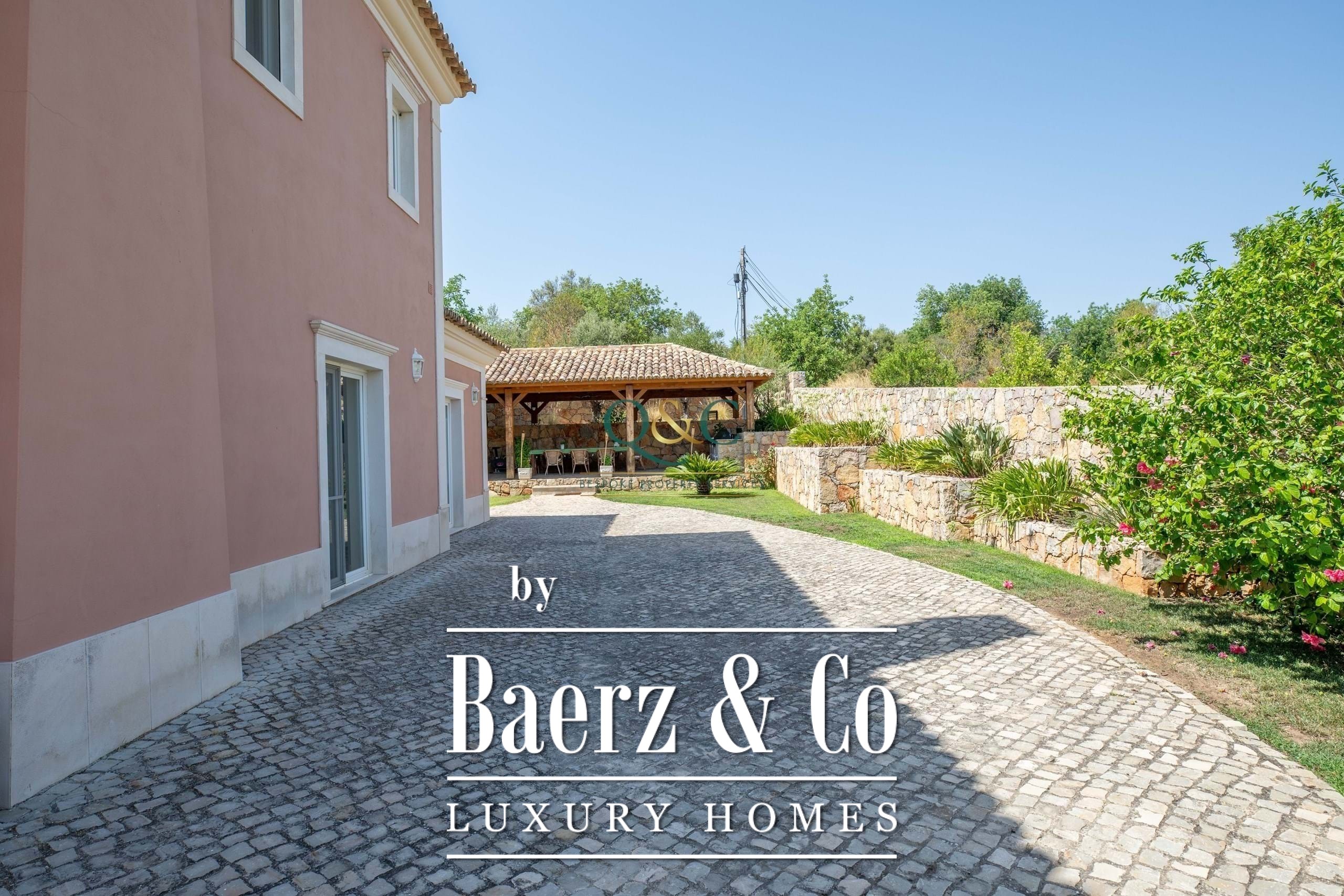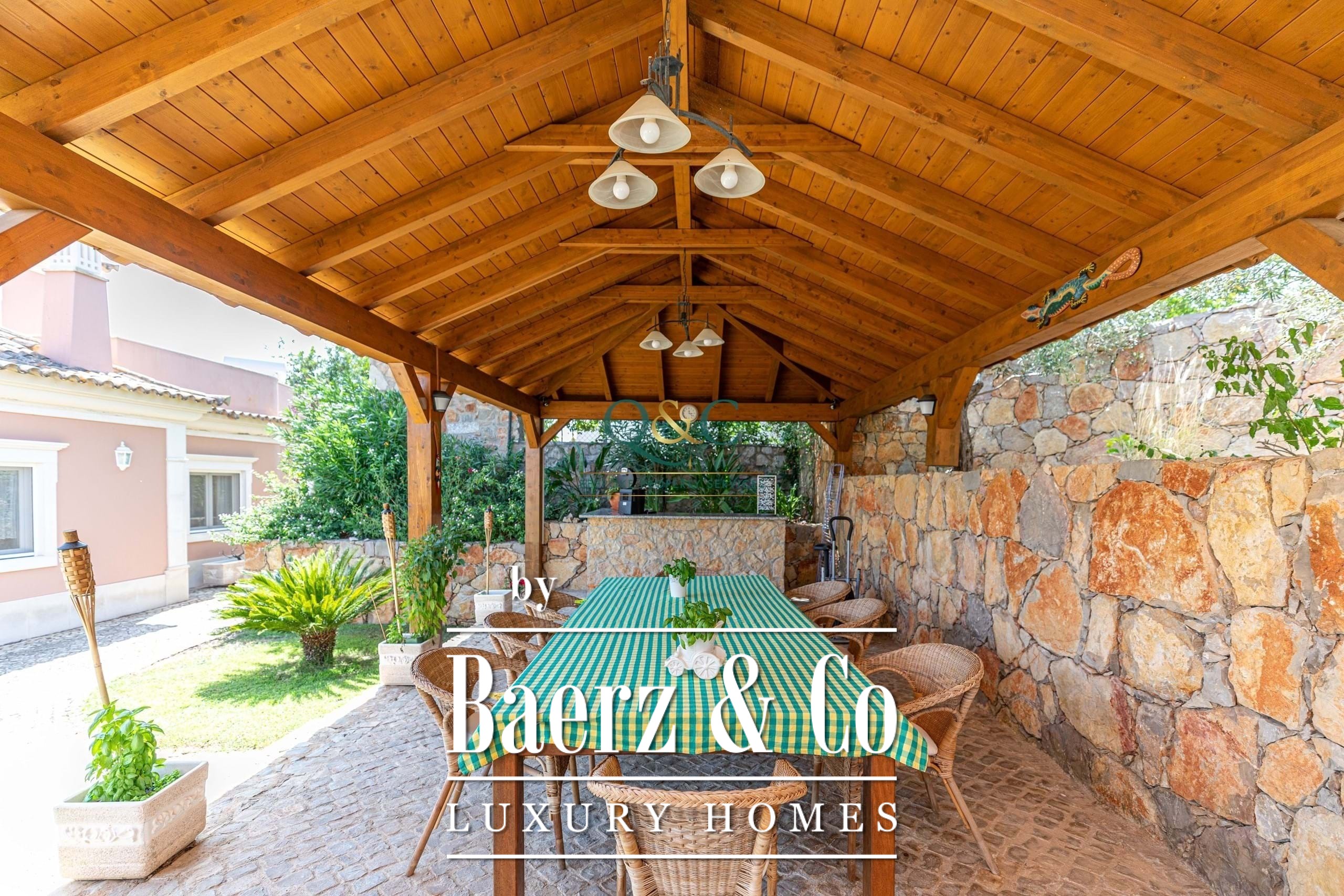 Outside, you can enjoy the fully walled stone grounds, which provide security and privacy, Portuguese cobblestone paving around the house, a 9x4m swimming pool, beautifully presented and maintained green spaces, and summer meals under the beautiful custom-made wooden pergola with outdoor kitchen, bar and barbecue.