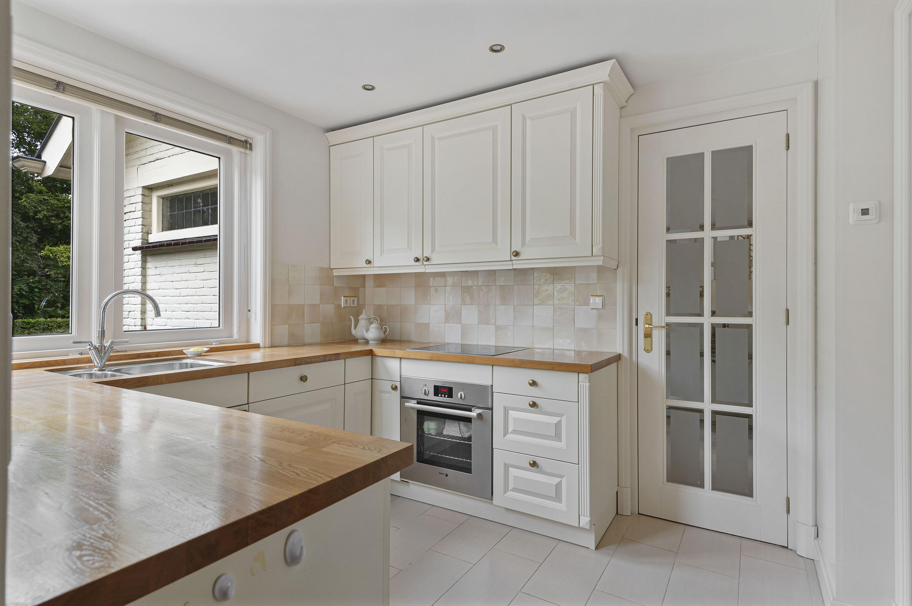 Entrance into very spacious hall, attractive stained glass windows, toilet and sunken wardrobe. The living room is arranged in L-shape, has lots of light, attractive gas fireplace and has a beautiful wooden parquet floor. The conservatory and second living room were later built so there is a lot of extra space created which gives multiple possibilities. The conservatory and second living room have a neat tiled floor with underfloor heating. The kitchen is located at the front of the house which also provides access to the spacious utility room.