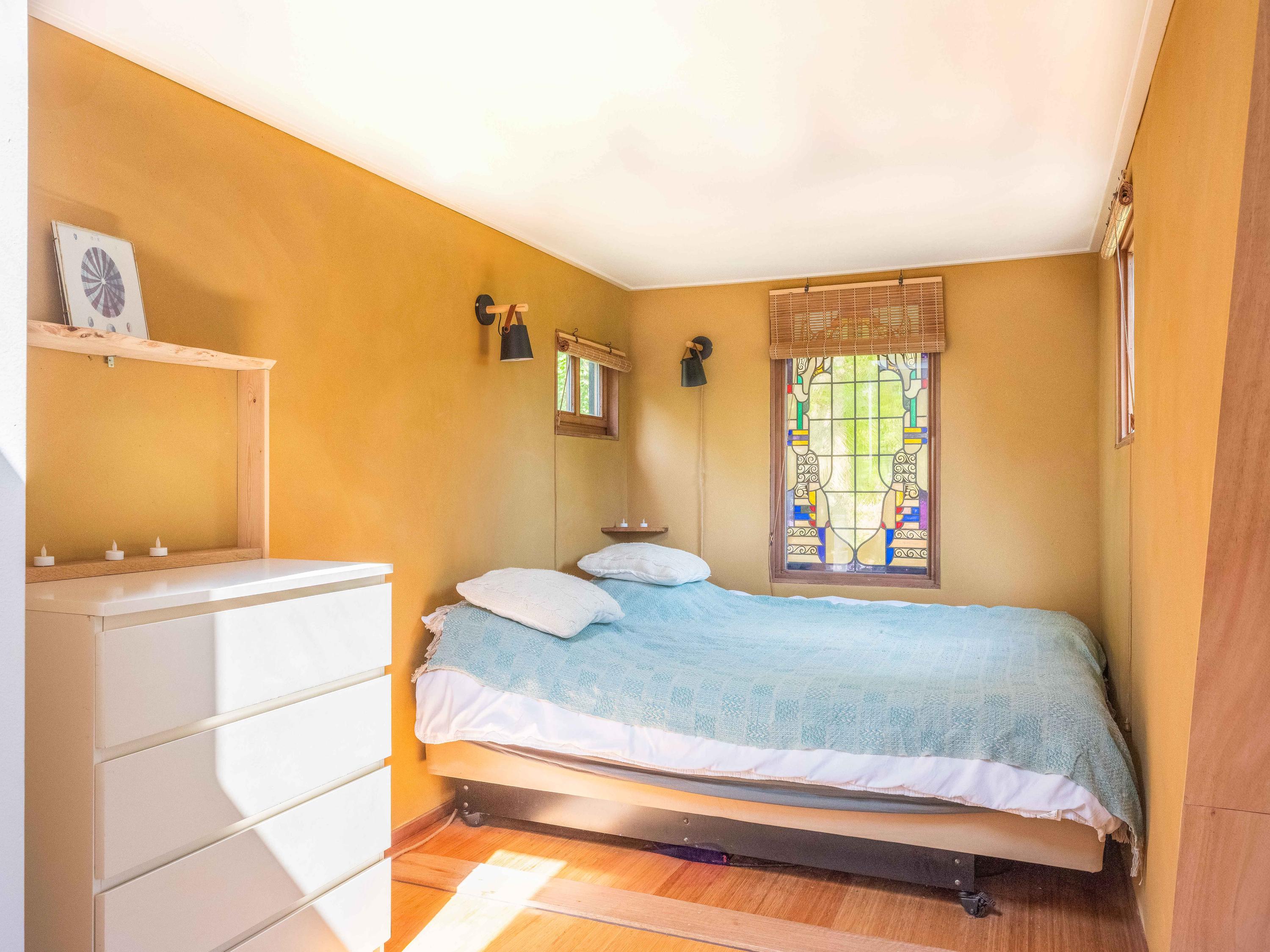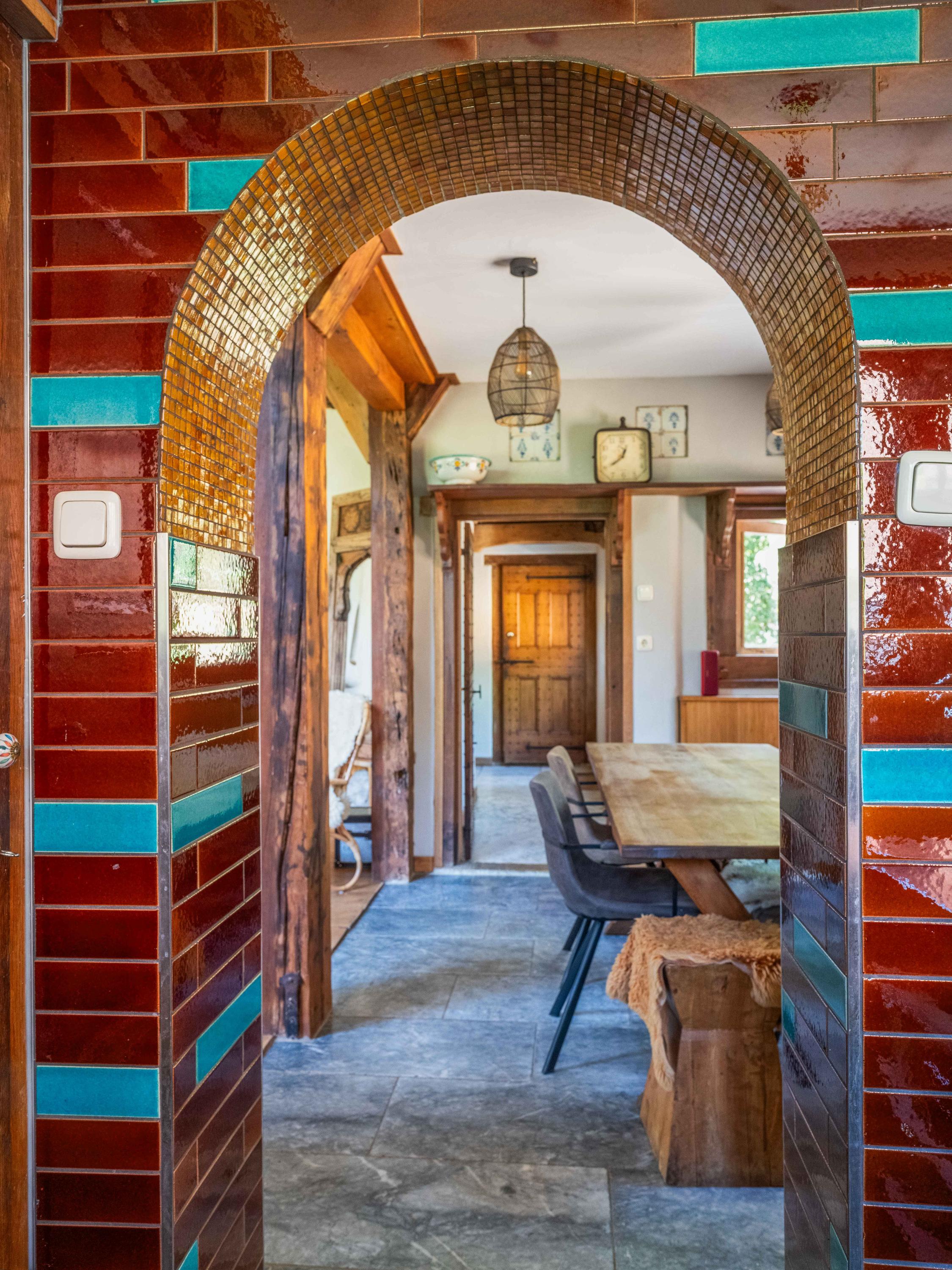 Upstairs, the spacious landing leads to two bedrooms with built-in wardrobes and a modern bathroom finished in tadelakt, complete with a toilet, bathtub, sink, and shower. It’s also wonderful to see how the original beams have been left visible, adding to the authentic atmosphere.