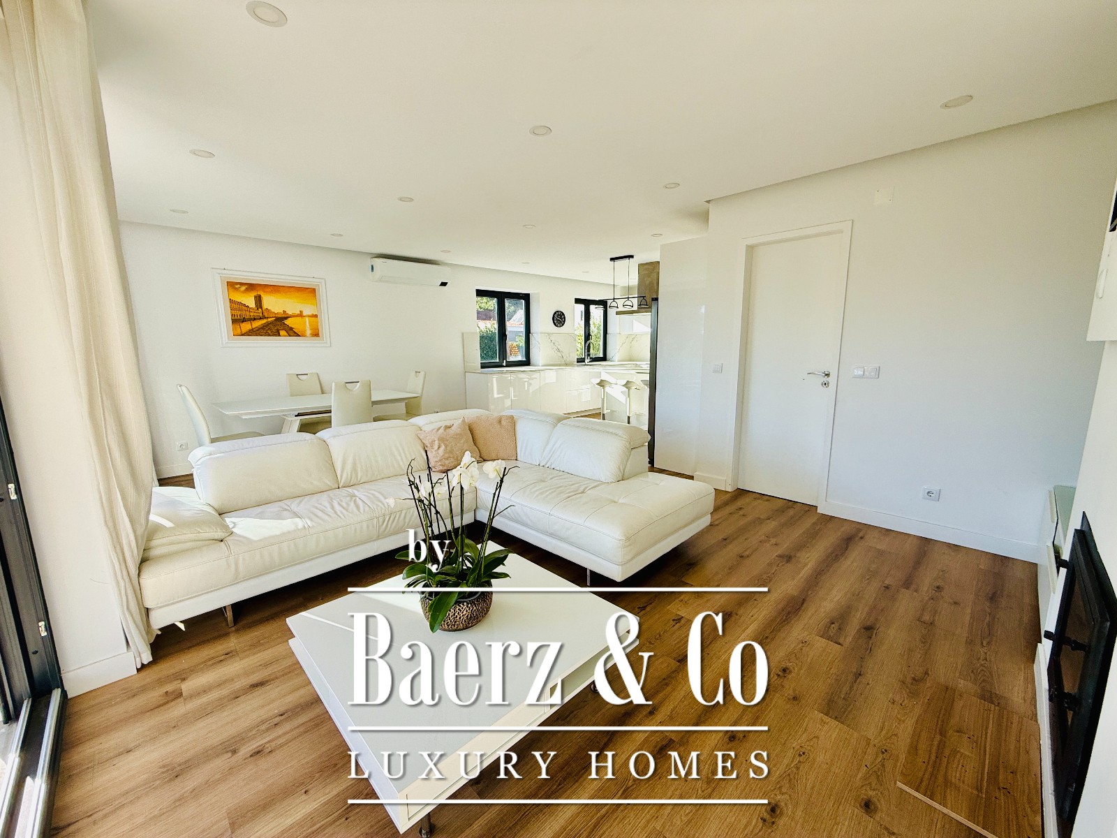 This house Sintra harmonizes contemporary renovation with a sense of privacy and calm, occupying 357 m² on an 868 m² plot. Natural light moves from east to west throughout its three levels, each thoughtfully arranged for both family life and quiet retreat. The ground floor offers a guest bedroom, additional bedroom, storage with a window, a laundry room, and an internal garage for one car. Upstairs, an American-style kitchen with a double refrigerator supports entertaining and everyday rhythm. The adjoining dining and living spaces feature a fireplace and open onto a terrace that leads directly to the heated swimming pool and garden. Two bedrooms on this level provide fitted wardrobes and are served by a well-appointed bathroom. The upper floor holds a principal suite with a walk-in closet and private bath, another suite with wardrobes, and an extra room for flexibility. Air conditioning throughout ensures comfort in every season, with the living spaces quietly set along a tranquil street. From here, Tasis School is ten minutes away, Caisl School twelve minutes, and the center of Lisbon within twenty-five kilometers, connecting daily life to the best of Sintra and the Portuguese capital. This house for sale in Sintra brings together refined practicality with understated elegance.