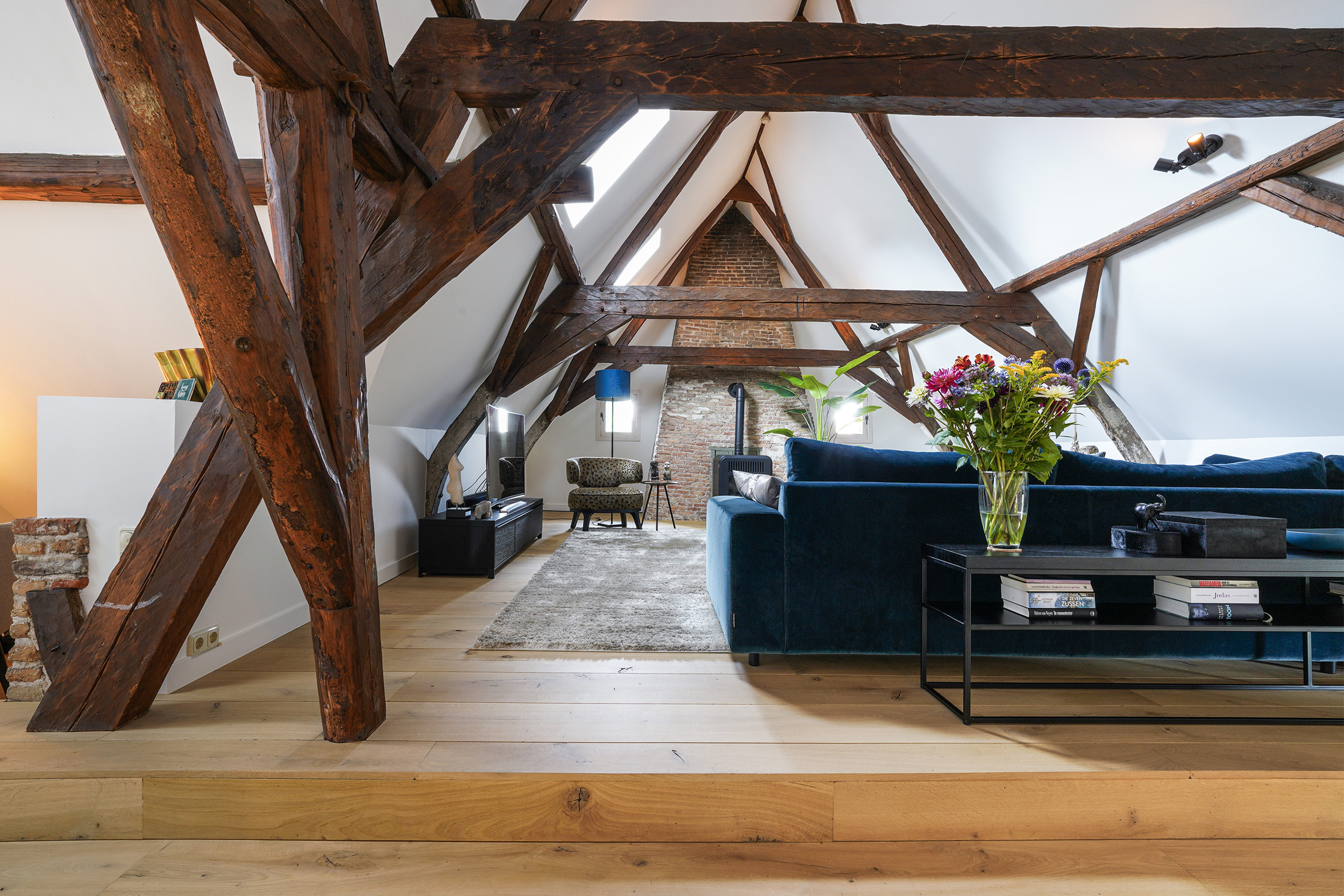 The living room, measuring nearly 90 m², feels even more spacious thanks to the high vaulted ceiling. The roof is insulated and beautifully finished with white plaster between the sturdy wooden beams. Combined with the height differences, the wooden floor and the pellet stove, the result is a living area that feels both grand and inviting.