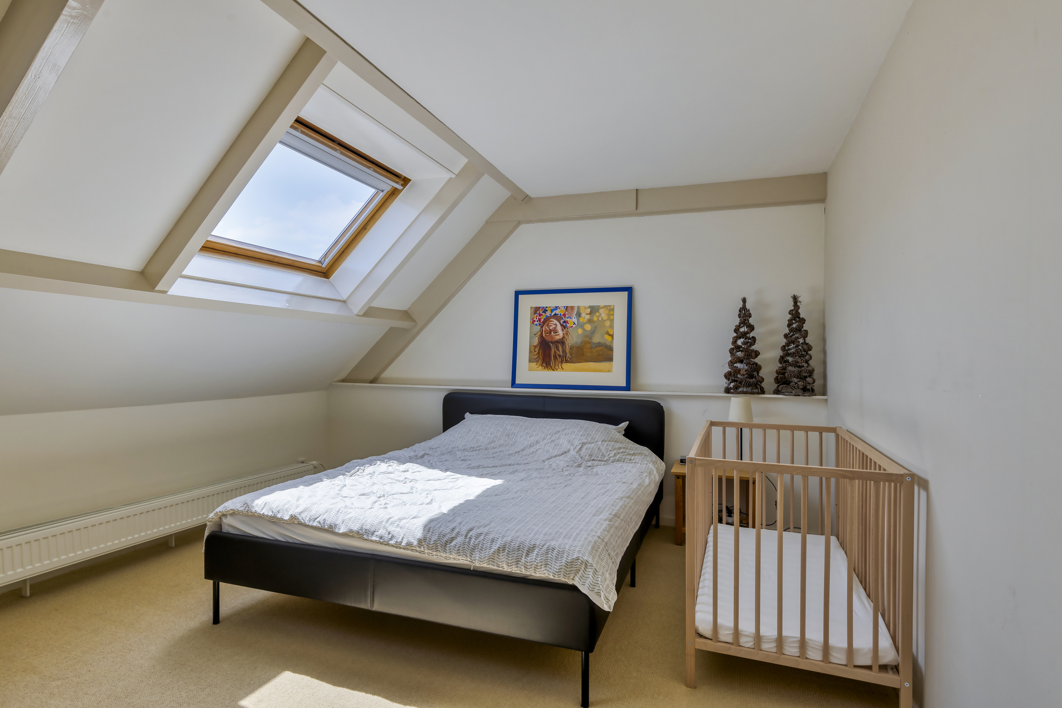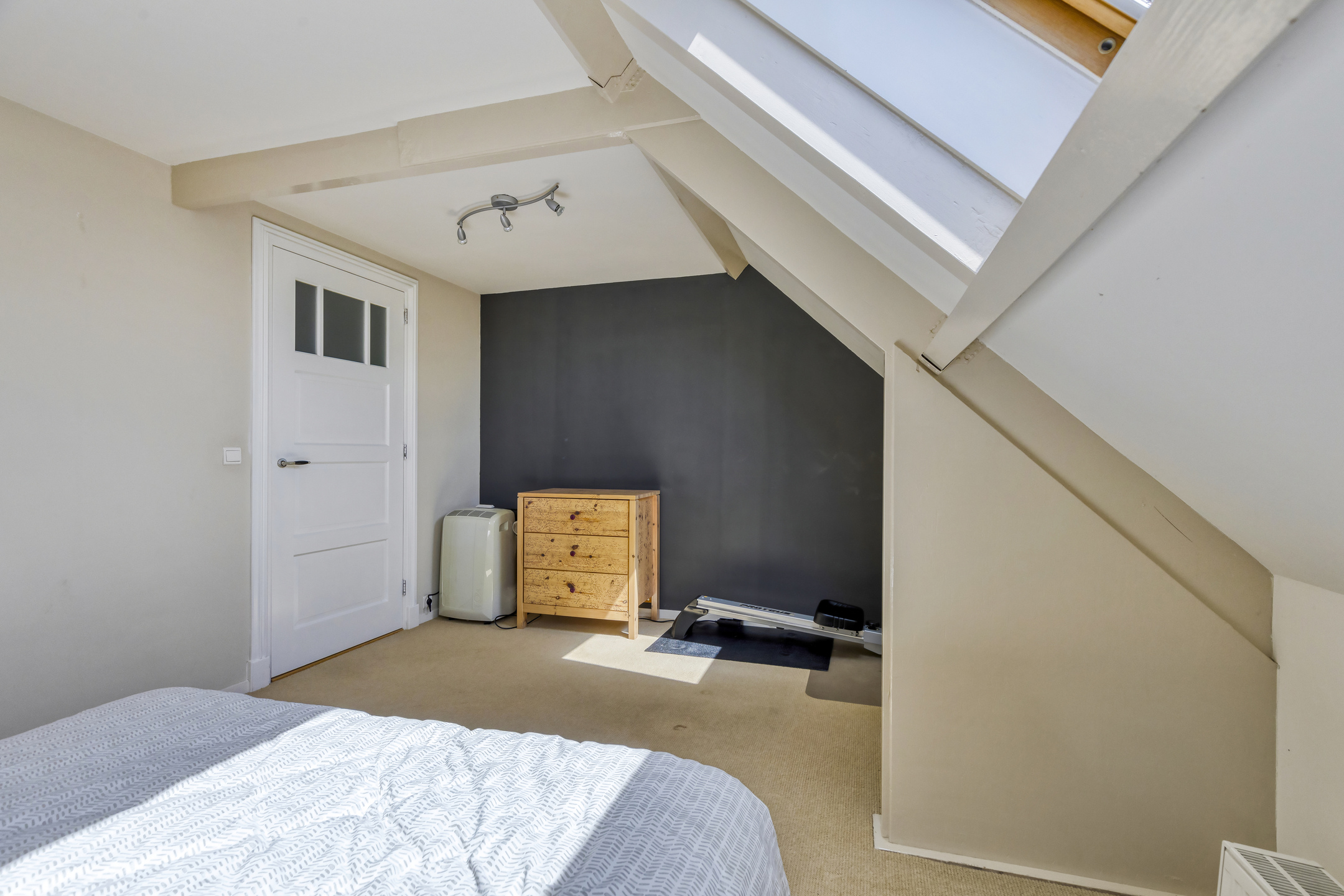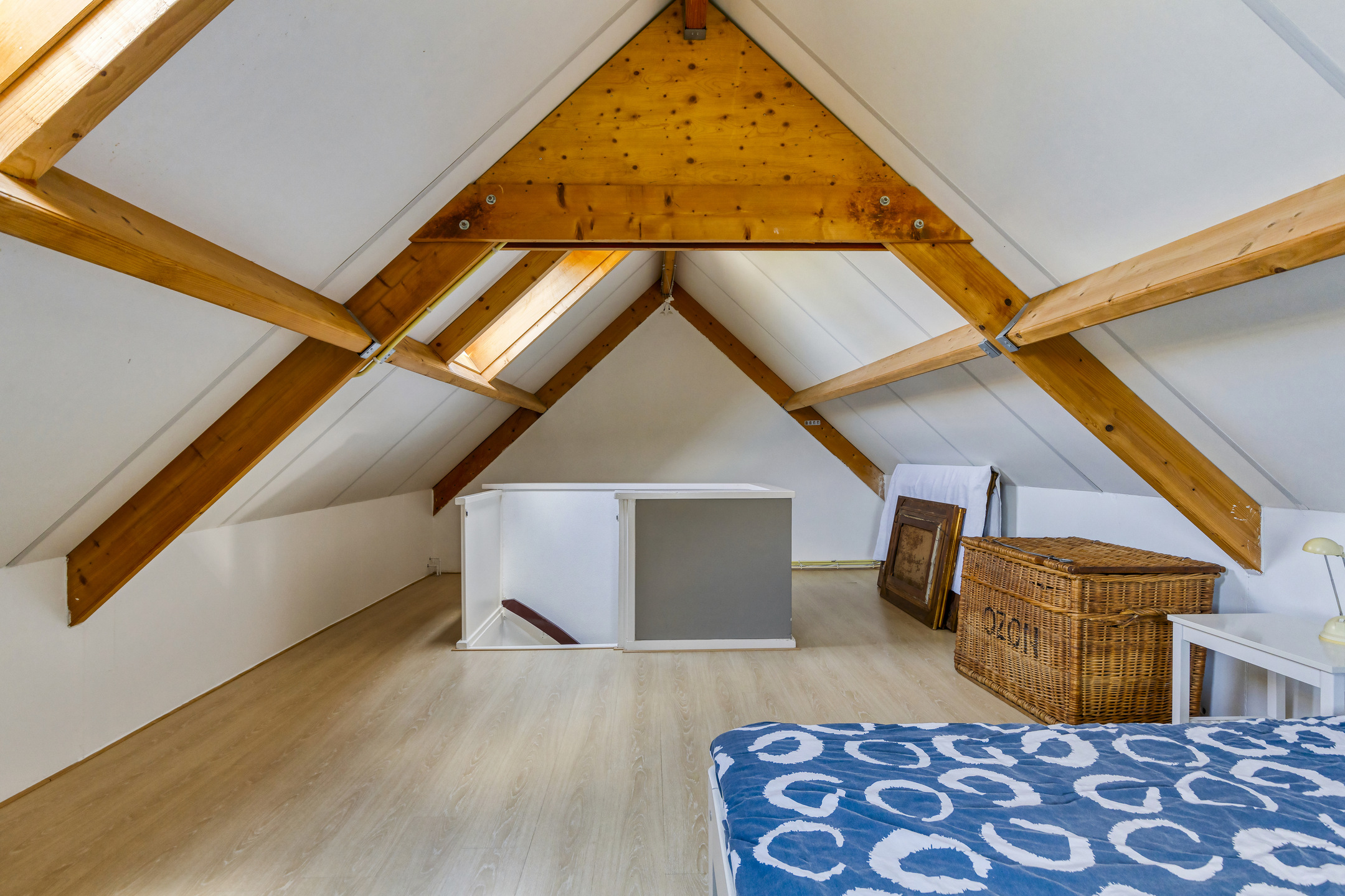 slaapkamer (boven werkkamer), met 2-tal dakramen, wandafwerking stucwerk, laminaatvloer, dakbeschot (geïsoleerde dakplaten) in zicht;