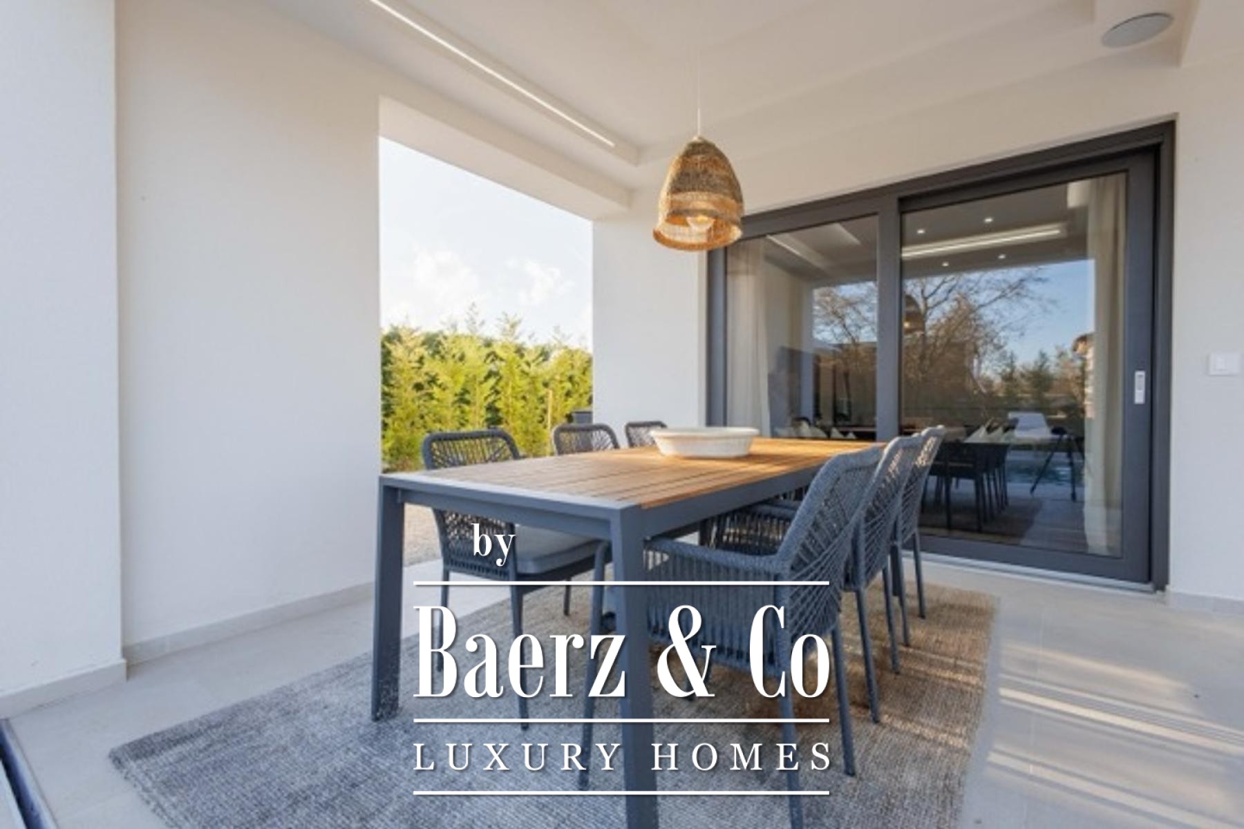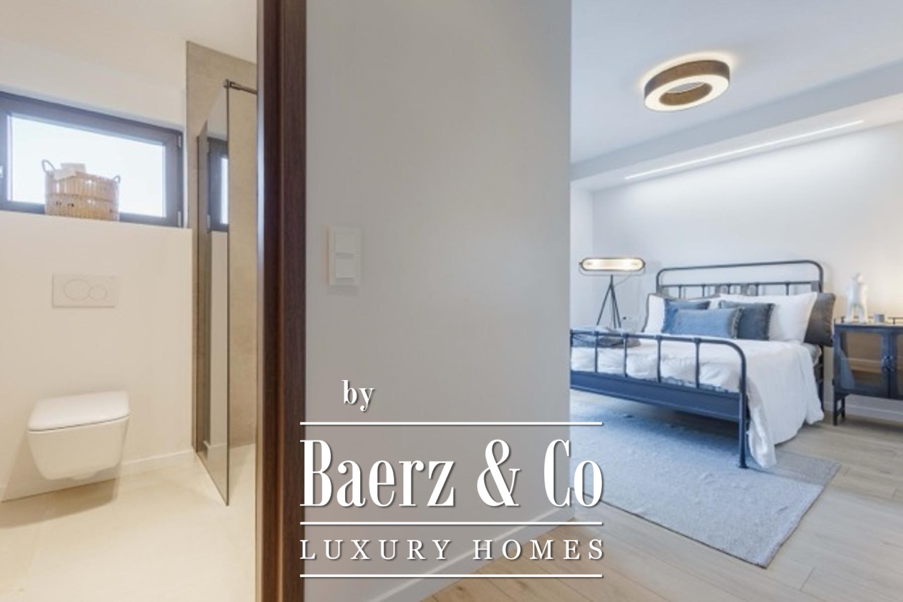 A carefully detailed staircase leads to three spacious bedrooms upstairs, all with en-suite bathrooms and access to a sun-drenched terrace overlooking the landscaped garden and a striking saltwater pool measuring 9 by 11 meters. Large windows showcase the surrounding natural beauty, offering a constant dialogue between interiors and the outside world. The courtyard provides ample parking, reinforcing practicality alongside luxury.