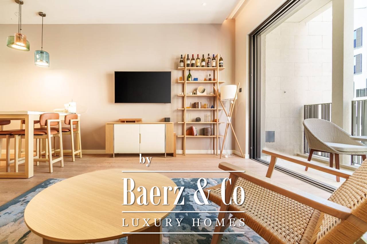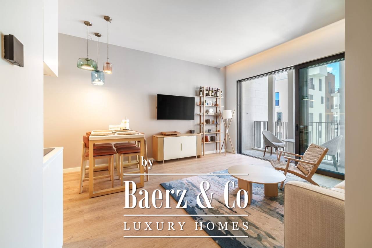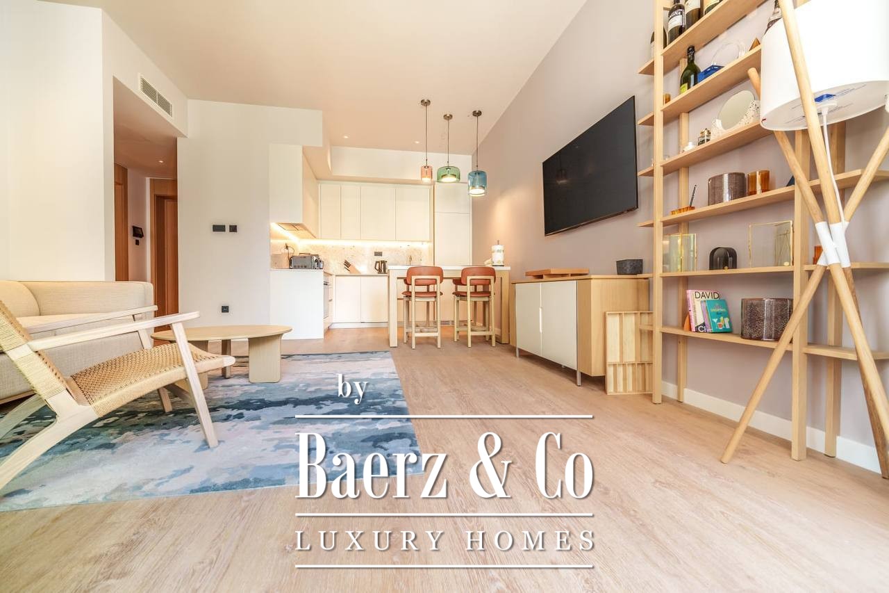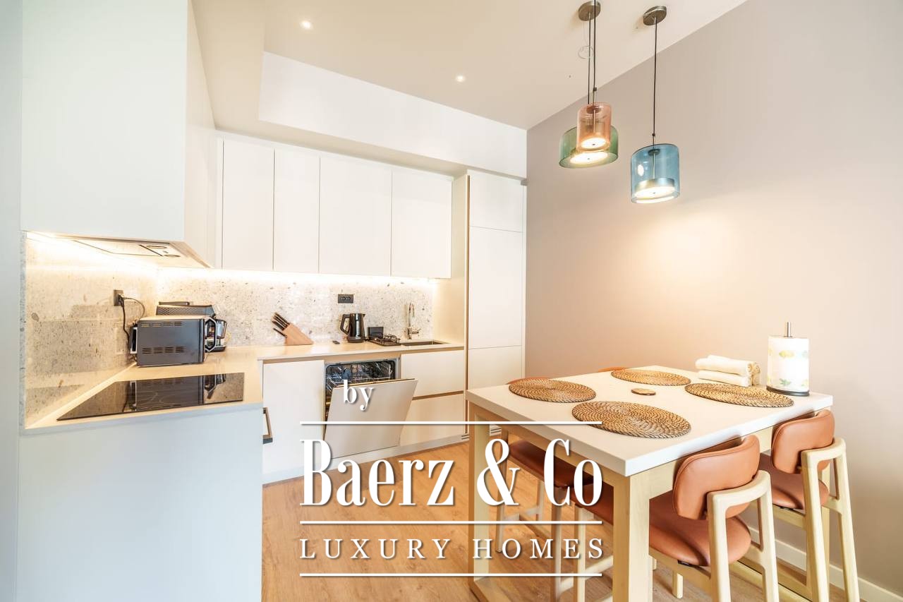 The layout is designed for clarity and calm, with a hallway leading to a luminous living area, a modern kitchen and dining space, one bedroom, and a well-appointed bathroom. The apartment is fully furnished, ready for immediate occupancy or as a refined rental investment. Throughout, clean lines and ample light set the tone for contemporary living.