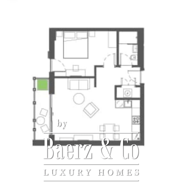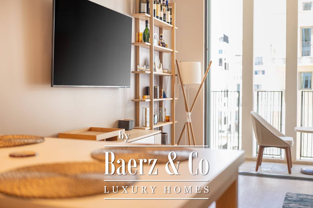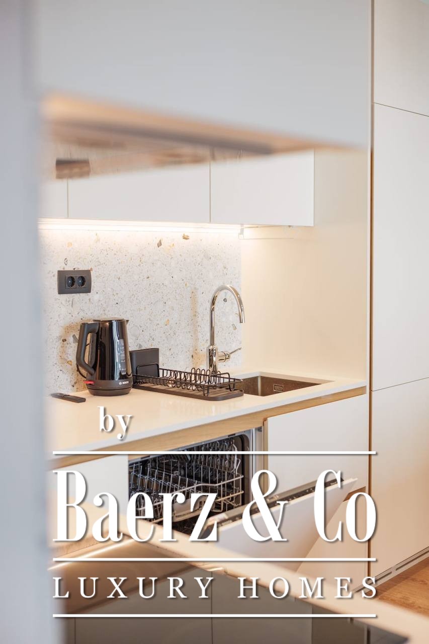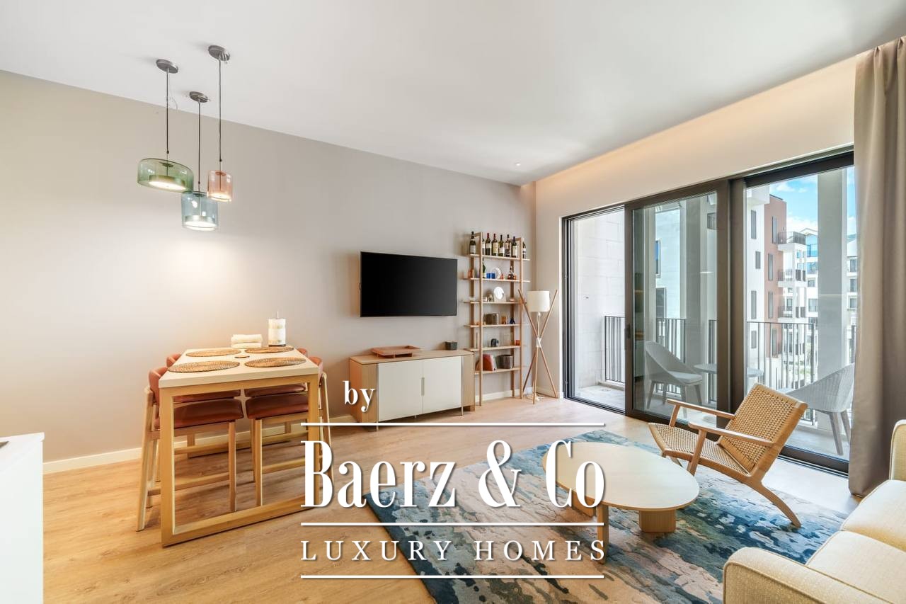 The layout is designed for clarity and calm, with a hallway leading to a luminous living area, a modern kitchen and dining space, one bedroom, and a well-appointed bathroom. The apartment is fully furnished, ready for immediate occupancy or as a refined rental investment. Throughout, clean lines and ample light set the tone for contemporary living.