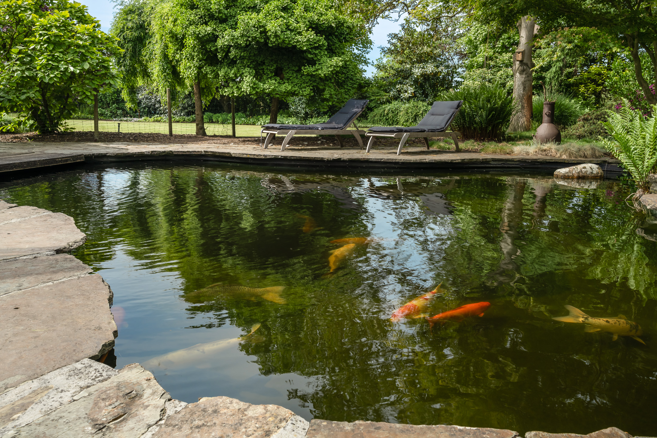 Landscaped grounds with pond, orchard, and multiple outbuildings