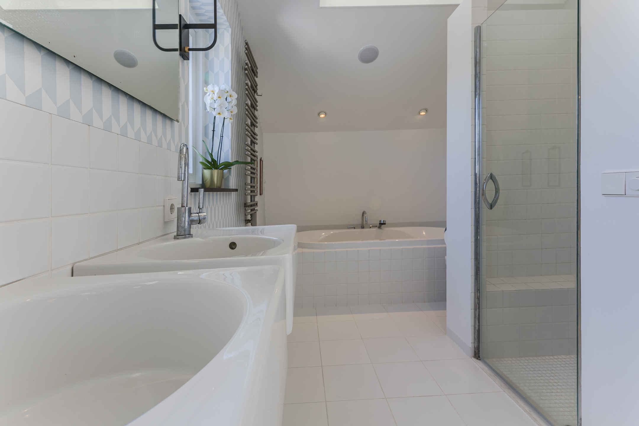 The tiled bathroom features underfloor heating, a bathtub, walk-in shower, wall-mounted toilet, washbasin, mirror heating, and adjustable mechanical ventilation.