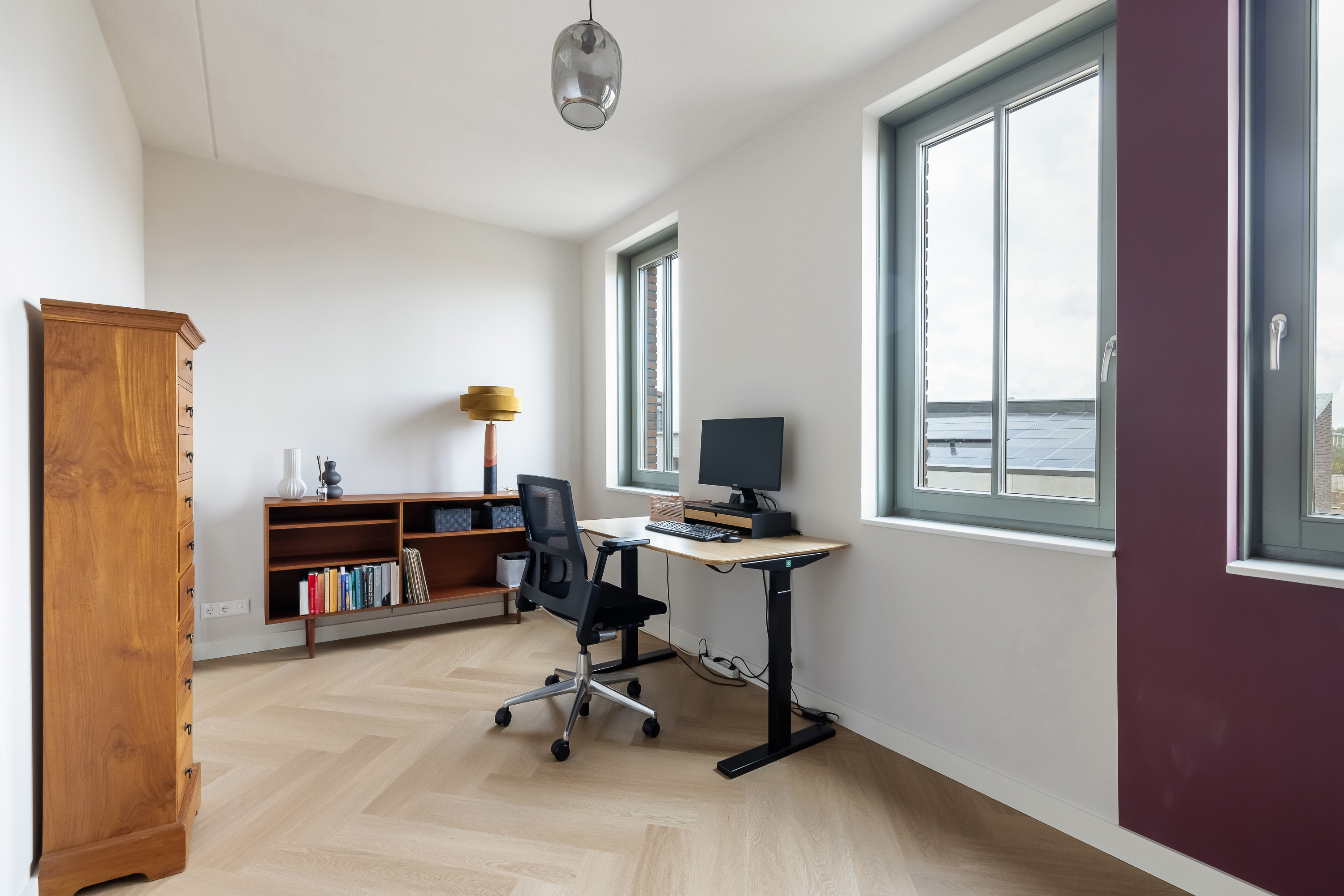 Zodra je binnenkomt, valt alles samen. De hoogte van de voorkamer is indrukwekkend. Met bijna vijf meter tot het plafond voelt deze ruimte groots, licht en vrij. De ramen lopen helemaal door tot boven en laten het daglicht op een bijna theatrale manier naar binnen vallen. Dit is zo’n ruimte die je niet hoeft in te richten, die vertelt zelf al een verhaal. Een plek waar je muziek maakt, yoga doet, werkt, speelt of gewoon even zit en naar de lucht kijkt terwijl de kleuren van de dag veranderen.