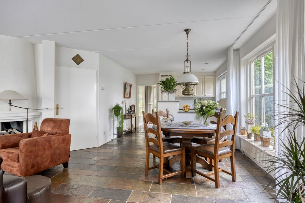 The garden all around is immaculately maintained. At the front, the wide driveway offers parking for multiple cars; under the carport your car is sheltered. From here you also have direct access to the garage, with overhead door and side door—a particularly spacious and multifunctional area of no less than 57 m². Ideal for daily use, safely storing bicycles, carrying out DIY projects, or setting up a large work or hobby room with its own entrance. The rear garden is a delight: a large sun terrace with decorative paving, manicured lawn, a pond, and borders full of color and variety. Thanks to mature hedges, trees, and the woodland to the rear, you’ll enjoy peace and privacy. Whether you want to have breakfast outdoors, read under the tree, or host guests on a summer evening—you can do it all here. With direct access from the living room, utility room, and garage, the garden is also extremely practical in layout.