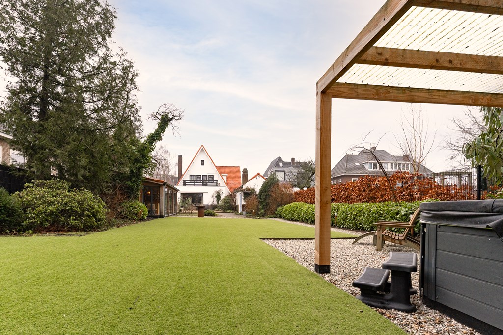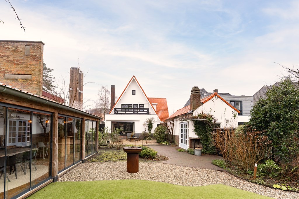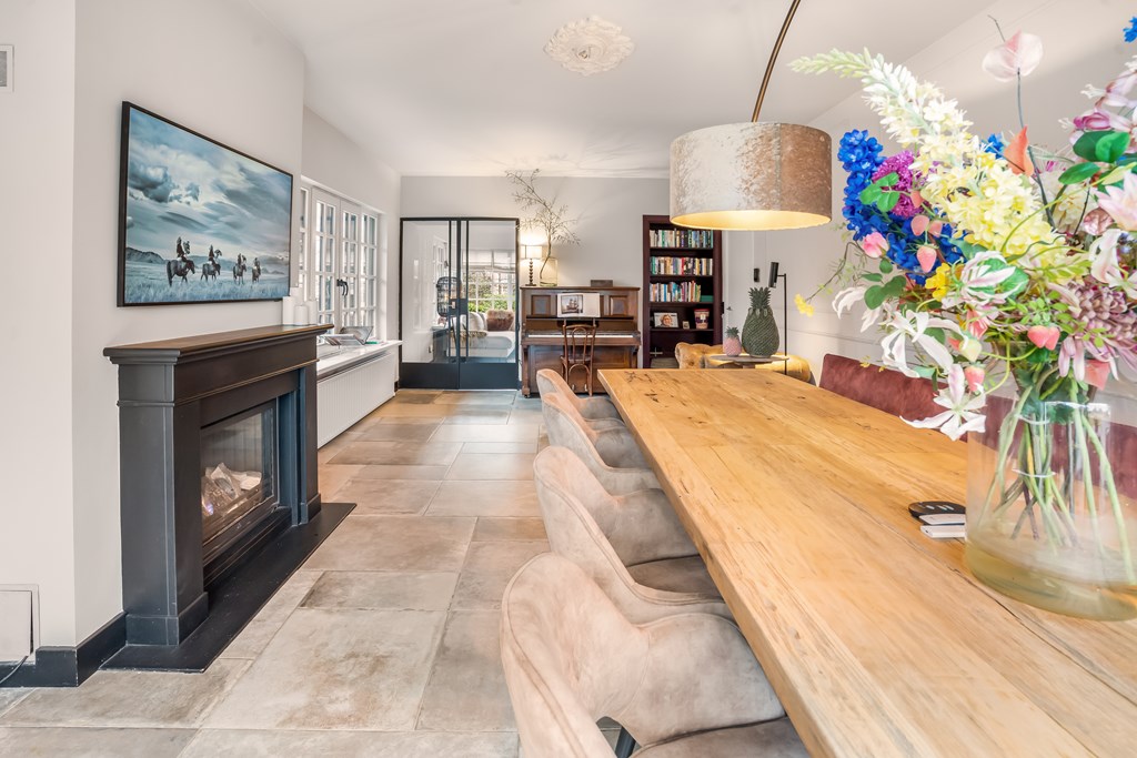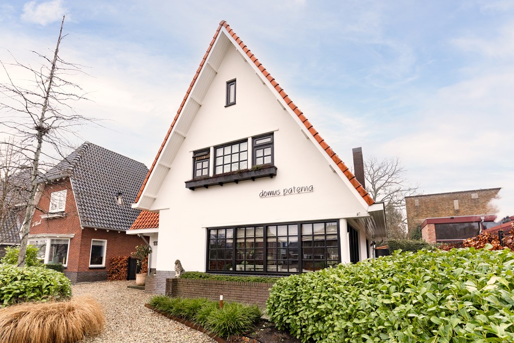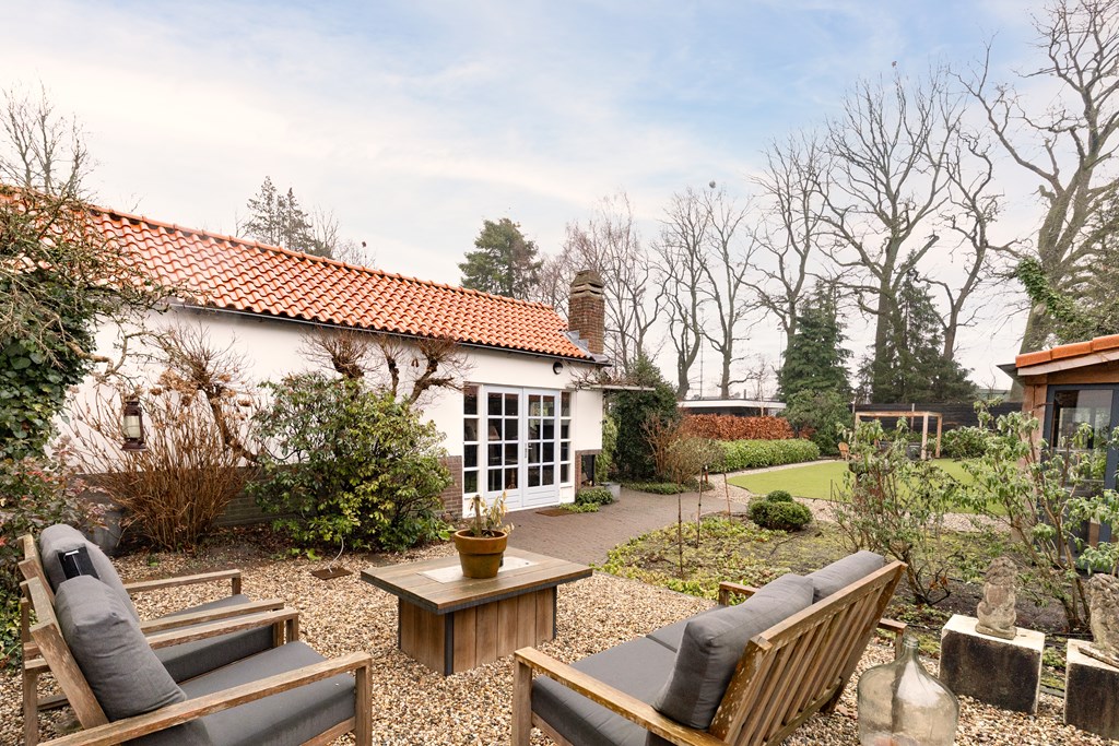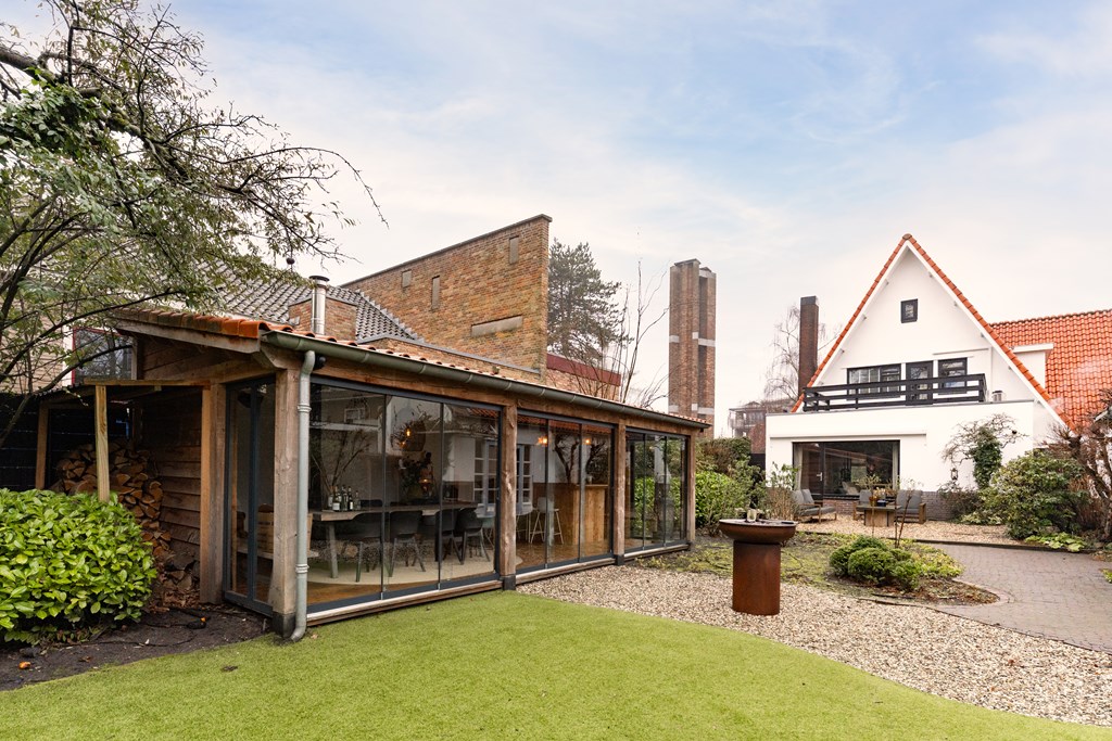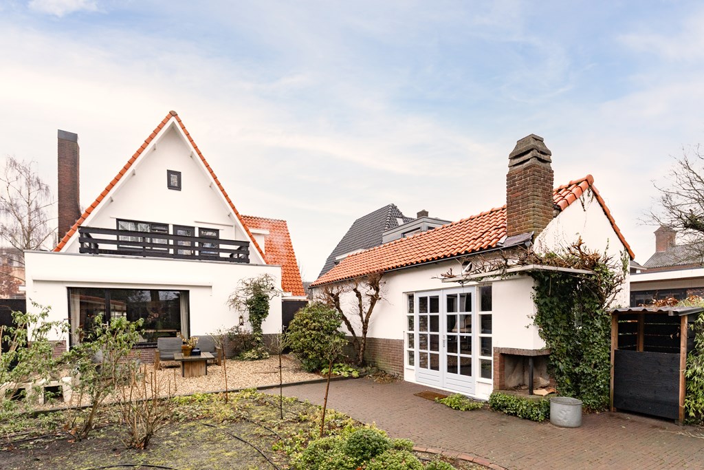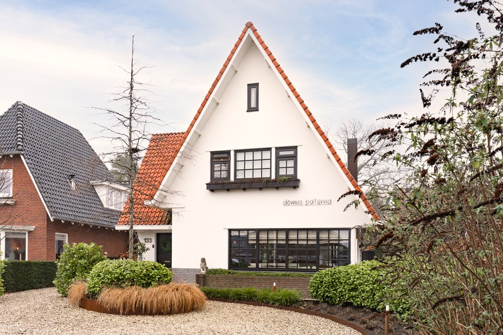 Villa Veenendaal stands as a testament to thoughtful restoration and bespoke craftsmanship. This 1937 villa, 'Domus Paterna', is gracefully set along Kerkewijk, offering 160 m² of living space and a generous plot of 1,043 m². The property exudes authenticity, with features such as a vestibule, original glass-in-lead, a living room en-suite, and a staircase with a landing. Expanses of light and classic finishes define each room, while a modern veranda with wood stove and bar overlooks lush, landscaped gardens for privacy and outdoor enjoyment.