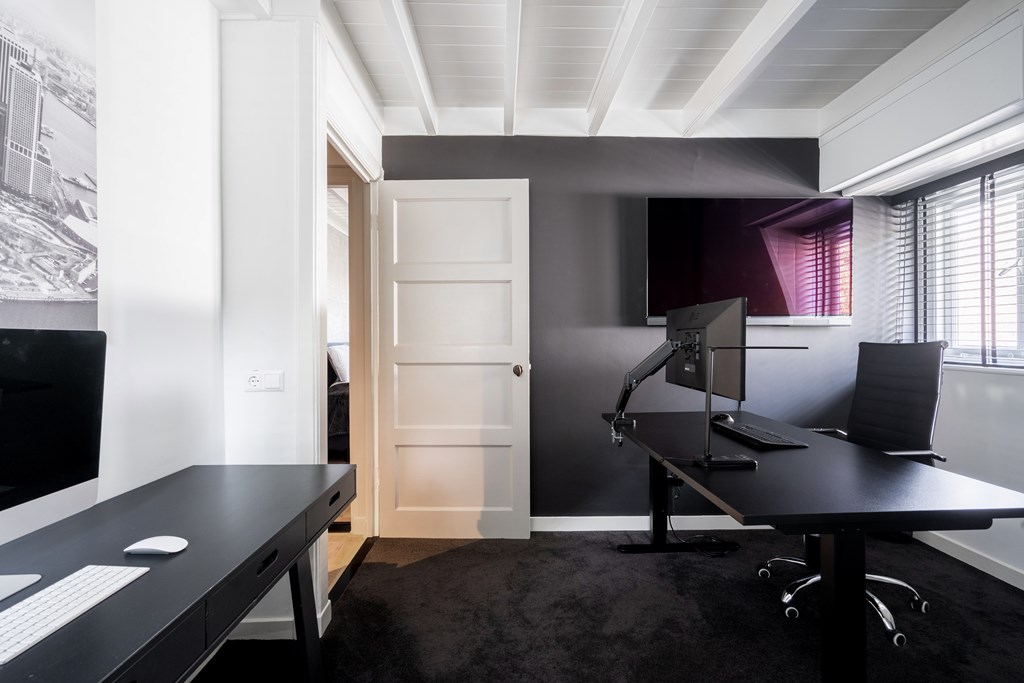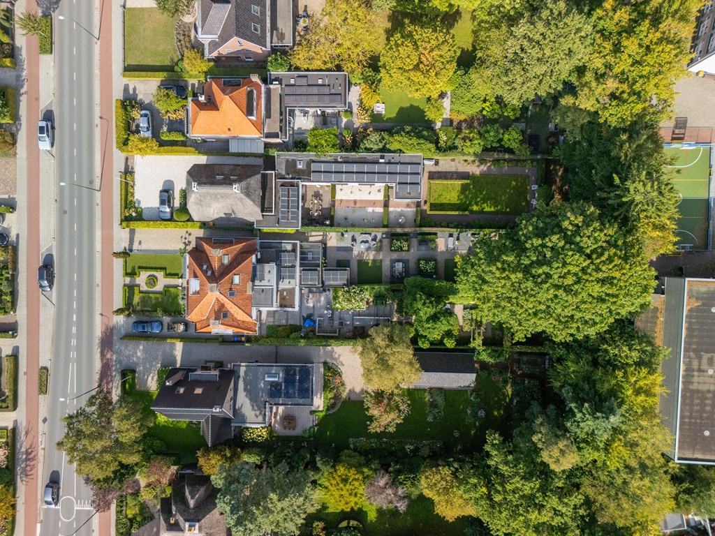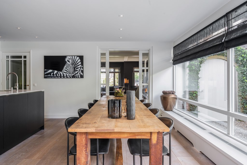Aan de achterzijde bevindt zich de royale eethoek, voorzien van airconditioning, met directe toegang tot de moderne keuken. Deze is uitgerust met diverse hoogwaardige inbouwapparatuur, waaronder een Miele stoomoven en tweede oven, inductiekookplaat, Quooker en een ruime Liebherr-koelkast. Aansluitend treft u de bijkeuken met extra bergruimte, aansluitingen voor wasmachine en droger, en toegang tot de achtertuin.
