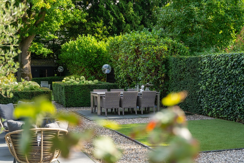 De achtertuin is verzorgd en royaal opgezet; een ideale plek voor gezinnen en liefhebbers van het buitenleven. Met een diepte van circa 45 meter biedt de tuin volop ruimte om te genieten van meerdere zithoeken, zowel in de zon als in de schaduw. De indeling is fraai en functioneel, met kunstgras en kleurrijke bloemenperken die zorgen voor een onderhoudsvriendelijke en sfeervolle uitstraling.