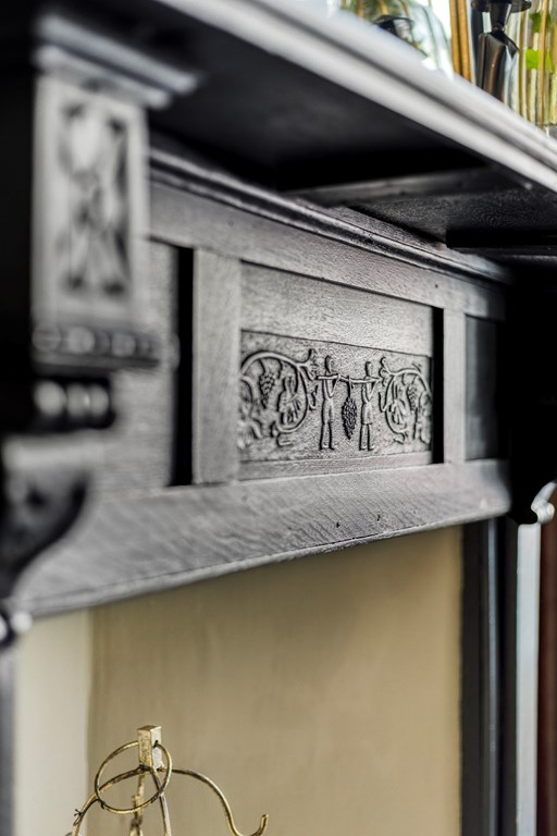 The spacious living room—where the beautiful solid oak herringbone (Hungarian point) floor, tall windows with original shutters, designer custom radiators, and high beamed ceiling immediately catch the eye—perfectly blends modern and classic. The front sitting room is cosy and bright, while the garden-facing dining room also features an original mantel, as does the sitting area. Through the light corridor—past the WC and a storage cupboard with laundry connections—you reach the kitchen. The kitchen itself marries classic and modern, fully equipped with built-in appliances including an induction hob, decorative canopy extractor, oven, and dishwasher. Behind the kitchen is a practical storage room with the fridge–freezer and central heating installation, concealed behind beautiful custom loft doors. A loft ladder provides access to the storage attic, offering plenty of additional space. The entire ground floor is impeccably maintained, finished down to the smallest details, and ready for many years of living and/or working pleasure.