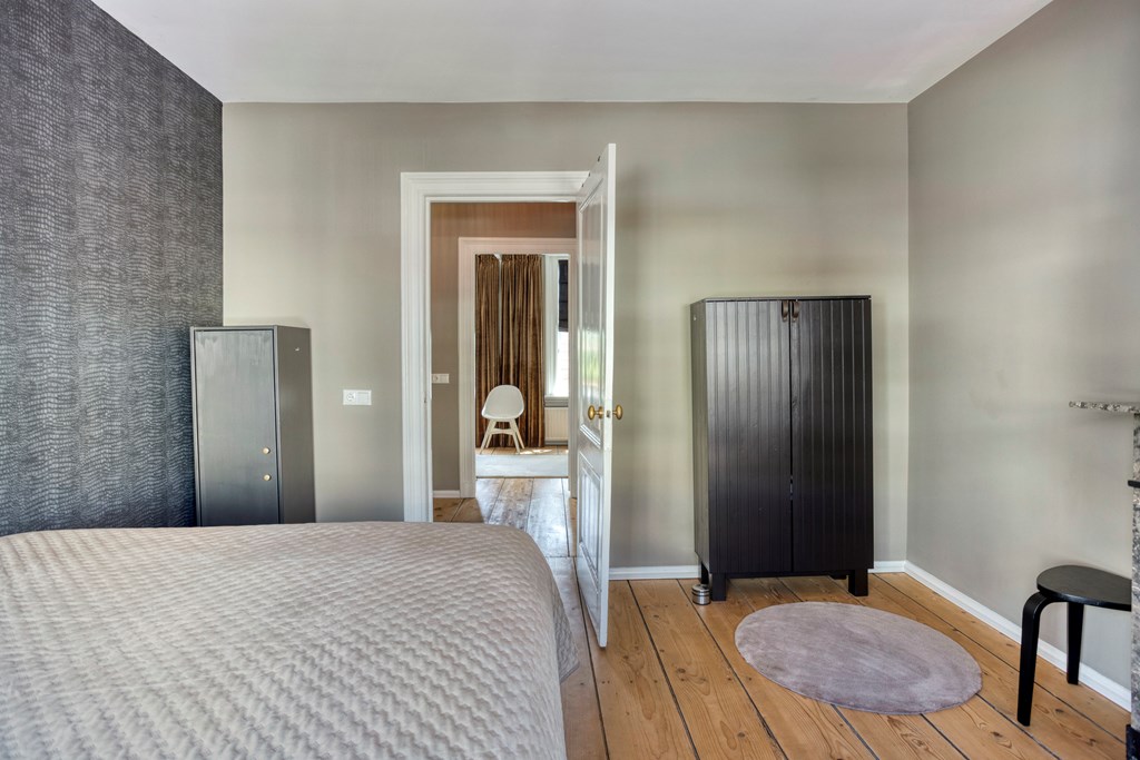The room feels serene—ideal for unwinding after a long day. The other bedrooms are also bathed in light thanks to large windows and retain their original wooden floors. The bathroom is stylishly tiled and equipped with a rain shower, a robust oak vanity with vessel basin and integrated tap, and a second toilet. Everything is done in light, natural tones, creating a fresh, luxurious look.