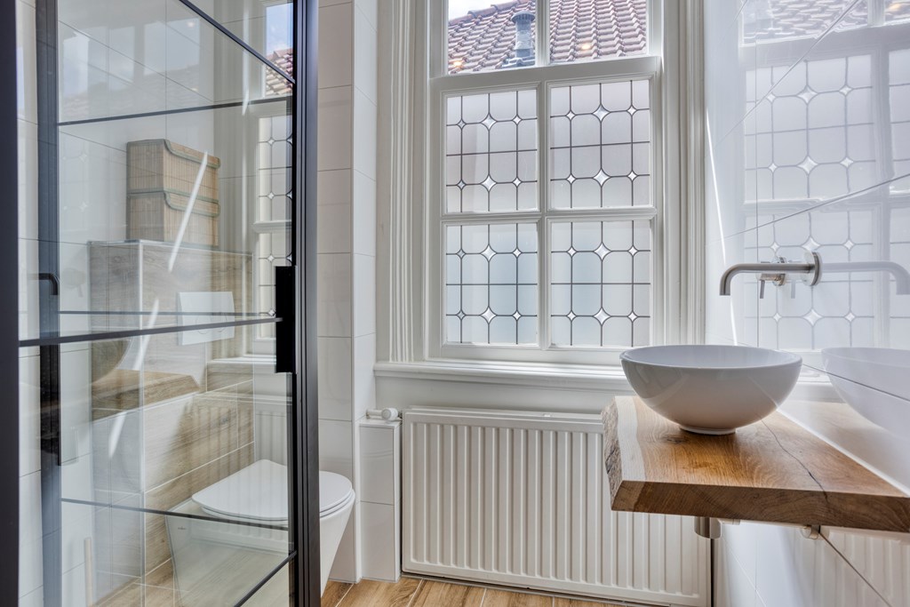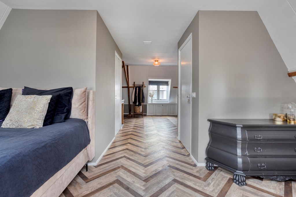 The second floor surprises with a generous, open space and a distinctive layout. The warm ambiance stands out immediately thanks to the fine flooring and the exposed wooden trusses that give this level its unique character and inviting feel. The floor is arranged so that the sleeping area, lounge corner, and work/study area flow into one another. This level also features its own pantry with original terrazzo countertop and a private bathroom, elegantly finished with wood-look floor tiles, white wall tiles, and black beam accents. The bathroom includes a walk-in rain shower, wall-hung toilet, and another vessel basin set on a robust oak top with integrated tap. A wonderfully luxurious addition, making this floor perfect as a home office, self-contained (guest) suite, a loft for one of your children, or your expansive master retreat!