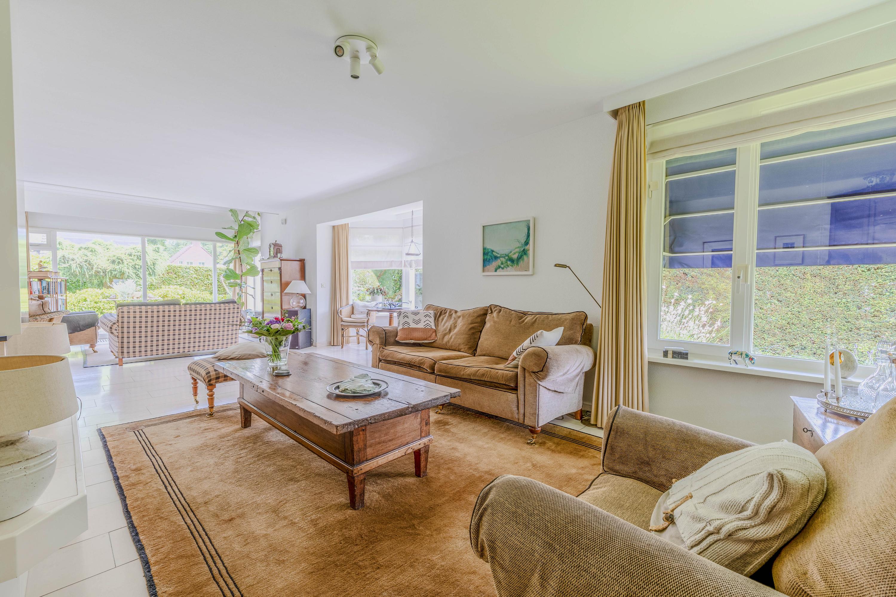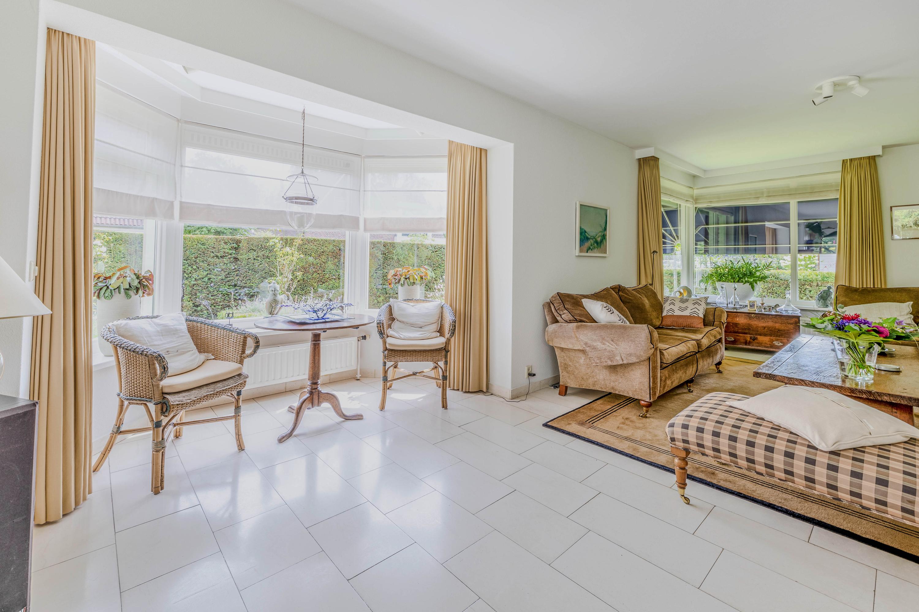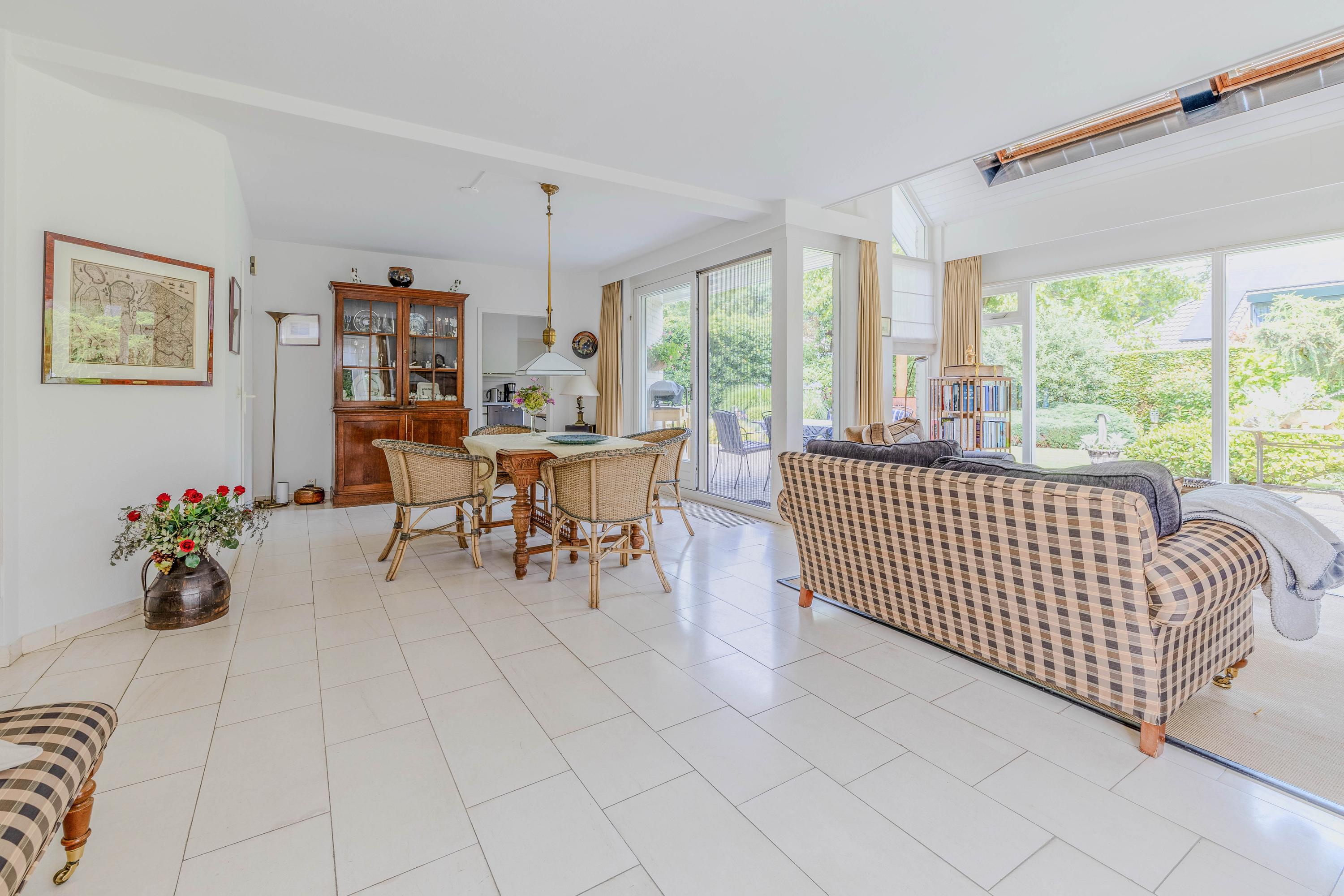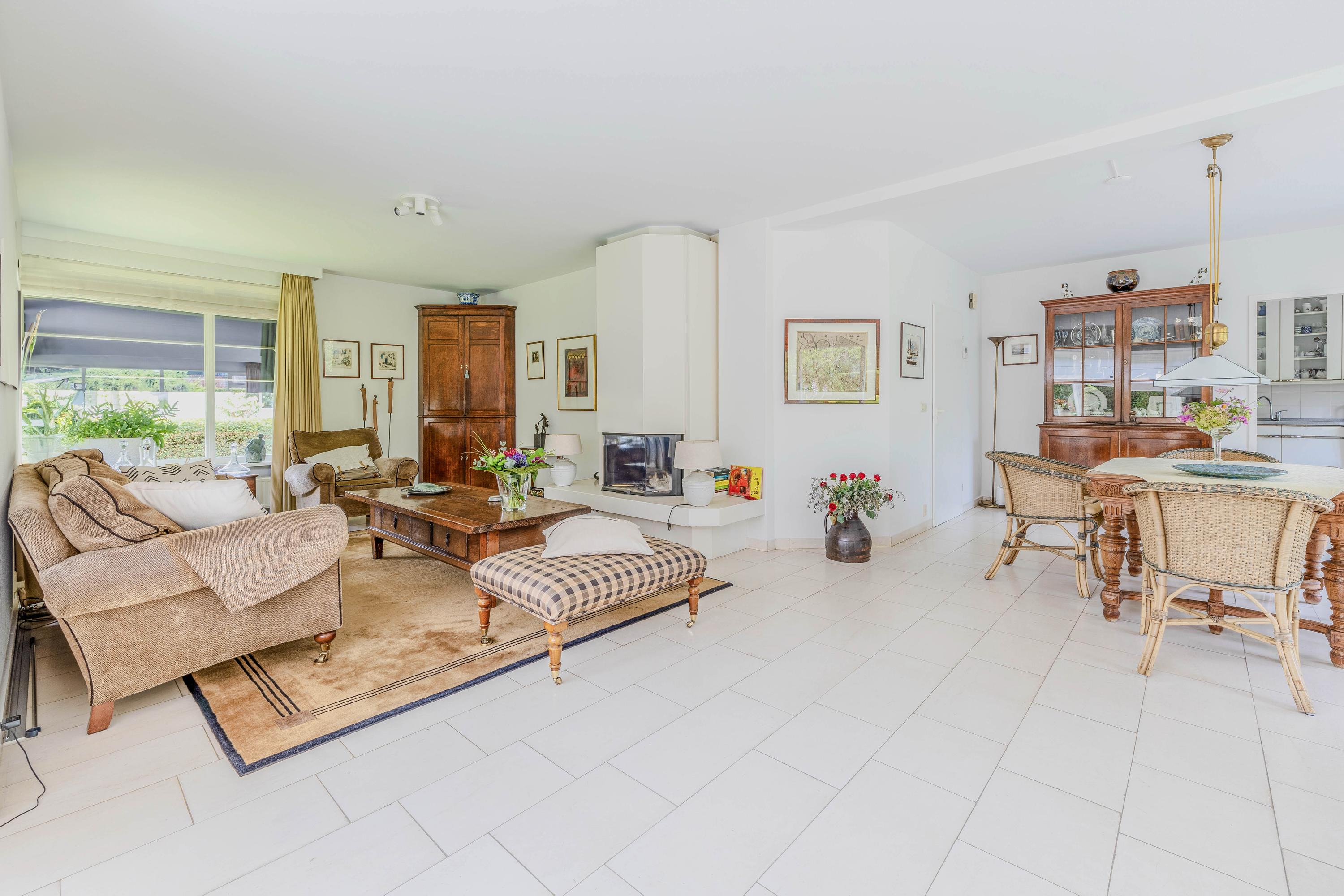 Enjoy a bright and spacious living room of 62 m² with a beautiful view of the landscaped garden. The living room features a bay window, a TV corner with striking architecture highlighted by a roof window, and a fireplace.