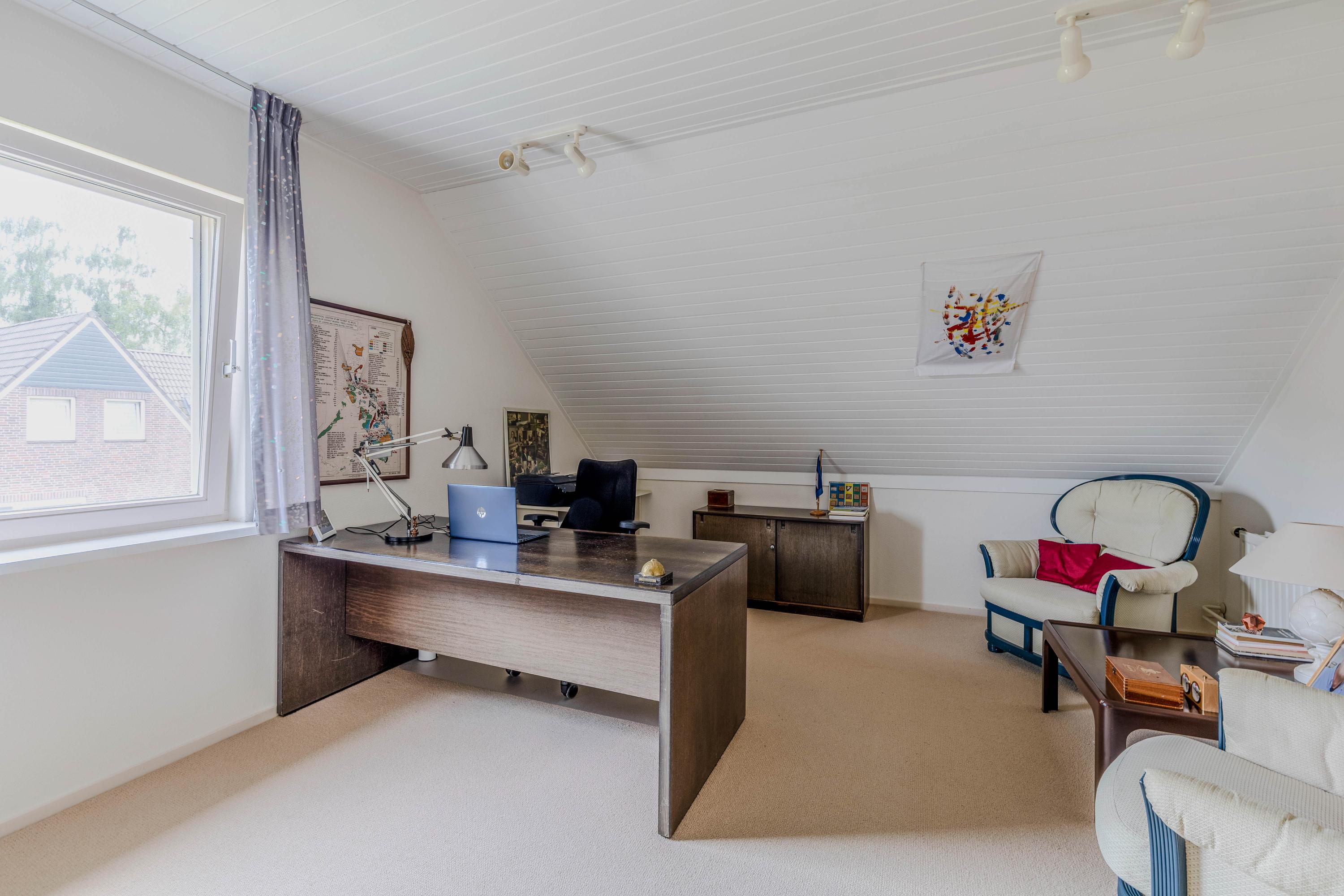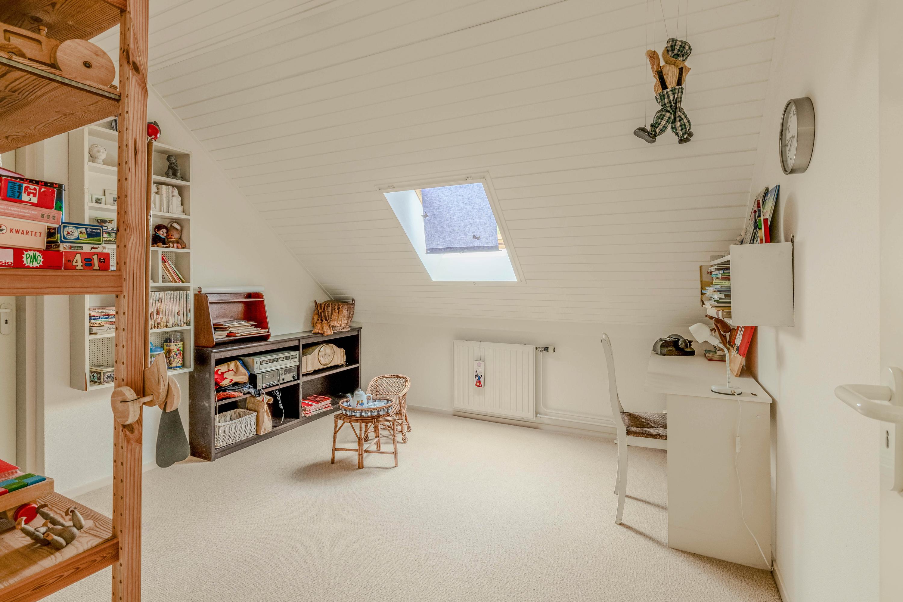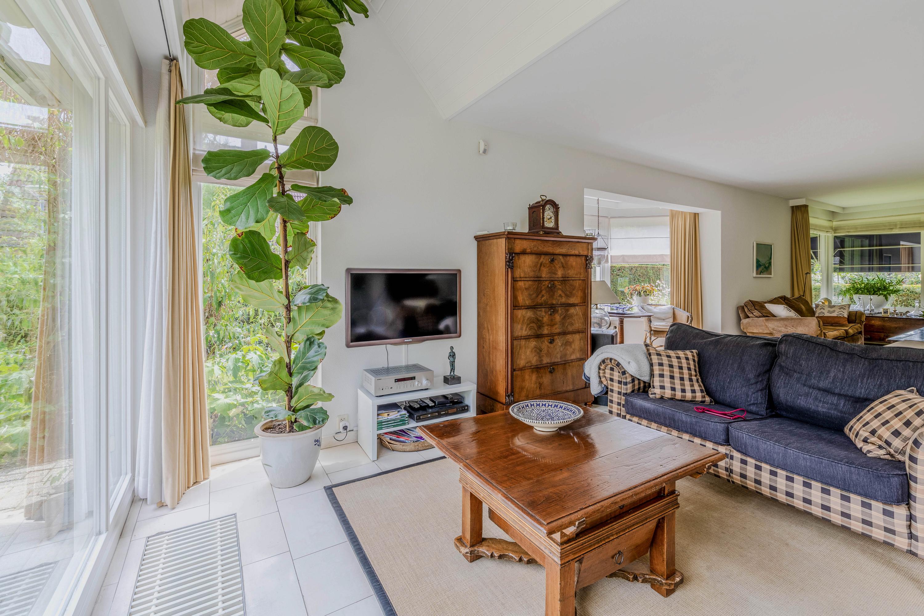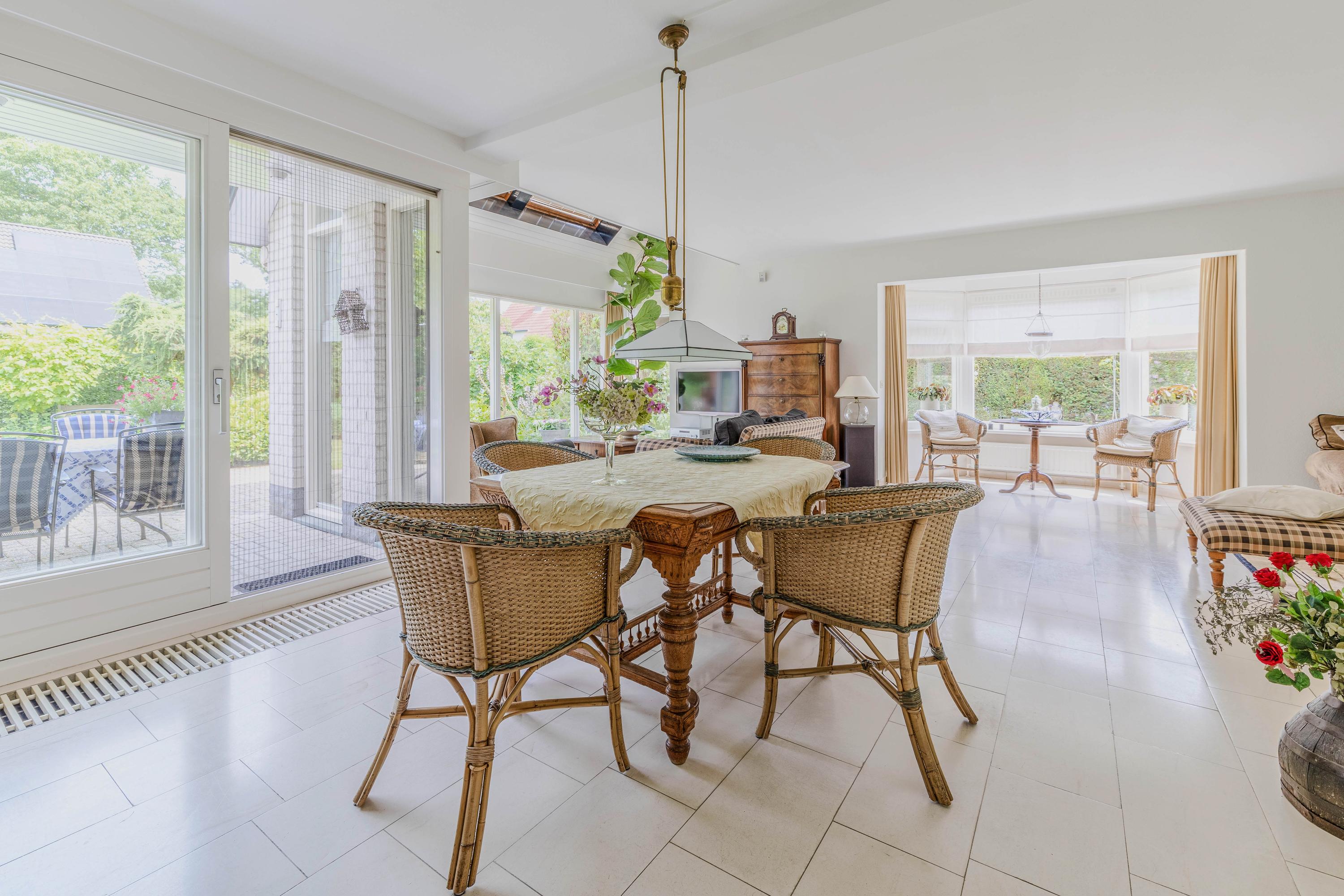 Enjoy a bright and spacious living room of 62 m² with a beautiful view of the landscaped garden. The living room features a bay window, a TV corner with striking architecture highlighted by a roof window, and a fireplace.