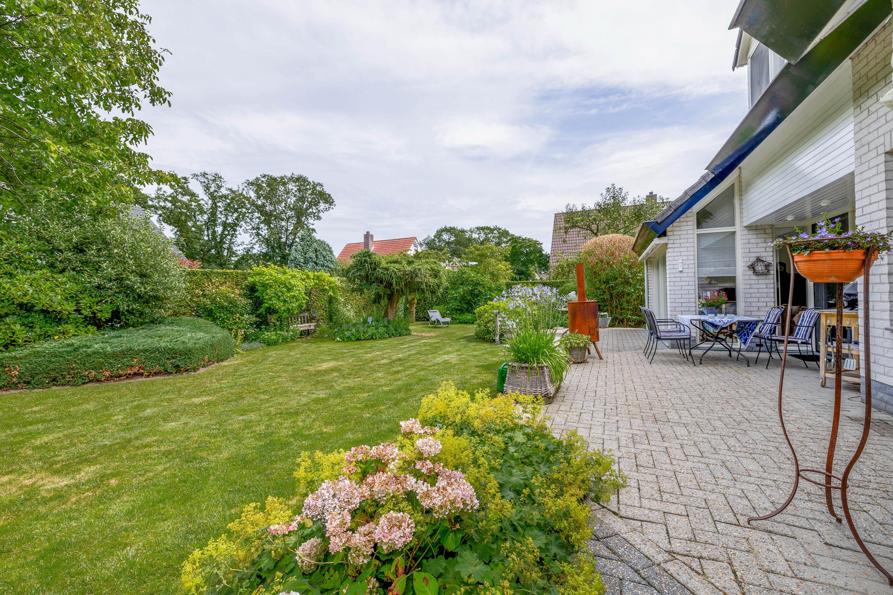 The home boasts a beautifully landscaped rear garden with plenty of greenery and privacy, featuring a lawn, borders with planting, and several mature trees. Multiple seating areas create the perfect setting for peaceful outdoor living.