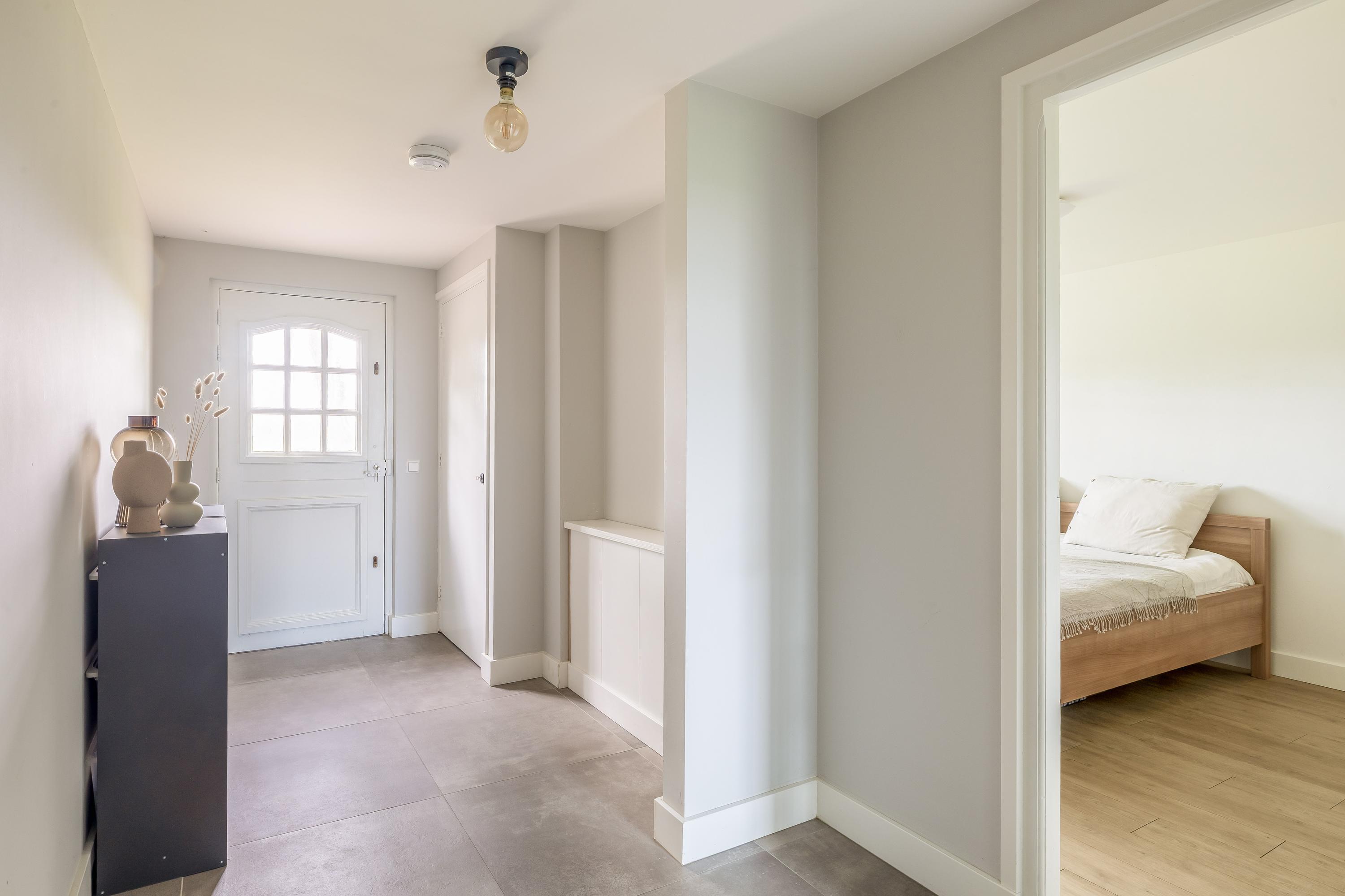The cosy living room, with its warm wooden parquet flooring and stucco walls, is a delightful space with plenty of natural light. The living room is directly connected to the kitchen-diner. The kitchen-diner is fitted with a cooking island and wall units and features all necessary appliances, including a Quooker, dishwasher, induction hob, oven and fridge. The modern tiled floor with underfloor heating and the sliding doors providing access to the covered terrace make this kitchen a pleasant and practical living space with views of the surrounding landscape. The utility room, toilet and storage room are accessible via the corridor. The utility room is practically laid out with washing appliances at a convenient height, storage space and additional facilities such as a fridge and combi-oven. The toilet is fitted with a wall-hung toilet and washbasin. The storage room has connections for installing a bathroom, making it easy to create a lifetime-proof layout.