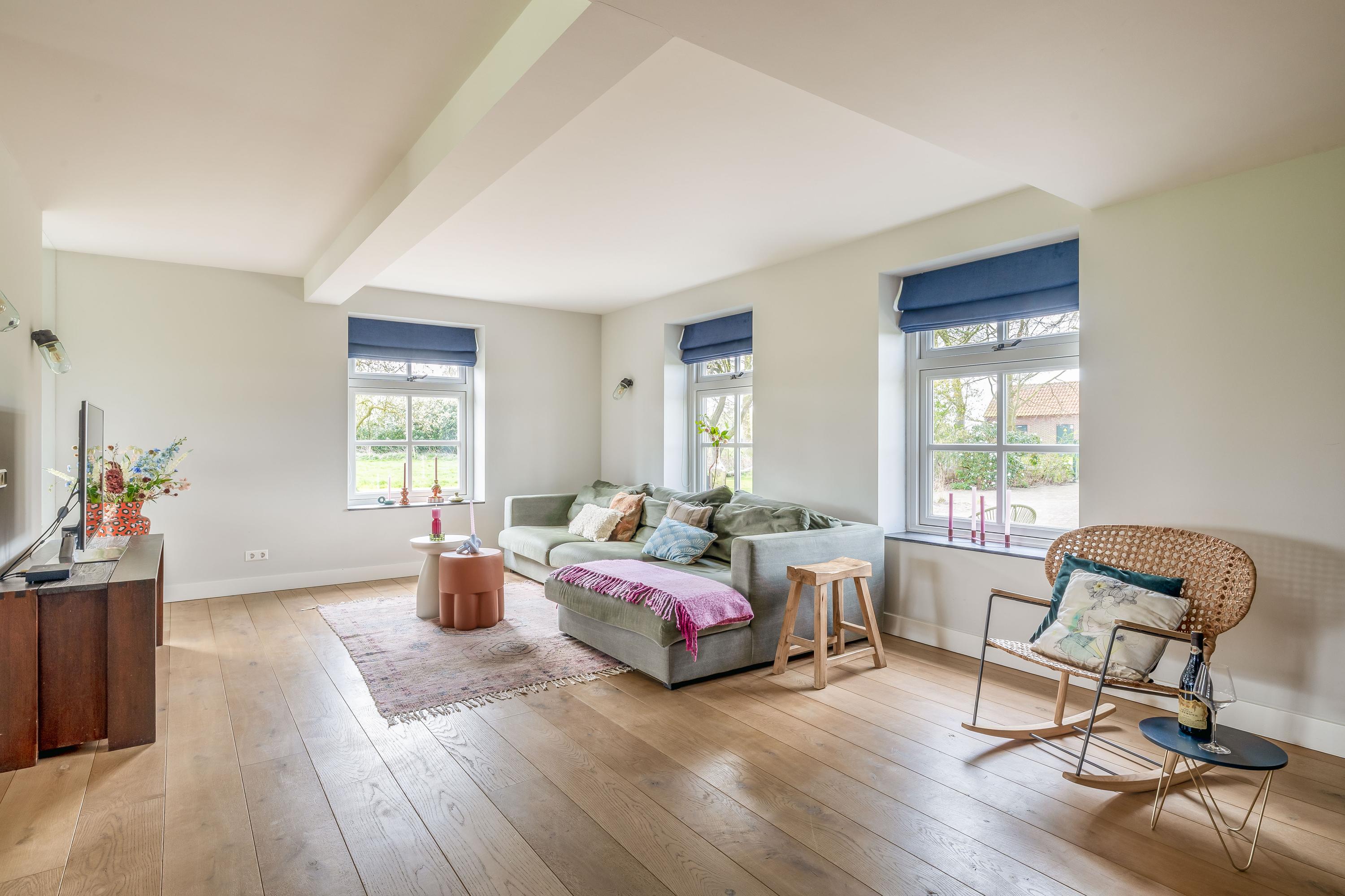 With a living area of 226 m², the property offers a comfortable and move-in ready living space. The living areas are spacious and light, flowing logically into one another. The layout is well thought-out, featuring, among other things, a kitchen-diner and a bedroom on the ground floor. Upstairs, there are three spacious bedrooms and a modern bathroom, where exposed timber structures contribute to the atmosphere and authentic character of the whole.
