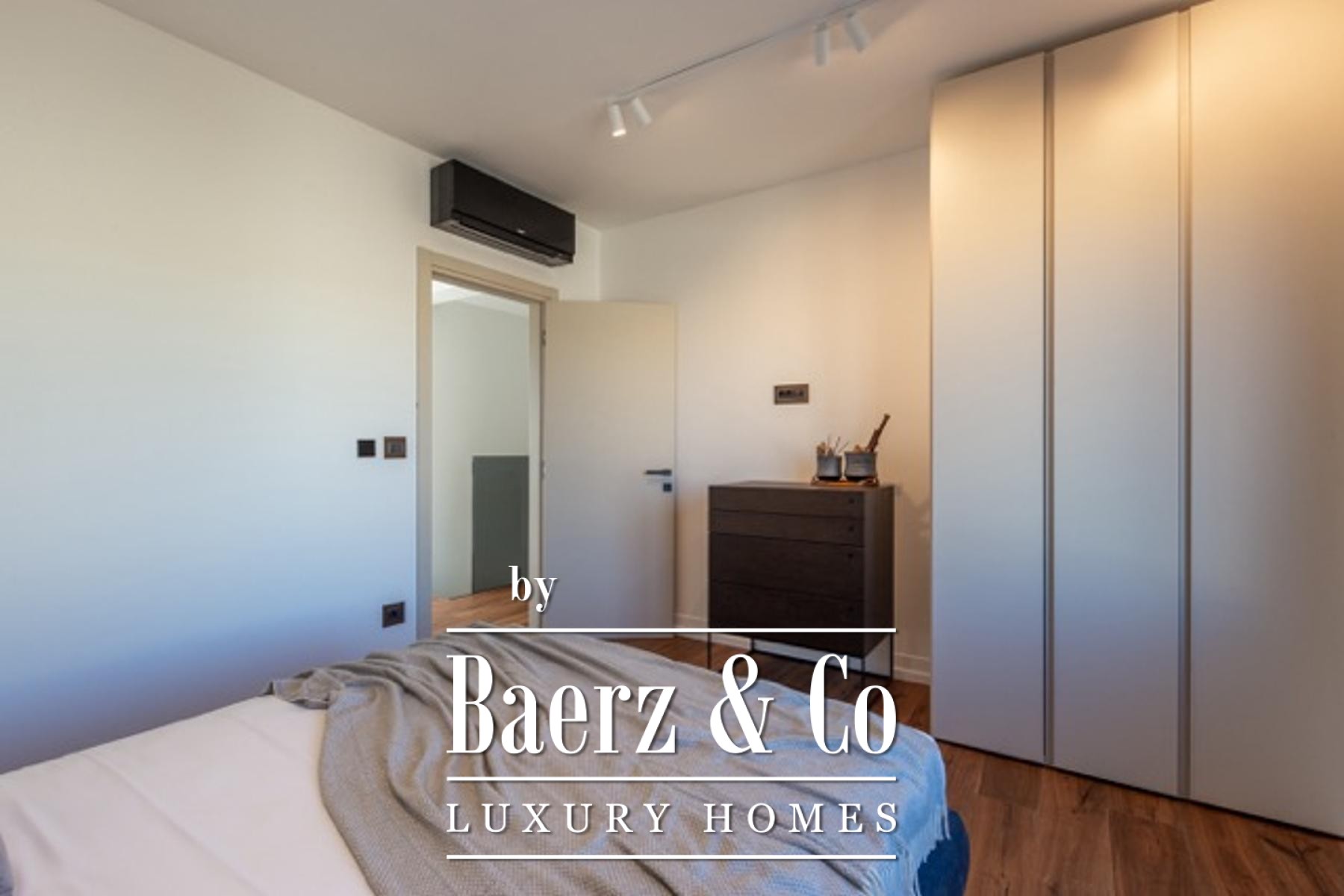 Entering the home, high ceilings and an open-concept living area evoke spaciousness and light. Floor-to-ceiling glass reveals views of a meticulously landscaped garden and a heated pool measuring 9.5 metres by 3.5 metres. The main level connects seamlessly to the outdoors, with automatic irrigation maintaining the serene courtyard environment. At the heart of the home is a glass staircase leading to three bedrooms, each with a dedicated modern bathroom. Two of the bedrooms open onto private terraces that provide a quiet setting for late afternoon retreat.