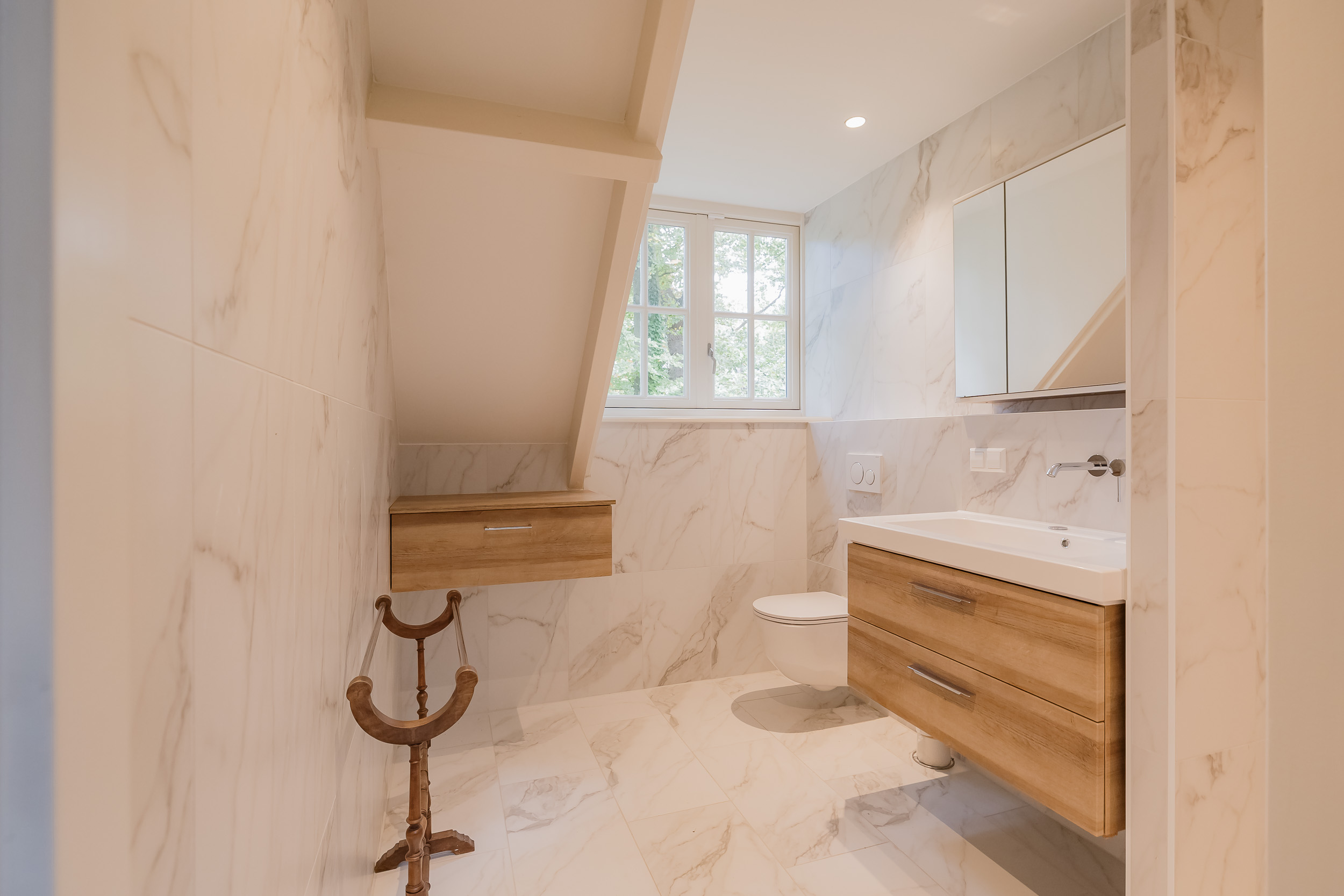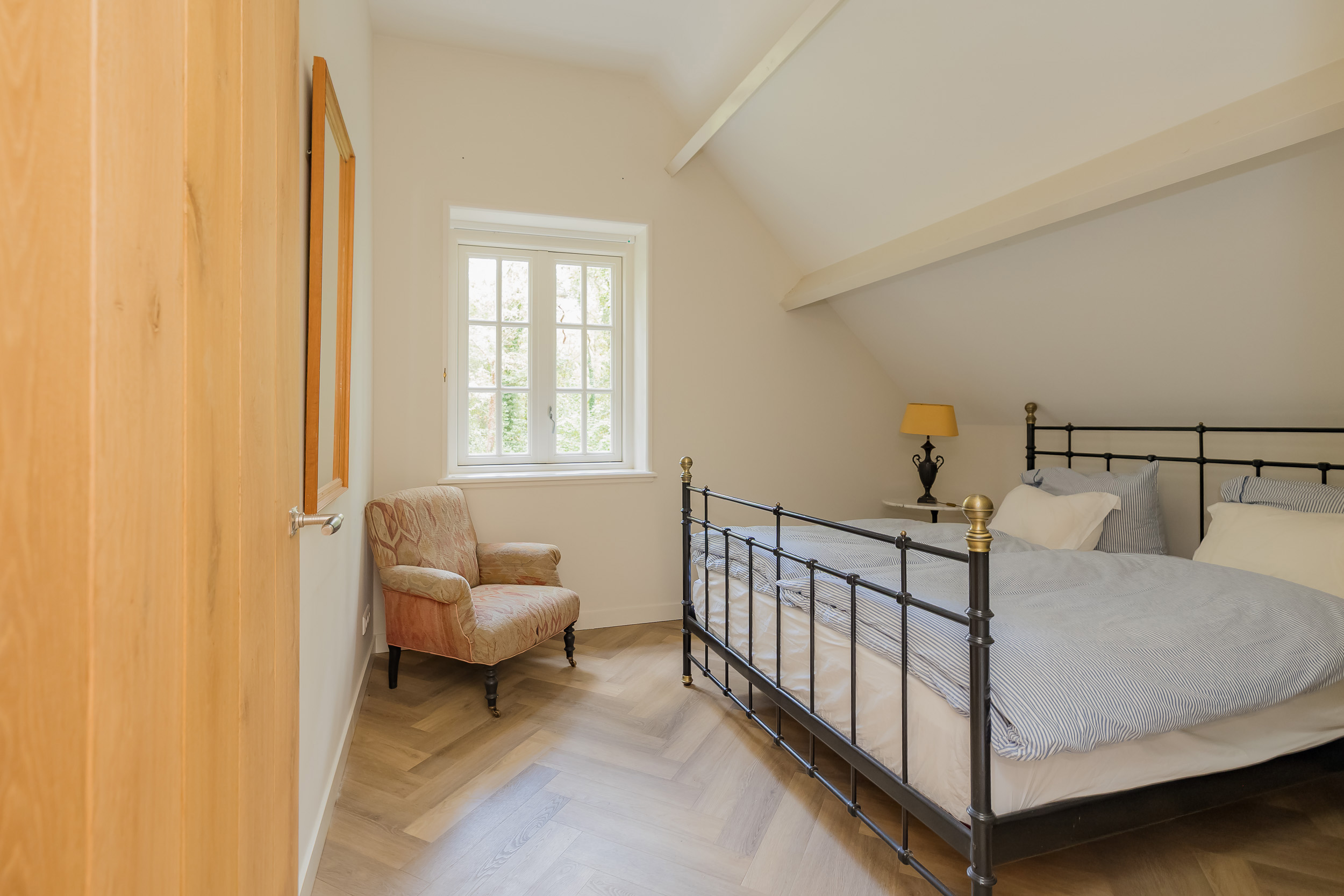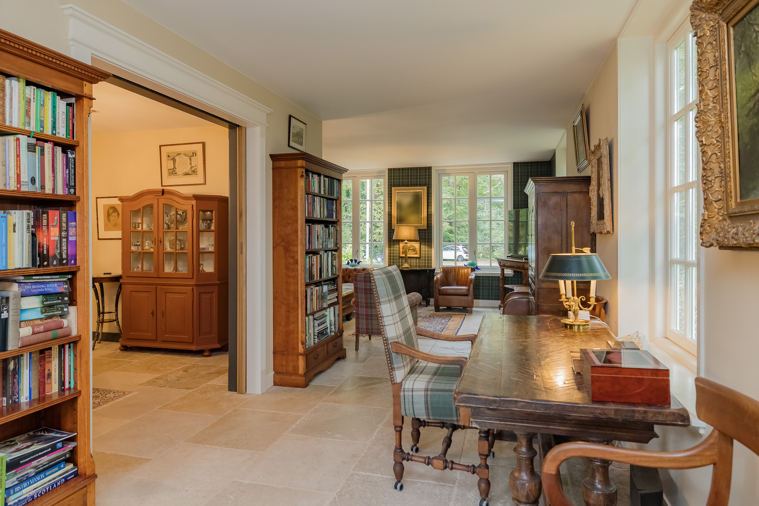 All rooms are accessible via the impressive central hall with its beautiful staircase and elevator. The bright living room is a wonderfully spacious place to enjoy the peace and quiet and the view, and offers direct access to the veranda. The fireplace and underfloor heating add to the atmosphere and comfort. At the front of the house is a cozy drawing room (or dining room) with a view of the forest. Between these rooms is a spacious workspace.