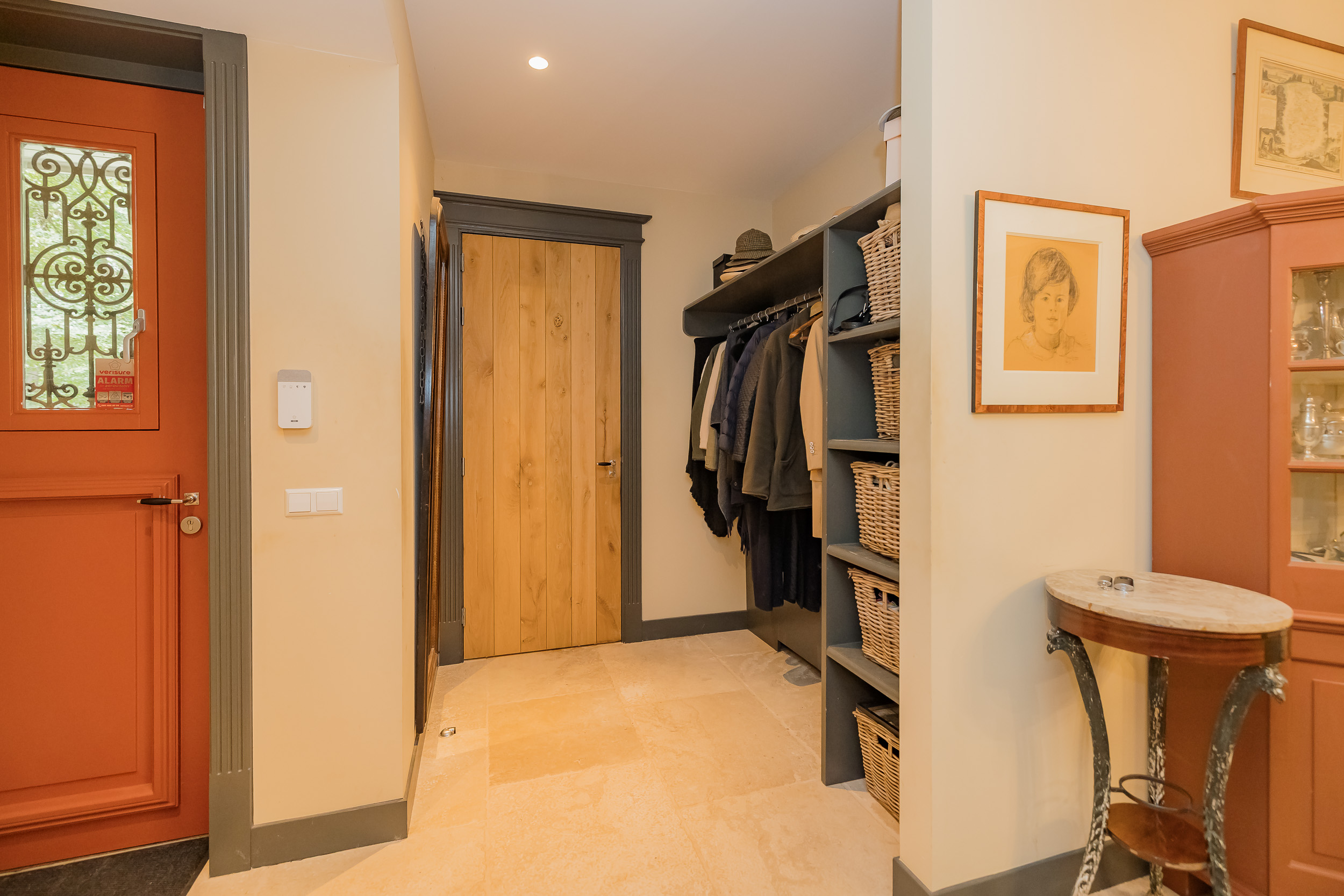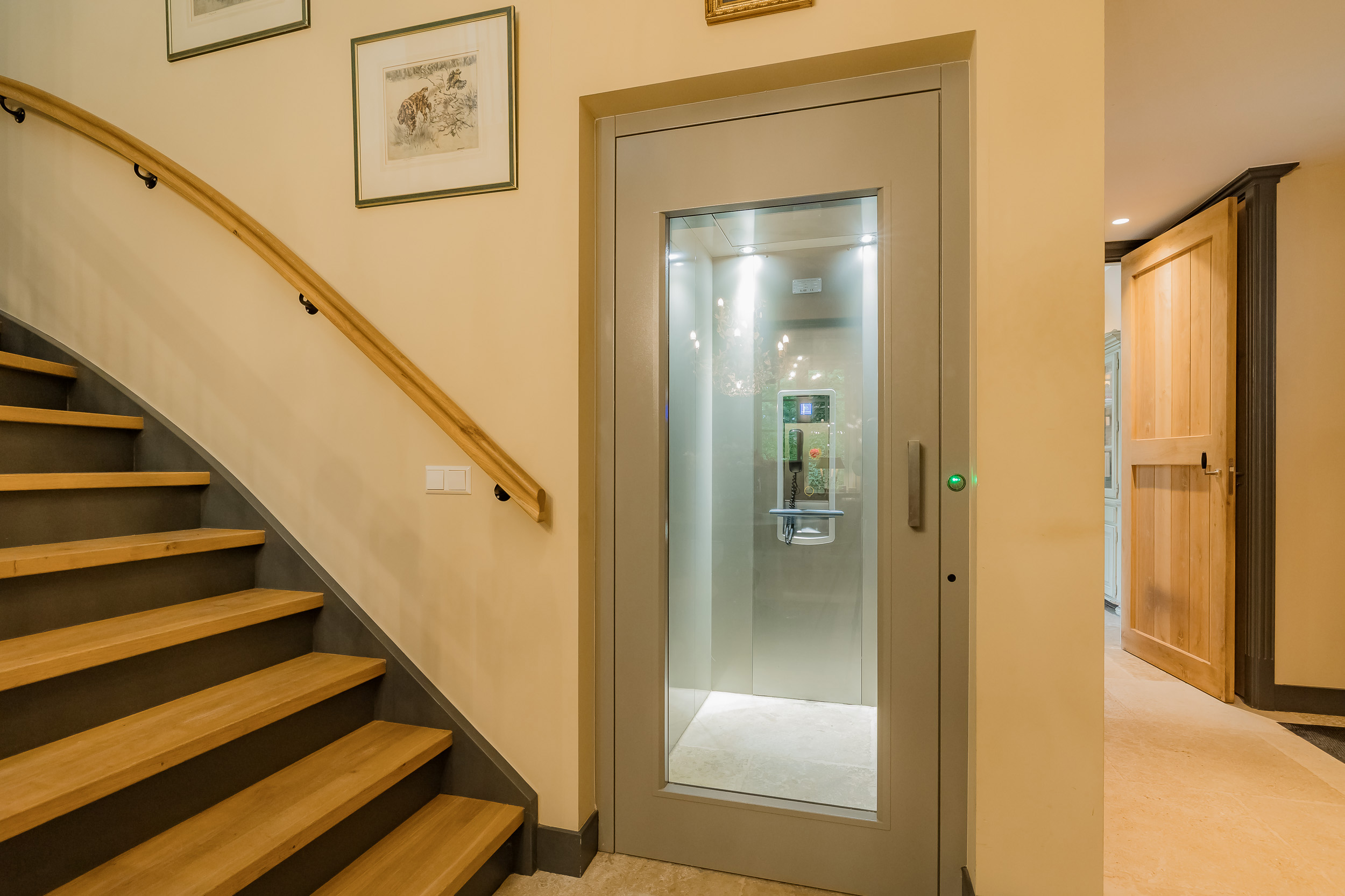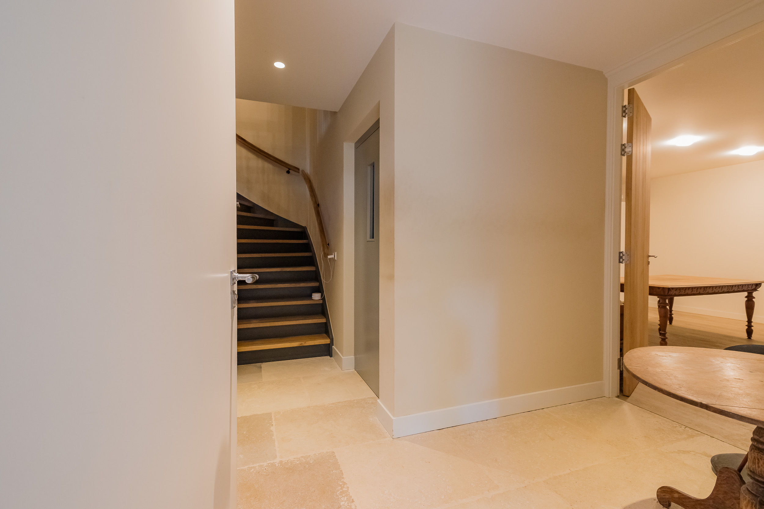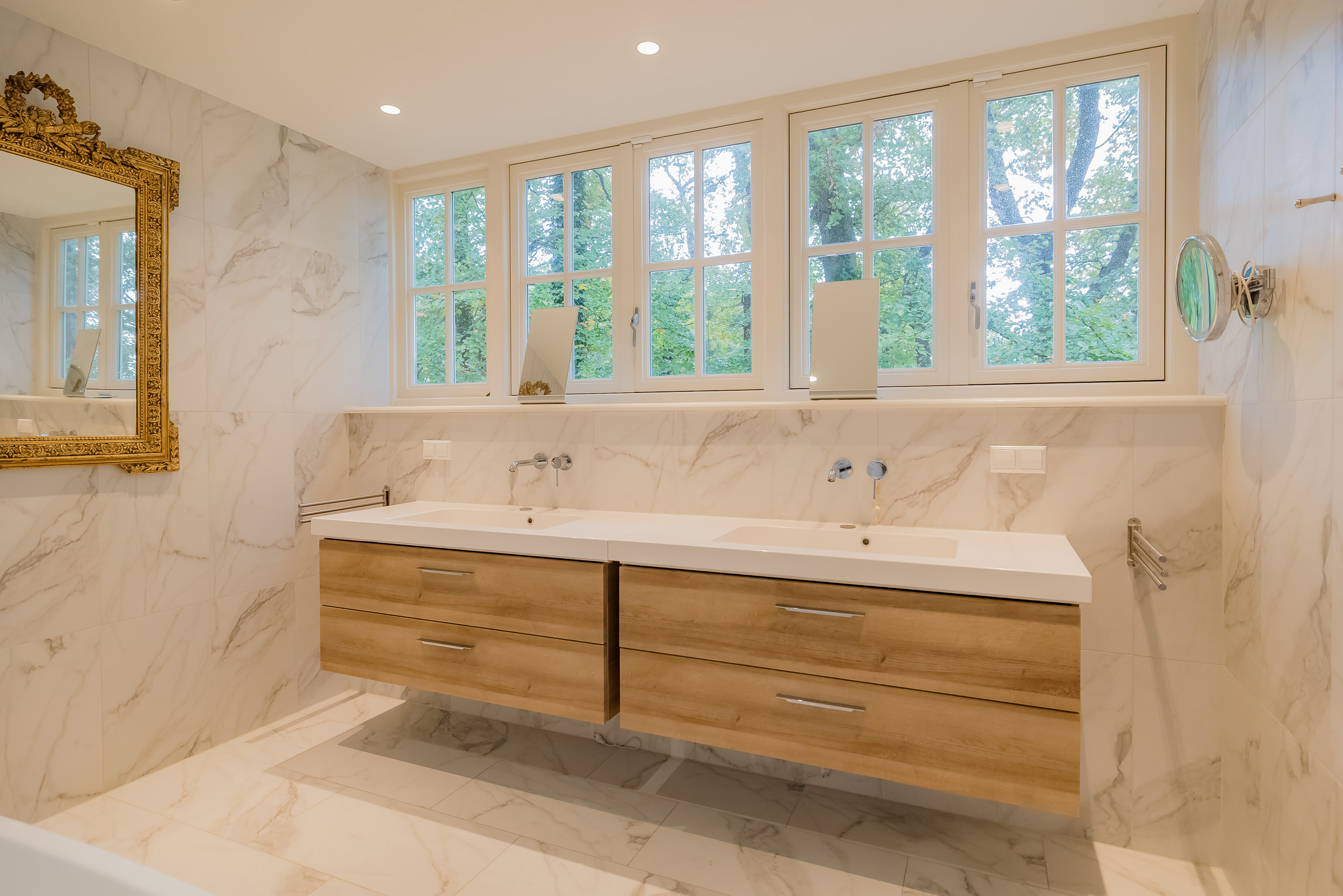 All rooms are accessible via the impressive central hall with its beautiful staircase and elevator. The bright living room is a wonderfully spacious place to enjoy the peace and quiet and the view, and offers direct access to the veranda. The fireplace and underfloor heating add to the atmosphere and comfort. At the front of the house is a cozy drawing room (or dining room) with a view of the forest. Between these rooms is a spacious workspace.